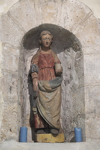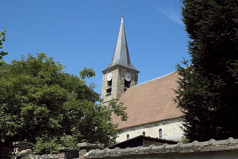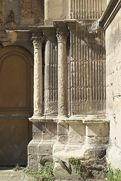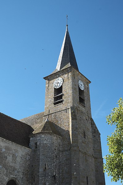 Le clocher-porche occupe la façade occidentale ; ses angles sont renforcés par de massifs contreforts à ressauts et il est coiffé d'une flèche couverte d'ardoises. Au rez-de-chaussée s'ouvre un portail en plein cintre couronné d'un fronton triangulaire, tandis que la partie supérieure présente sur les quatre faces des baies abat-son en plein cintre surmontées d'horloges. La façade comporte une baie en plein cintre à gauche et un oculus inséré dans une baie rectangulaire à droite ; une tourelle d'escalier est adossée dans l'angle gauche du clocher. Sur le côté nord de la nef, des chapelles de style Renaissance sont percées de grandes fenêtres à trois lancettes et dotées d'un portail encadré de pilastres, surmonté d'un oculus.