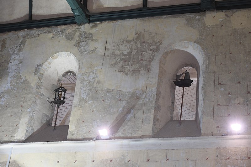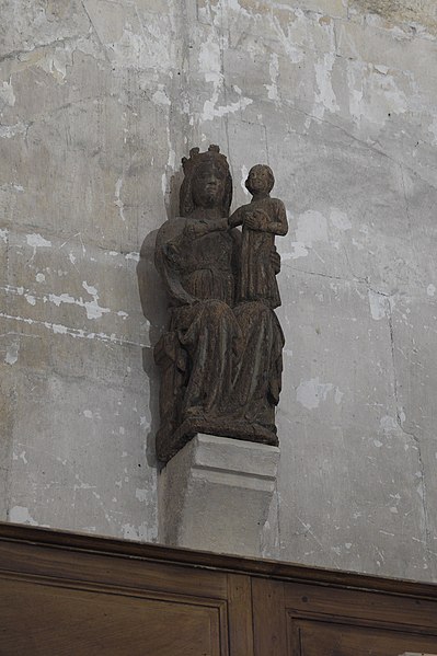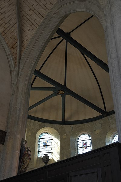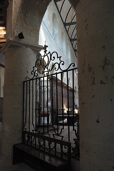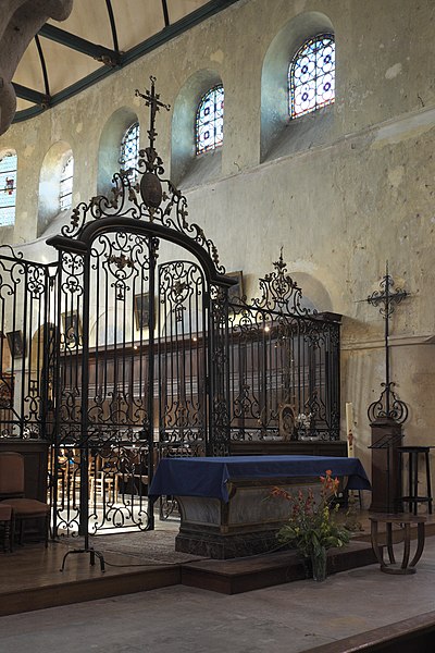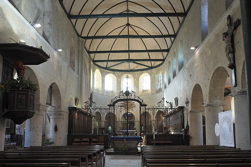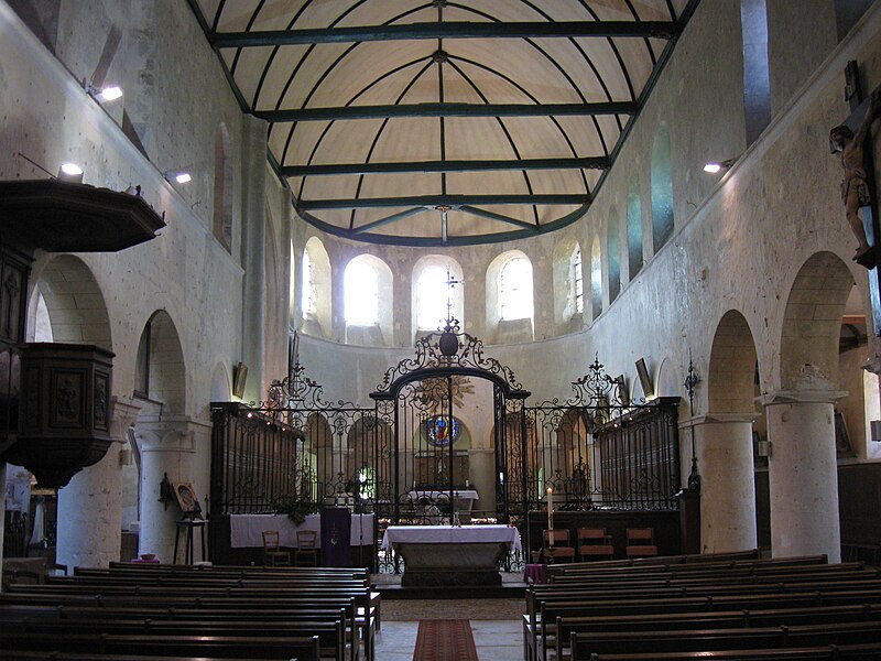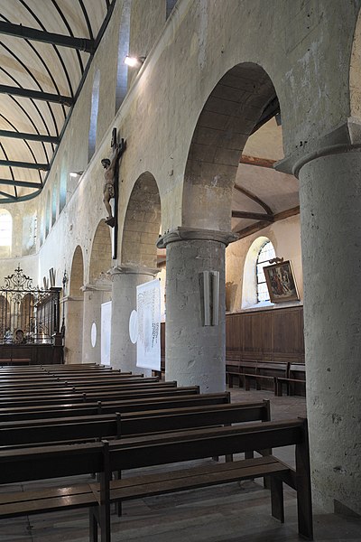 L'intérieur présente une nef à trois vaisseaux avec une élévation à deux niveaux ; le vaisseau central est couvert d'un berceau brisé en bois datant du XVe siècle. Les grandes arcades en plein cintre retombent sur des piles massives et laissent place, au-dessus, à des fenêtres hautes également en plein cintre. Les piles, le chœur semi-circulaire, le déambulatoire et les deux chapelles radiales datent du XIIe siècle et constituent les parties les plus anciennes de l'édifice ; la chapelle axiale a été ajoutée à la fin du XVIIIe siècle. Les chapelles latérales du côté nord datent du XVIe siècle.