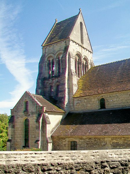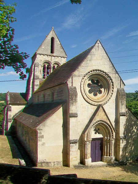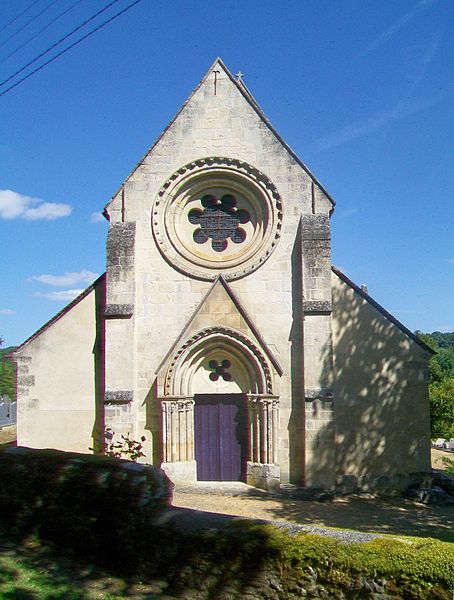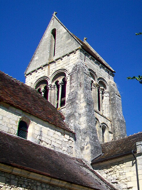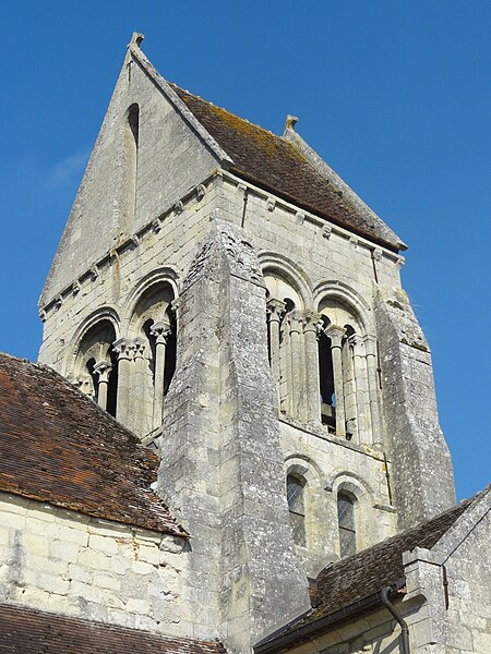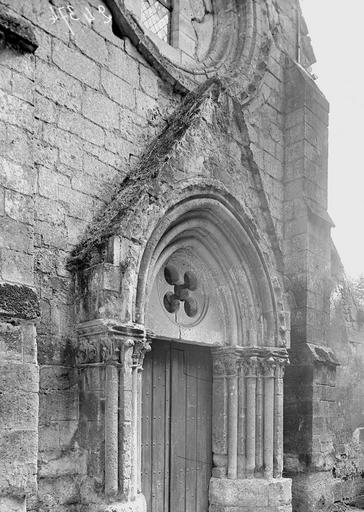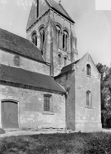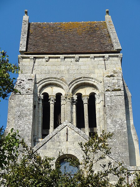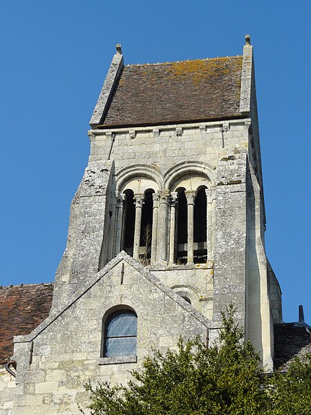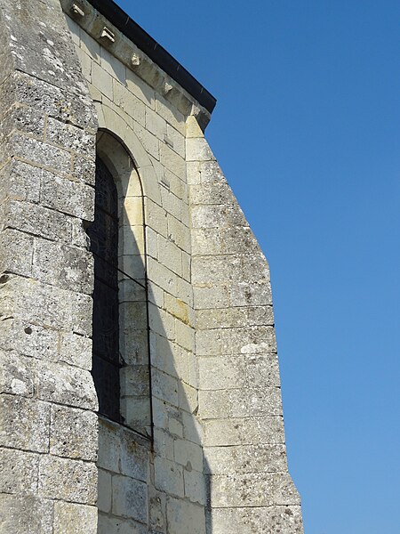 La façade occidentale se compose essentiellement du mur de la nef et se distingue par une grande rosace à six festons et un portail au tympan ajouré et aux archivoltes en tiers‑point, dont les moulures dialoguent avec celles des grandes arcades. Les murs gouttereaux des bas‑côtés sont aveugles et non contrefortés, l'appareil de moellons irréguliers restant apparent ; l'abside et le clocher sont pourvus d'une corniche de modillons et de contreforts saillants. Le clocher, de plan rectangulaire, présente sur chaque face deux baies géminées en plein cintre séparées par colonnettes à chapiteaux et couronnées par une corniche de modillons ; il comporte une salle haute au‑dessus du chœur dont la fonction reste inconnue et dont l'accès se fait par les combles de la sacristie.