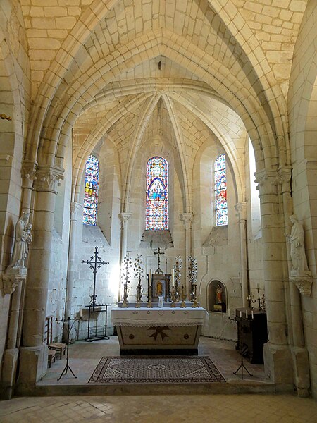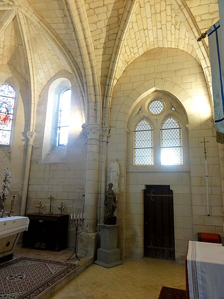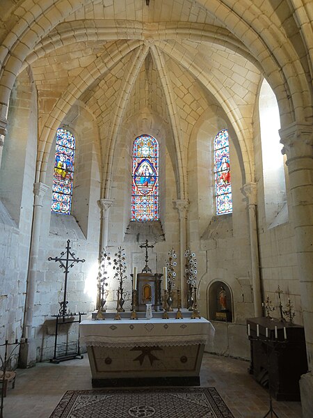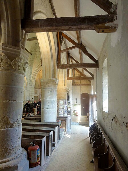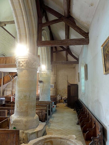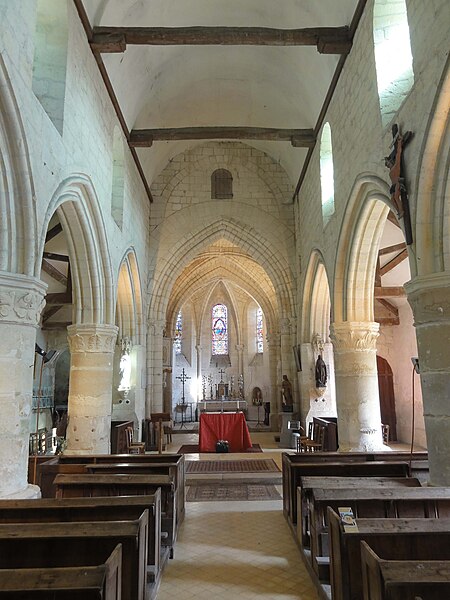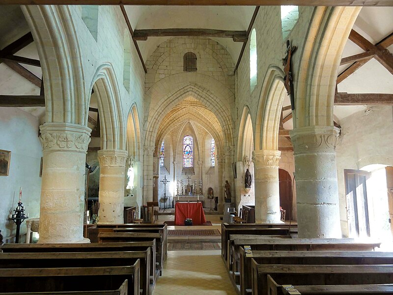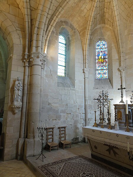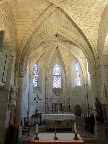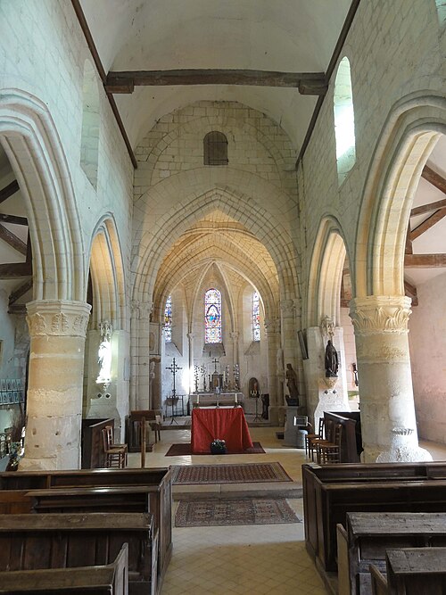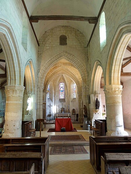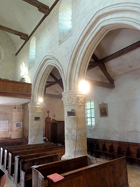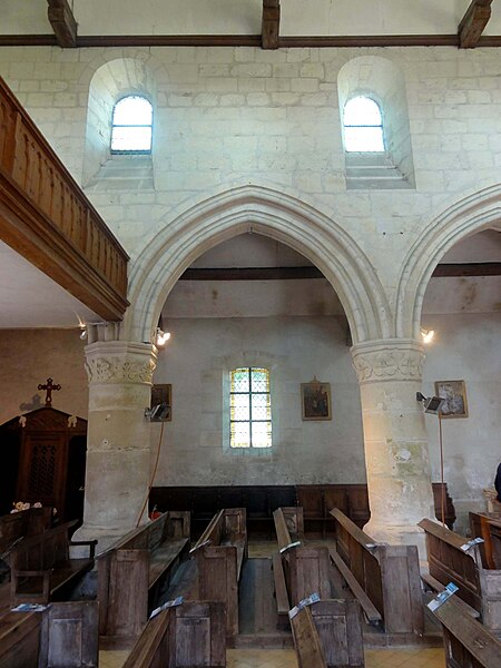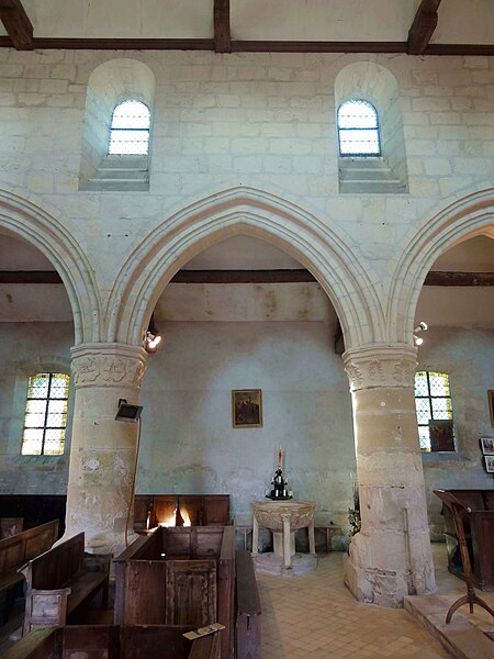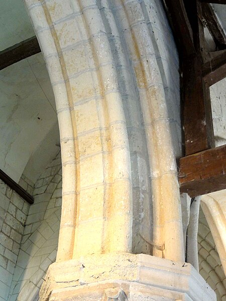Les chapiteaux, souvent décorés de feuilles stylisées (nénuphar, vigne, acanthe), peuvent paraître trapus mais montrent un travail régulier ; certaines bases et socles indiquent des réfections et des abaissements possibles du sol primitif. Le chœur conserve des supports appareillés, des chapiteaux de crochets et des ogives au profil en amande dont les clés sont de petites rosaces ; les fenêtres de l'abside, en plein cintre, sont plus hautes que celles de la nef. Les deux chapelles percées au premier quart du XIIIe siècle communiquent avec les bas‑côtés par des arcades en tiers‑point retombant sur des impostes moulurées ; la chapelle nord garde sa voûte tandis que la chapelle sud a été transformée en sacristie, et plusieurs culs‑de‑lampe représentent des bustes et têtes qui évoquent des masques mortuaires.
