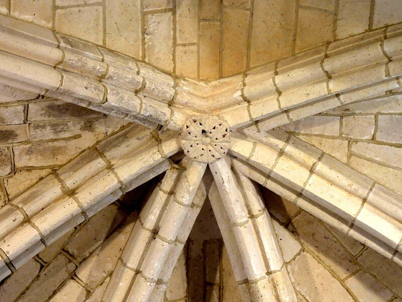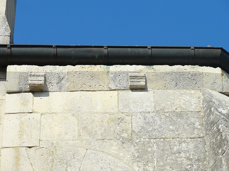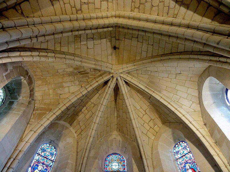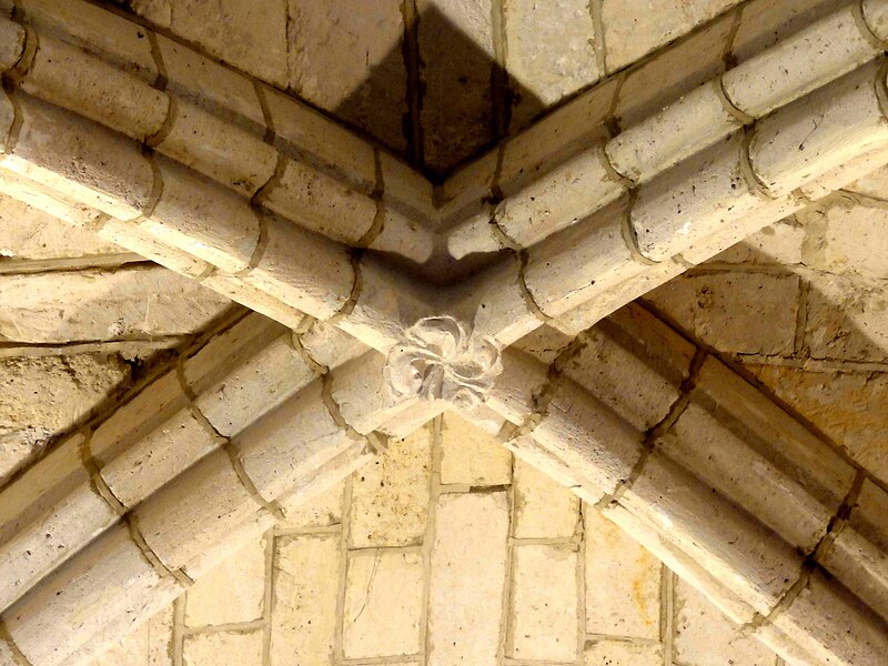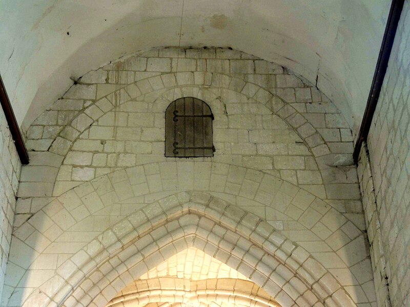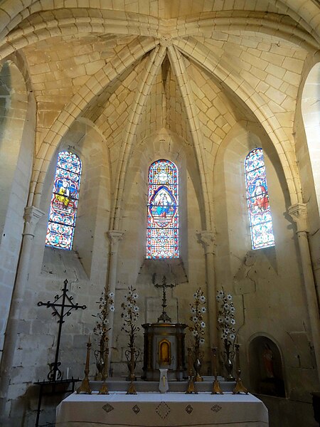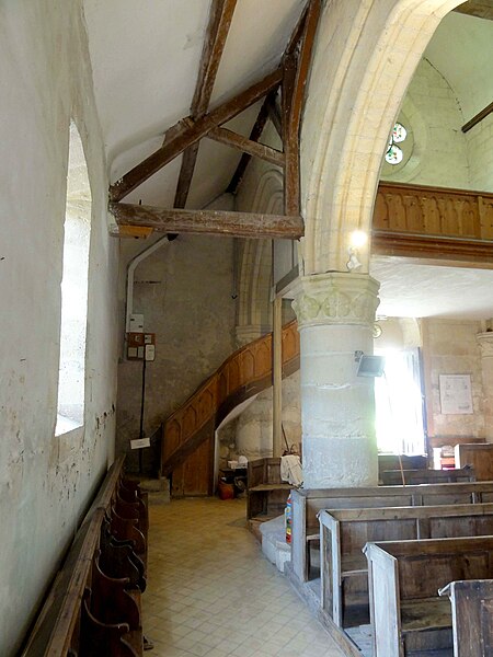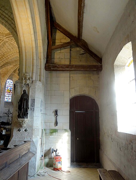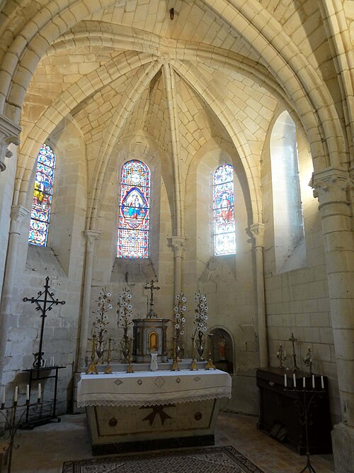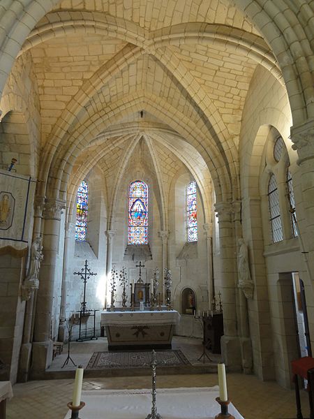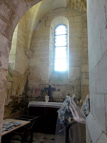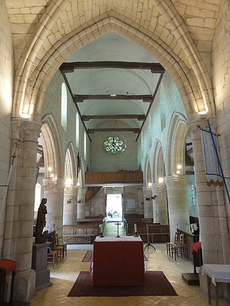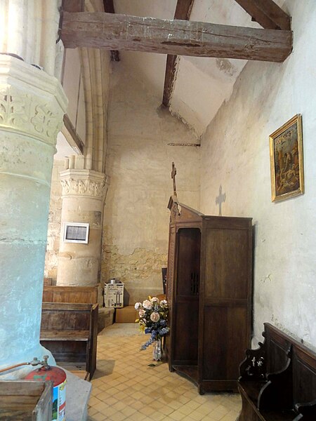 Les chapiteaux, souvent décorés de feuilles stylisées (nénuphar, vigne, acanthe), peuvent paraître trapus mais montrent un travail régulier ; certaines bases et socles indiquent des réfections et des abaissements possibles du sol primitif. Le chœur conserve des supports appareillés, des chapiteaux de crochets et des ogives au profil en amande dont les clés sont de petites rosaces ; les fenêtres de l'abside, en plein cintre, sont plus hautes que celles de la nef. Les deux chapelles percées au premier quart du XIIIe siècle communiquent avec les bas‑côtés par des arcades en tiers‑point retombant sur des impostes moulurées ; la chapelle nord garde sa voûte tandis que la chapelle sud a été transformée en sacristie, et plusieurs culs‑de‑lampe représentent des bustes et têtes qui évoquent des masques mortuaires.
