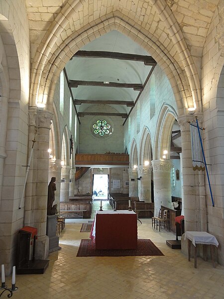 Le plan répond à une croix symétrique rendue irrégulière par la transformation de la chapelle sud en sacristie : une nef non voûtée de quatre travées accompagnée de deux bas‑côtés, un chœur de deux travées avec abside à cinq pans et deux chapelles latérales qui forment la croisée du transept. Seuls le chœur et les chapelles sont voûtés d'ogives ; la nef est couverte d'une fausse voûte en berceau de bois plâtré et s'ouvre par de grandes arcades en tiers‑point moulurées. Les élévations latérales présentent deux niveaux — grandes arcades et fenêtres hautes — ; les fenêtres de la nef, étroites et fortement ébrasées, s'ouvrent au‑dessus d'un glacis à gradins et témoignent d'une économie de hauteur. L'arc triomphal, plus haut et plus large que les grandes arcades, retombe sur des faisceaux de colonnettes et met en évidence la différence de niveau entre la nef et le chœur ; au‑dessus se trouvent des arcs de décharge et une porte donnant accès à la salle haute du clocher.