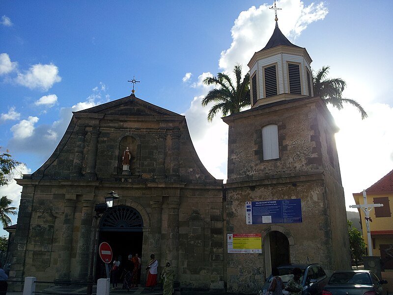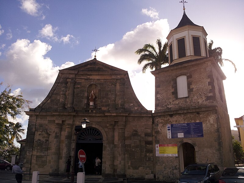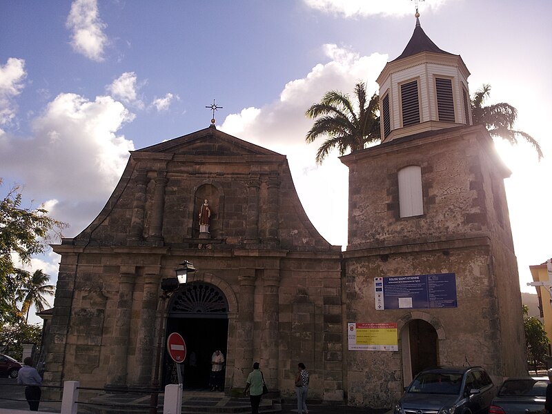 La façade principale, de style jésuite, est en pierre de taille et présente deux ordres toscans superposés couronnés d’un fronton triangulaire ; les ailes sont cantonnées de pilastres à bossages et le portail est surmonté d’un tympan en bois ajouré et peint, tandis qu’une niche abrite la statue de saint Étienne. Le clocher est séparé du corps de l’édifice et se caractérise par un beffroi octogonal en bois d’Inde provenant du Morne-Gommier.