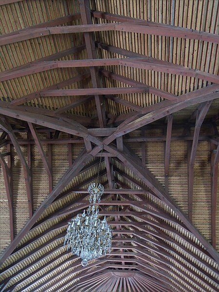 L’église suit un plan en croix latine : une nef centrale se termine par un chœur hémicirculaire, encadré par deux chapelles latérales, et un transept constitué de bras prolongés par une chapelle à chaque extrémité. La voûte intérieure, réalisée par des charpentiers de marine, évoque la carène renversée d’un bateau. Au fond de la nef, le maître-autel en marbre blanc incrusté de marbres colorés, près duquel repose le père fondateur, retient l’attention ; il porte un bas-relief représentant la Cène. Selon une légende rapportée, cet ouvrage était destiné à la cathédrale de Lima mais fit naufrage avant d’être acquis grâce à un legs de 6 000 livres fait en 1769 par François Cornet, qui avait également offert à la paroisse deux statues, de la Vierge à l’Enfant et de saint Étienne. Le cimetière paroissial, situé en contrebas de l’église, domine la baie du Cul-de-Sac Marin.