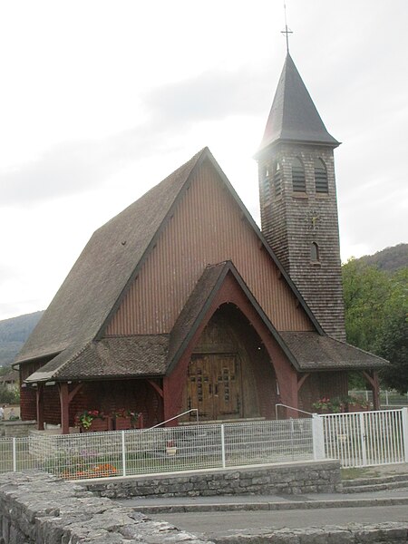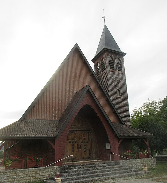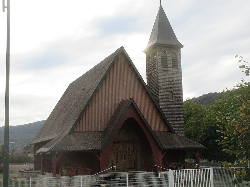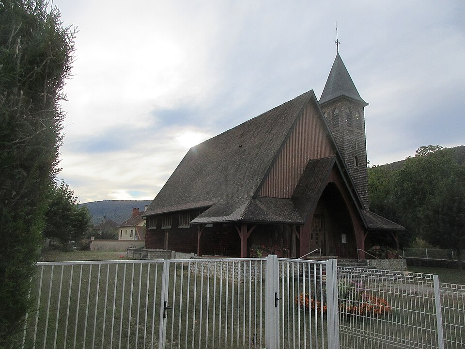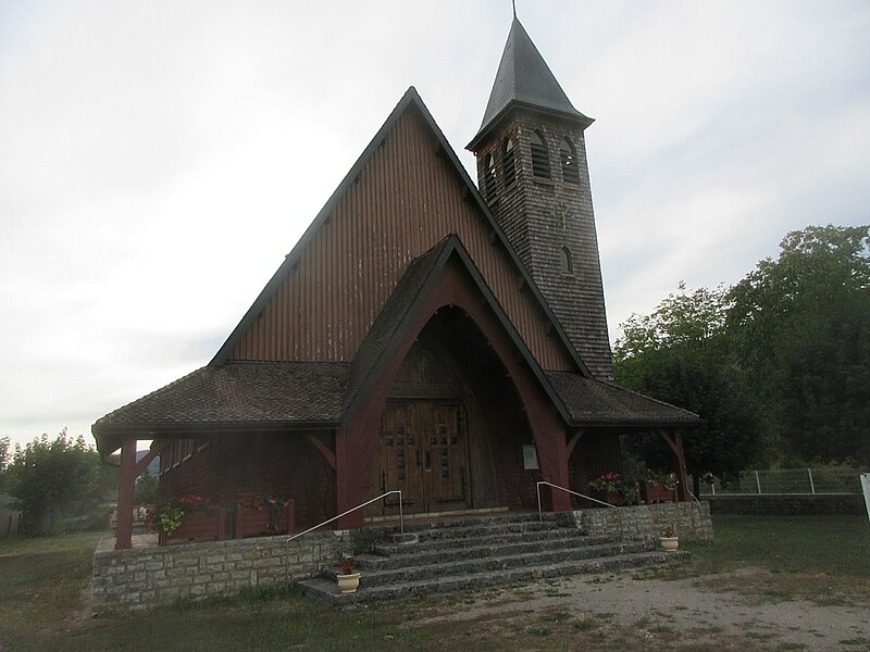 L'ancienne église fut partiellement détruite en juillet 1944 par les Allemands. Les dommages de guerre ne permirent pas de financer une reconstruction, l'édifice ayant partiellement échappé au sinistre et la commune n'en ayant pas les moyens. Lors de sa visite à l'Exposition internationale du bois à Lyon en 1951, Edgar Faure, ministre du Budget et conseiller général du Jura, demanda à la Chambre nationale des industries du bois de faire don de cette église à la commune. L'édifice fut réalisé en soixante-dix jours et exposé à Bois-sur-Rhône par les établissements Chalos et Fils de Saint-Brieux. Les dix-sept essences utilisées pour la construction furent offertes par des fédérations et des producteurs français, ainsi que par des importateurs et des commissionnaires de bois exotiques. Démontée puis transportée de Lyon à Lavancia, elle fut remontée en trois semaines sur son site actuel en février 1952 et inaugurée le 22 juin 1952. En 1965 des travaux de peinture et de couverture furent entrepris pour la rénover. En 1995 le pignon et le clocher furent recouverts de bardeaux de thuya géant en provenance de Colombie.