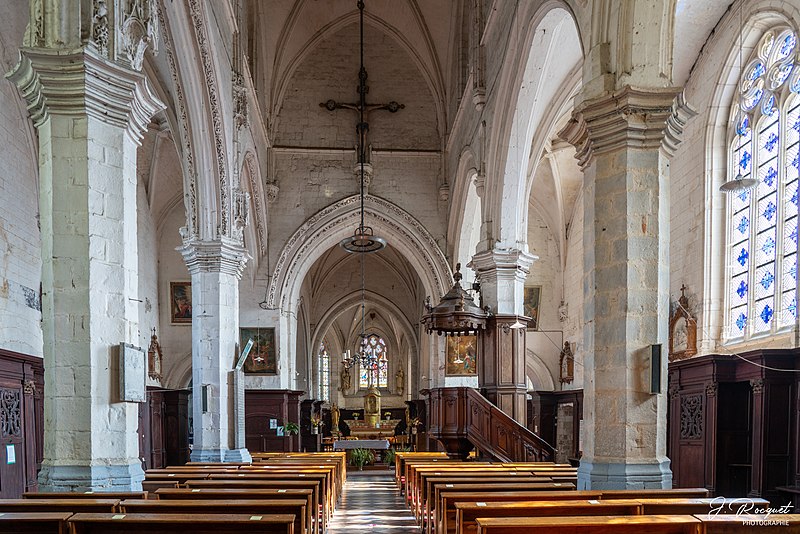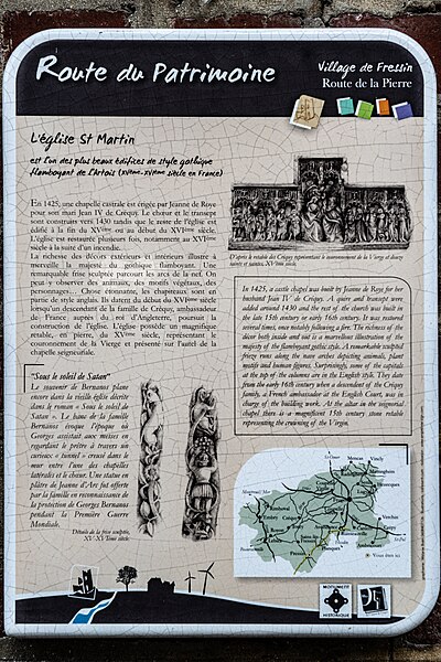 L'église Saint-Martin de Fressin se situe au 26 Grand Rue, au cœur du village et à proximité du cimetière communal ; elle dépend de la paroisse Saint-Pierre et Saint-Paul de Fruges, dans le diocèse d'Arras. L'édifice actuel date du XVIe siècle, bien qu'un lieu de culte existât à Fressin dès le Moyen Âge ; sa construction fut entreprise à l'initiative de Jean V de Créquy, seigneur du lieu, dont le château voisin remonte à la même période. Le style témoigne de la transition entre le gothique flamboyant et les premières influences de la Renaissance, et, selon l'abbé Fromentin, l'église fut conçue pour servir de lieu de prestige à la famille seigneuriale, avec une chapelle dédiée et des décors soignés. L'édifice a subi des incendies au XVIe siècle et a été restauré à cette époque puis au XIXe siècle. Les vitraux actuels datent du XIXe siècle et remplacent ceux détruits pendant la Révolution. Classée au titre des monuments historiques par arrêté du 11 septembre 1906, l'église mesure 32 mètres de longueur, 18 mètres de largeur au niveau du transept et la nef atteint 14 mètres de hauteur. Elle présente trois nefs en quatre travées, flanquées de chapelles latérales dans le transept, et est soutenue par six piliers octogonaux à chapiteaux. Le clocher, de dimensions modestes au regard du volume de l'édifice, se situe entre le chœur et la nef principale et est bordé de quatre clochetons. Le portail méridional comporte deux portes séparées par un pilier, sous une arcade ogivale surmontée d'un pignon rectangulaire. Le mobilier liturgique comprend un autel en pierre, une frise sculptée le long des arcs de la nef illustrant le style gothique flamboyant, des statues de saints, de nombreuses peintures et une chaire en bois sculpté du XVIIIe siècle.