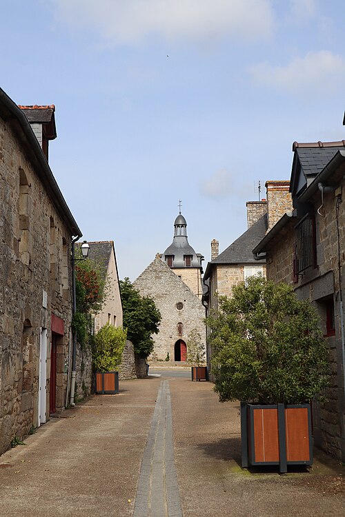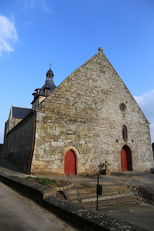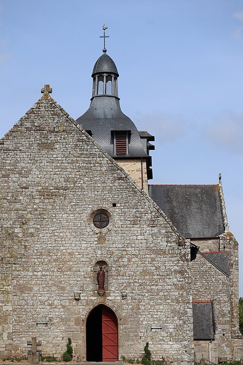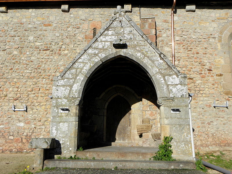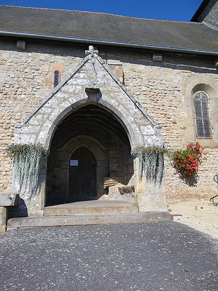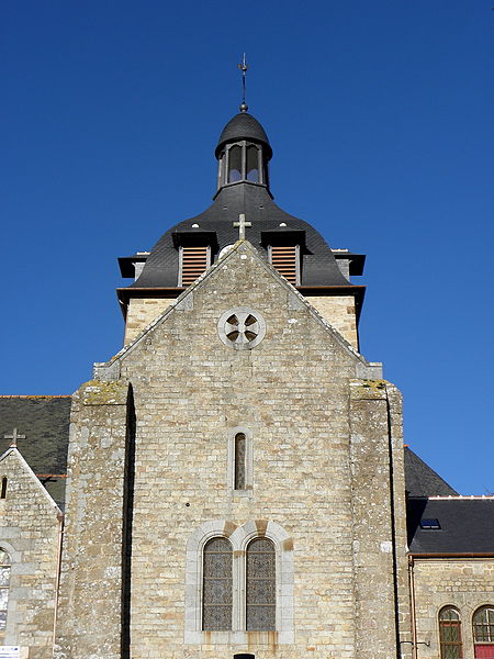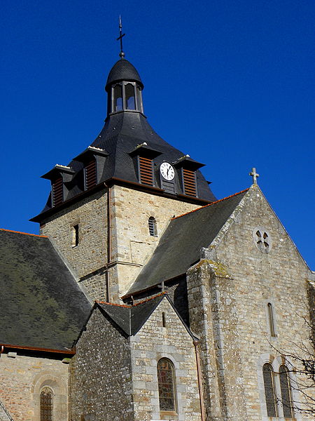 L'édifice, imparfaitement orienté, mesure extérieurement trente‑cinq mètres sur vingt et adopte un plan en croix latine comprenant une nef prolongée par un transept, une tour‑clocher sur la croisée et un chœur terminé par une abside arrondie ; un collatéral nord est accolé à la nef depuis la fin du XVe siècle et le XIXe siècle a ajouté deux constructions de part et d'autre du bras sud du transept servant de sacristies. La façade occidentale, reconstruite en 1801, réunit sous un même pignon la nef et le collatéral et s'ouvre par deux portes : une ogivale pour la nef et une autre, ornée d'un arc de style Renaissance, donnant sur le collatéral. Le mur méridional de la nef présente, dans sa majeure partie, un appareil du premier âge roman avec opus spicatum et est contreforté par trois éléments minces ; une porte méridionale, précédée d'un porche et réaménagée aux XVe–XVIe siècles, permet l'accès. Le chevet, en gros appareil régulier, est renforcé par quatre contreforts et percé de cinq baies en plein cintre sans moulure ; l'élévation orientale du transept porte les traces d'arrachement des absidioles et chaque angle extérieur du transept est raidit par un contrefort plat. Le mur gouttereau nord, moins haut que le sud, correspond au collatéral du début du XVIe siècle. Une tour carrée basse sur la croisée est coiffée d'un toit en forme d'impériale depuis la restauration du début du XIXe siècle ; l'édifice est couvert en ardoise sur charpente et n'est voûté que dans la partie du chœur.