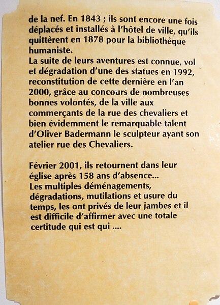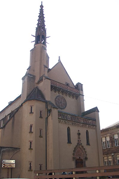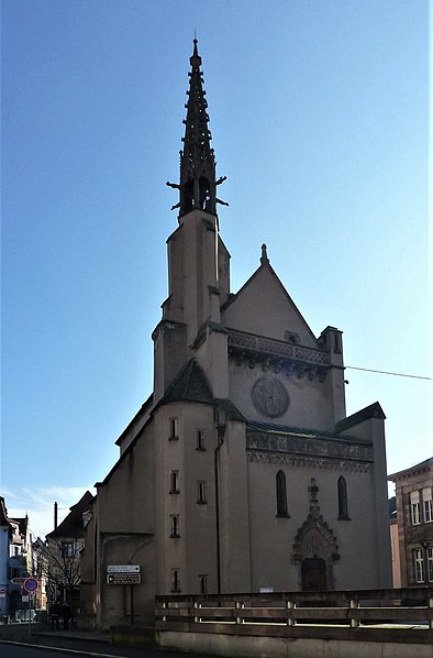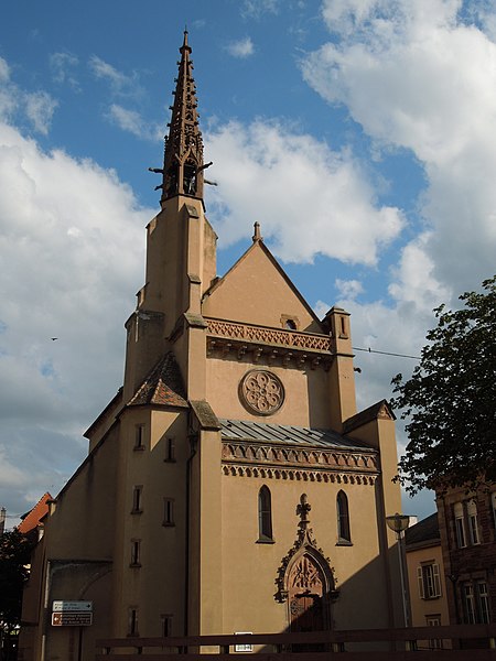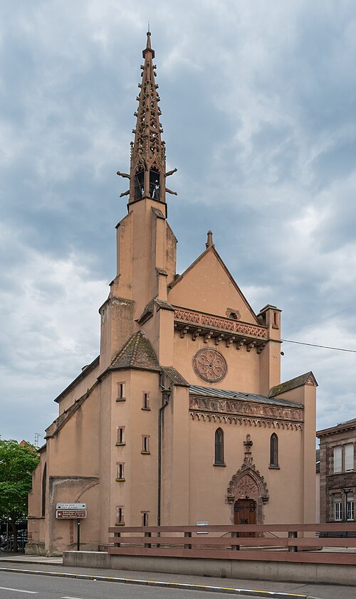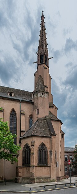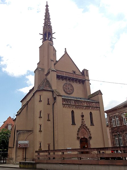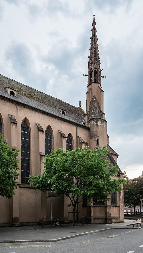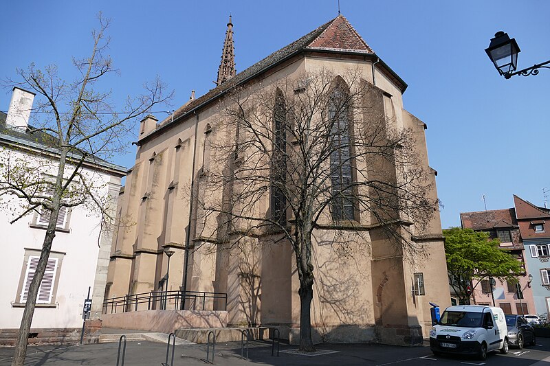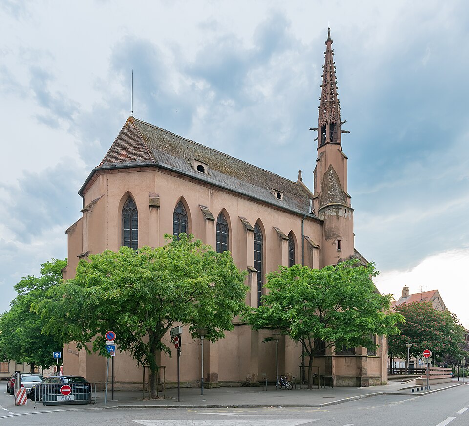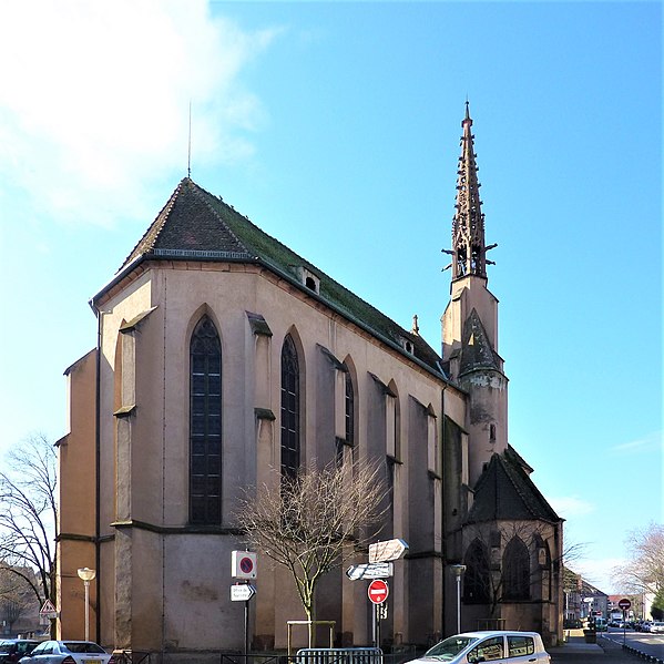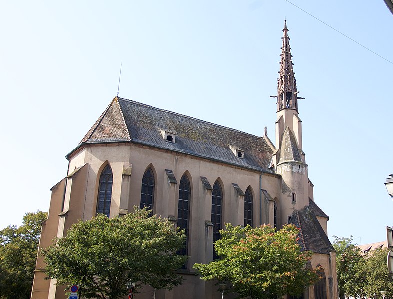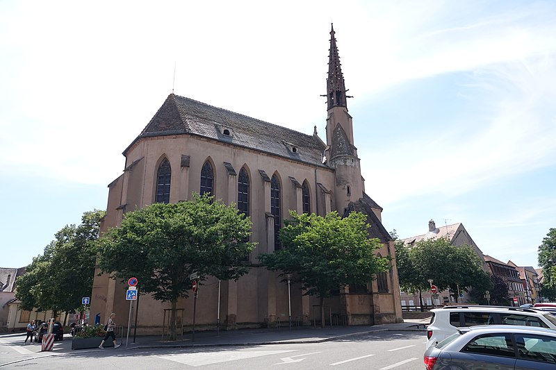 Le couvent des franciscains de Sélestat a été fondé en 1280 ; dès 1281 est construit le chœur de l’église, accompagné d’une sacristie voûtée. La nef et les bâtiments conventuels datent du début du XIVe siècle, et la porte provisoire du chœur est alors déplacée dans le mur nord du bas-côté nord. Une chapelle latérale nord dédiée à la Vierge aurait été élevée vers 1330, puis, vers 1430, une flèche en pierre ajourée est ajoutée au clocher juxtaposé au mur nord du chœur. En 1522 une chapelle édifiée contre le bas-côté nord abrite trois monuments funéraires des frères de Rathsamhausen ; cette chapelle est détruite au XVIIe siècle et les monuments sont transférés à l’hôtel de ville, puis au musée. Le couvent est fermé en 1525, rendu par la ville aux récollets en 1619 qui l’occupent jusqu’à la Révolution, et l’église fait l’objet d’importantes restaurations au XVIIIe siècle. Fermé en 1791 et acheté par la ville en 1810, l’ensemble sert ensuite de magasin de fourrage pour l’armée. En 1876 les protestants demandent la mise à disposition de l’édifice ; la nef, en très mauvais état, est démolie en 1878 avec la sacristie, tandis que le chœur est restauré par l’architecte communal Jean-Jacques Stamm qui reconstruit la façade ouest. Le temple est inauguré en 1881 et reçoit un mobilier néo-gothique réalisé par Théophile Klem de Colmar. Le campanile ajouré est restauré en 1978 et le tympan ouest sculpté par Martine Lutz de Colmar en 1979. Située place du Marché aux Pots et rue de Verdun à Sélestat (Bas-Rhin), l’ancienne église des Franciscains, devenue église protestante, est inscrite au titre des monuments historiques depuis 1983.