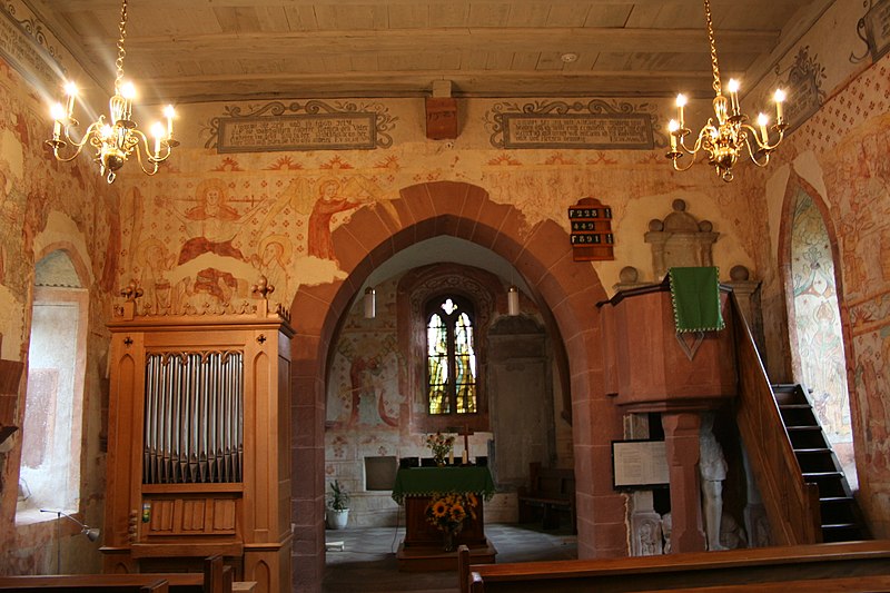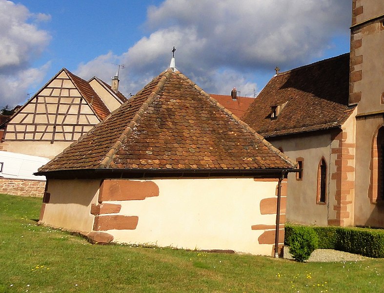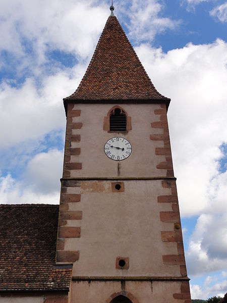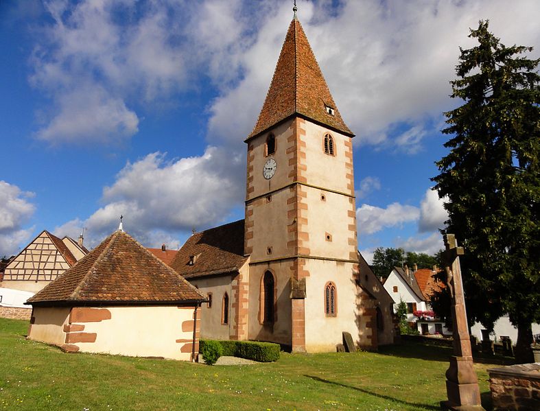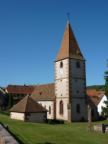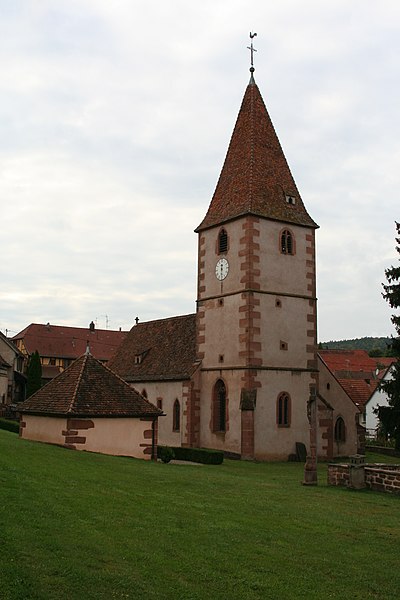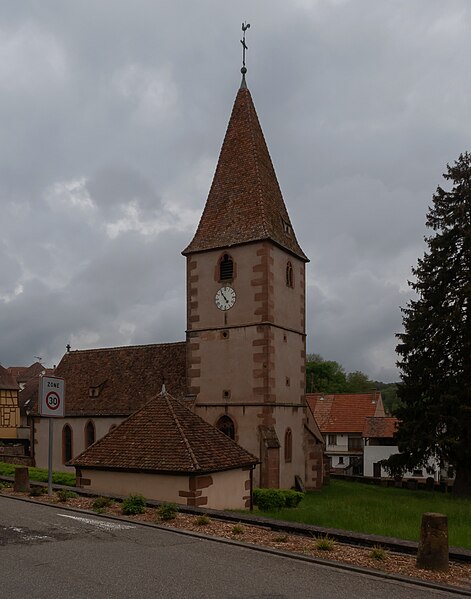 L'édifice se situe à la sortie du village, au cœur d'un enclos qui rappelle l'ancien cimetière et conserve l'ossuaire ; le village lui-même s'est déplacé vers le haut du massif rocheux après la disparition du château au cours de la guerre de Trente Ans. L'église est bâtie en grès et moellons enduits ; la tour-chœur, de plan carré et répartie sur trois niveaux, est couverte d'un toit en pavillon. La nef, plus large, s'appuie contre le mur ouest de la tour et s'ouvre par des fenêtres gothiques de disposition irrégulière ; une porte nord a été murée et le portail ouest paraît remanié. À l'intérieur, la voûte d'ogives du chœur remplace un plafond à solives et masque la partie supérieure des peintures murales. Les murs romans portent un ensemble de fresques du début du XVe siècle : le mur nord retrace la Création et les tribulations de l'homme, le mur sud est consacré au Christ sauveur, et, dans le chœur, il ne subsiste au-dessus de l'arc triomphal que le registre inférieur. L'église conserve aussi les tombeaux de quatre membres de la famille de Fleckenstein-Dagstuhl : Jean (d. 1552), Jörg (d. 1553), Henri (d. 1561) et Louis (d. 1577). Enfin, la paroisse est membre de l'Union des Églises protestantes d'Alsace et de Lorraine (UEPAL) et fait partie de l'ensemble dit « Paroisses des Cinq Clochers » aux côtés des églises de Weinbourg, Sparsbach, Erckartswiller et Obersoultzbach.