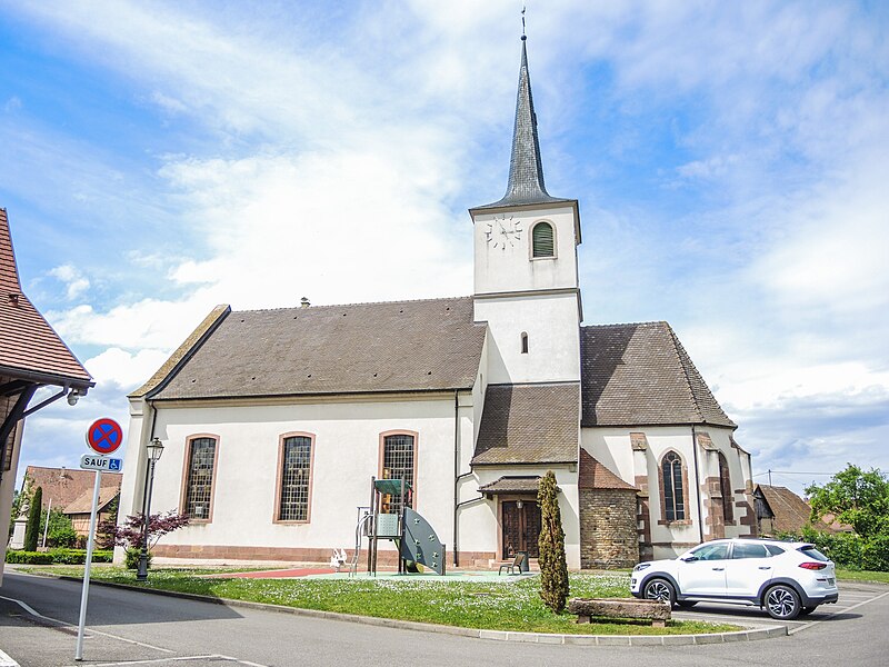 L'église protestante Saint‑Martin, située à Jebsheim dans le Haut‑Rhin, est un monument historique inscrit depuis 1996 pour les parties antérieures au XXe siècle, les verrières et les vestiges des baies de la tour. La paroisse est membre de l'Union des Églises protestantes d'Alsace et de Lorraine. L'édifice est attesté dès 891, date à laquelle il fut offert par le roi Arnulf au chapitre de la cathédrale de Spire, et conserve des vestiges allant de l'époque carolingienne à nos jours, même si l'on ne peut préciser si les parties les plus anciennes datent du IXe ou du XIe siècle. Le sanctuaire a été reconstruit au XIIe siècle : la façade ouest et les parties basses de la tour d'avant‑chœur subsistent, et le rez‑de‑chaussée de la tour reçut une voûte d'ogives au cours du second quart du siècle. À la même époque la nef, initialement composée de trois vaisseaux, fut réunifiée en une nef unique et la façade pignon fut reconstruite ; le clocher, élevé durant cette période, est réalisé avec une pierre différente. Des transformations aux XIVe et XVe siècles aboutirent à une abside gothique, puis vers 1500 un chœur plus vaste remplaça l'abside d'origine. La Réforme y fut introduite en 1533 par les frères Wolfgang et Jacques de Berckheim ; des inscriptions peintes et des verrières datent du XVIe siècle et sont liées à cette époque. L'église semble avoir été pillée lors des conflits des années 1670‑1680, puis a fait l'objet d'une importante campagne de restauration en 1684. En 1779, sous la direction du pasteur Erichson, les murs‑gouttereaux de la nef furent reconstruits par le maître‑maçon colmarien Martin Hamburger pour transformer la nef en une vaste salle ornée de stucs. En 1845, l'ancienne chapelle nord fut aménagée en chapelle funéraire pour la famille de Berckheim, qui y transféra également en 1931 des monuments provenant d'une chapelle de Krautergersheim. Plusieurs restaurations eurent lieu au XIXe siècle, notamment vers 1856‑1857 sous la direction de l'architecte F. L. Laubser, qui fit remplacer la porte baroque par une porte néo‑romane et transforma le pignon ouest, puis à nouveau en 1892. L'édifice fut gravement endommagé par deux incendies lors des combats de juin 1940 puis de janvier 1945 ; il a été partiellement reconstruit entre 1954 et 1957 sous la direction de l'architecte C. G. Stoskopf, assisté de P. J. Haas, qui remplacèrent le clocher, remontèrent entièrement le pignon ouest, restaurèrent ou refirent les sculptures et posèrent une nouvelle charpente. L'église fut inaugurée le 1er décembre 1957. L'orgue, daté de 1957, est l'œuvre de Georges Schwenkedel.