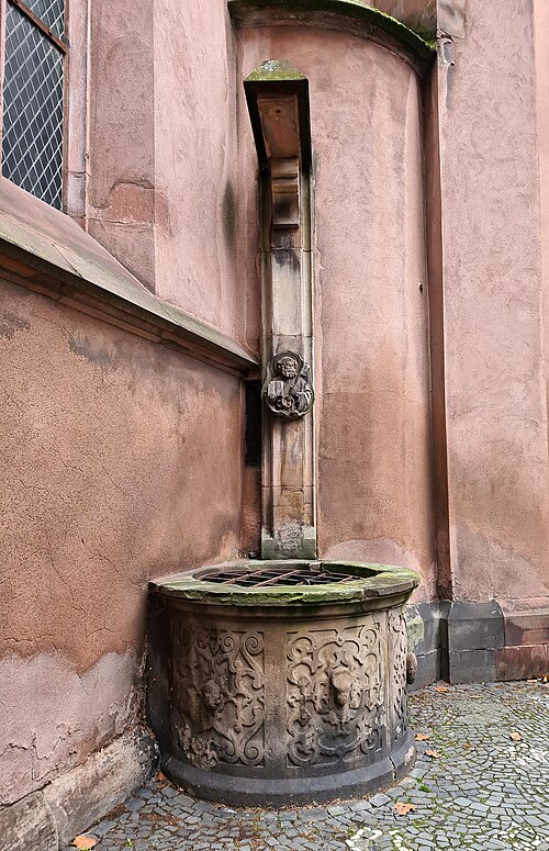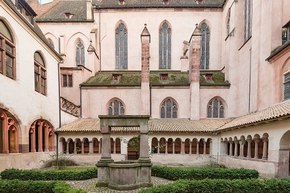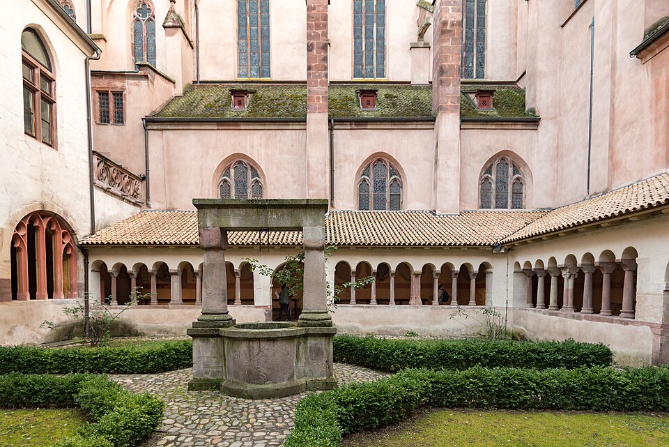Le cloître, adossé au collatéral nord de l'église par sa galerie sud, a pris son aspect actuel au terme de plusieurs campagnes de construction. Datable du XIe siècle, il s'est accru au XIVe siècle par l'adjonction d'une galerie gothique à l'est réalisée dans la seconde moitié de ce siècle. Des modifications ont eu lieu au XVIIIe siècle, puis une restitution radicale a été conduite lors du grand chantier de l'église dirigé par Carl Schäfer après 1897. Si la galerie orientale conserve un caractère gothique authentique, les trois autres galeries visibles aujourd'hui relèvent d'un néo-roman résultant de ces interventions de la fin du XIXe siècle. Le cloître est entouré, à l'est, au nord et à l'ouest, de trois bâtiments canoniaux élevés entre le XIe et le XVe siècle et qui ont pris leur volumétrie actuelle à cette époque. Quelques vestiges romans subsistent dans l'ensemble, notamment des colonnes du cloître et d'autres éléments archéologiques liés à l'église. Les peintures murales du cloître ont fait l'objet d'une campagne de restauration en 2003-2005, qui a contribué à la conservation de son décor. Intégré au vaste ensemble de l'église Saint-Pierre-le-Jeune, le cloître participe à la lecture historique et architecturale de cet édifice classé au titre des monuments historiques.