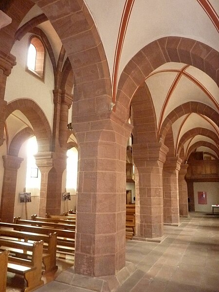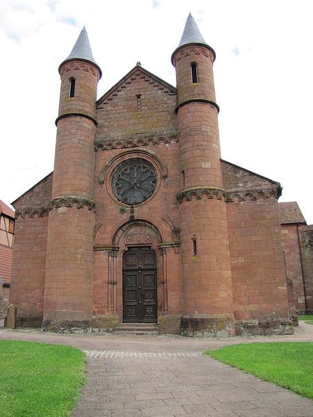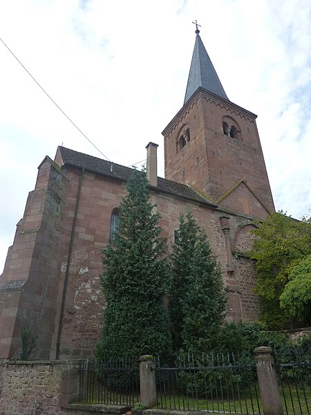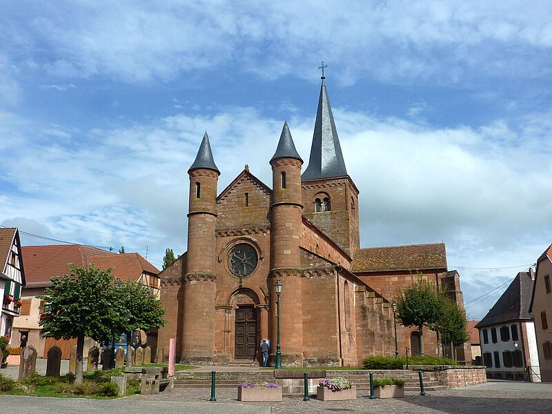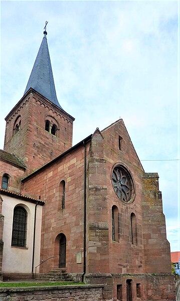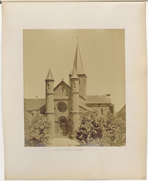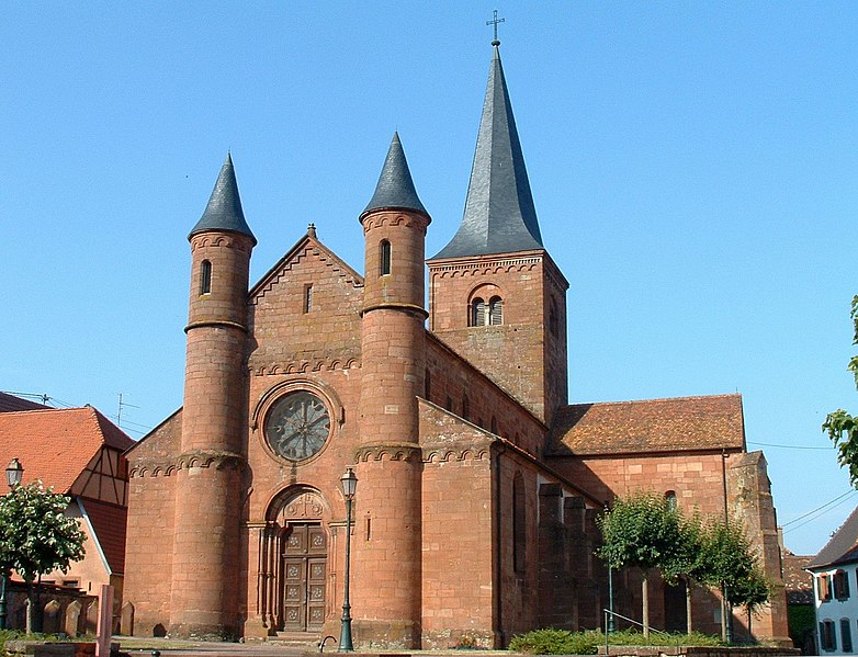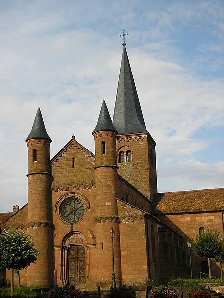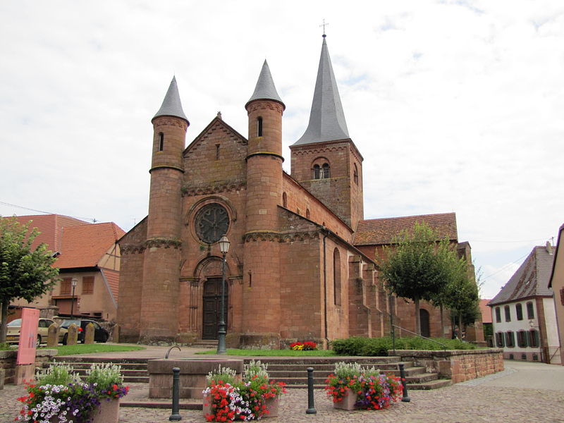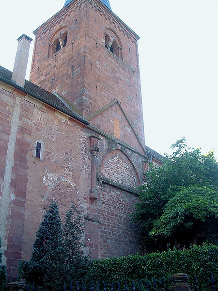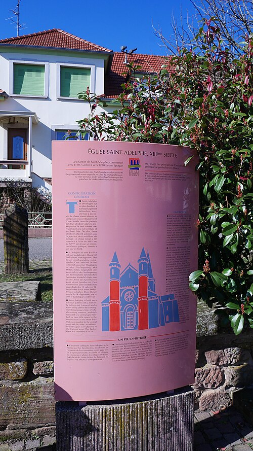 L'église Saint-Adelphe se trouve à Neuwiller-lès-Saverne, dans le Bas-Rhin ; l'édifice est classé au titre des monuments historiques depuis 1862 et fait l'objet d'une inscription depuis le 18 octobre 1989. Les reliques de saint Adelphe, apportées au monastère de Saints-Pierre-et-Paul par l'évêque Drogon vers 830, attirèrent de nombreux pèlerins et entraînèrent l'agrandissement de la chapelle primitive dédiée à saint Jean-Baptiste. Fondée comme église paroissiale et siège d'un chapitre de chanoines au début du XIIe siècle, elle est mentionnée pour la première fois en 1147. Une reconstruction importante débute vers 1190 et, autour de 1220, les reliques sont transférées dans la nouvelle église, faisant du lieu un centre de pèlerinage. Au premier quart du XIIIe siècle, l'édifice fait l'objet d'une reconstruction complète, puis, sans doute à la fin du même siècle, le chœur roman est remplacé par un chœur-halle à trois vaisseaux qui abrite un nouveau tombeau-reliquaire de saint Adelphe. Dans les décennies suivantes, la nef est allongée progressivement vers l'ouest jusqu'à atteindre cinq travées et le transept est développé ; au XIVe siècle le chœur roman à trois absides est remplacé par un chœur gothique imposant à trois nefs et trois travées, sans doute pour améliorer l'accès au reliquaire. À la fin du XIIIe siècle une châsse en bois est placée au-dessus du reliquaire en pierre, et l'on aménage sous l'aile nord du transept et sous des maisons voisines une salle souterraine qui a pu servir de réfectoire aux pèlerins ; le gisant de Louis de Lichtenberg y est installé en 1471. Des niches sont créées dans le croisillon nord au début du XIVe siècle et la grande cloche dite "Bürgerglocke", coulée par Johann Grempp, est installée en 1431. À la fin du XVe siècle, des tapisseries représentant la vie de saint Adelphe ornent le chœur. En 1497, le chapitre des chanoines de Saint-Adelphe est uni à celui de Saint-Pierre-Saint-Paul. Au XVIe siècle, après la cession des droits du siège épiscopal de Metz au comté de Hanau-Lichtenberg, la Réforme est introduite par le comte Philippe de Hanau ; en 1562 les habitants imposent le culte protestant et, l'année suivante, le transept et le chœur sont restitués aux catholiques, établissant un simultaneum, l'un des premiers en Alsace. Les troubles se poursuivent pendant la guerre de Trente Ans ; en 1633 une garnison française est cantonnée à Neuwiller. La question de l'usage du transept est tranchée le 31 août 1683 : les catholiques obtiennent l'usage exclusif du transept et du chœur après l'édification d'un mur de séparation et l'ouverture d'une porte latérale dans le croisillon sud, tandis que les protestants conservent l'usage des cloches, la "Bürgerglocke" restant commune aux deux cultes ; au-dessus de l'entrée ouest du croisillon sud est gravée une citation de Matthieu en latin accompagnée d'un chronogramme daté de 1684. À la Révolution, le simultaneum est supprimé et l'abbatiale est attribuée à la paroisse catholique ; plus tard, en 1800, l'église Saint-Adelphe est rattachée à la paroisse protestante tandis que l'abbatiale devient paroisse catholique. Le chœur gothique est vendu puis démoli en 1824 et le transept sert un temps de remise pour les pompes à incendie avant d'être réuni à la nef en 1835. La flèche du clocher, démolie en 1819, est reconstruite lors d'une importante campagne de restauration conduite de 1845 à 1847 par l'architecte Aloyse Vincent Maestlé, qui rétablit également le couronnement des tourelles occidentales, réunit le transept à la nef et supprime les tribunes encombrant les bas-côtés ; une inscription commémorative apposée à la pile nord-ouest de la croisée rappelle ces travaux et une cérémonie d'inauguration a eu lieu le 5 juillet 1846. Les travaux comprenaient encore le percement d'une porte dans le croisillon nord et la construction d'une tribune au fond de la nef pour recevoir le nouvel orgue de la manufacture Stiehr-Mockers, installé le 27 novembre 1850. Les contreforts du collatéral sud prennent leur forme actuelle en 1876, date inscrite au sommet de l'un d'eux. Enfin, dans une maison accolée au mur nord du transept subsiste le niveau inférieur d'un bâtiment qui fut sans doute élevé par le chapitre des chanoines, vestige du dispositif conventuel lié à l'église.