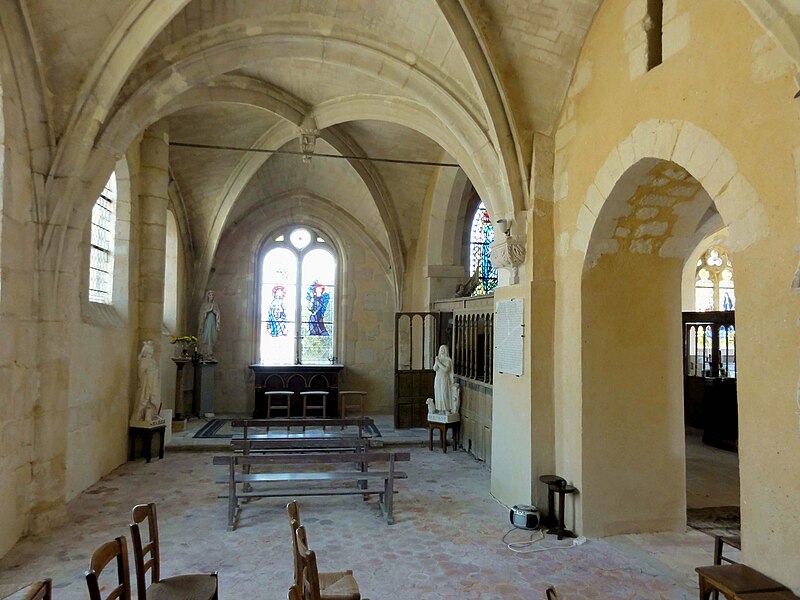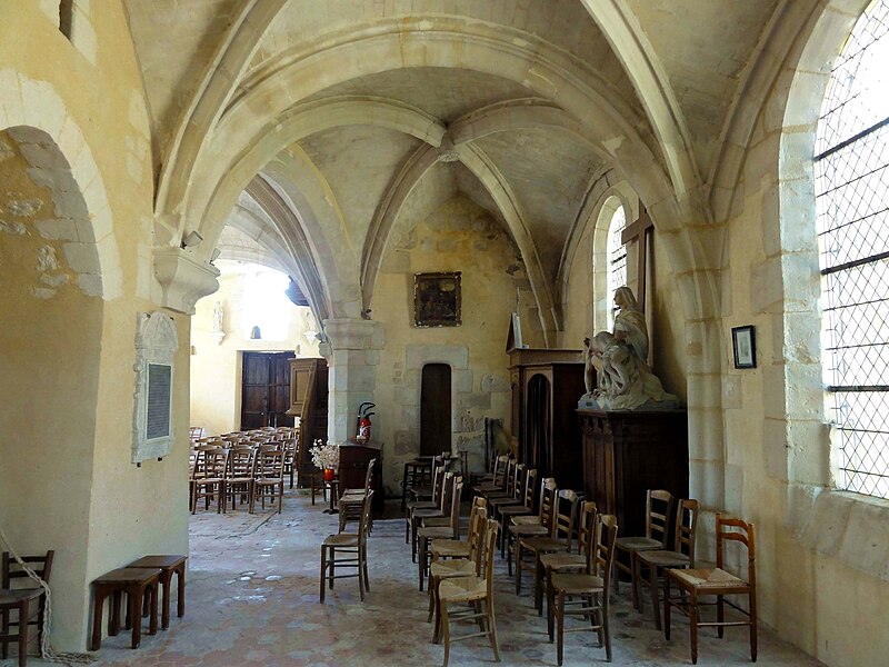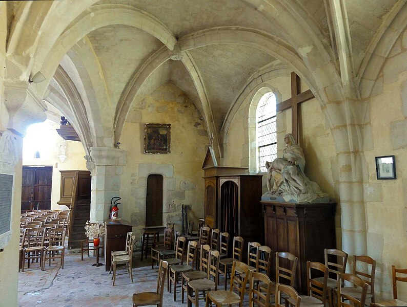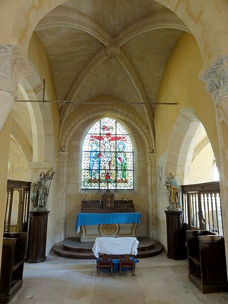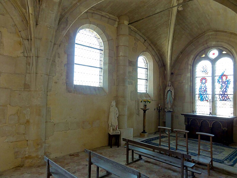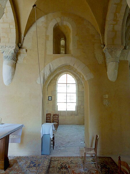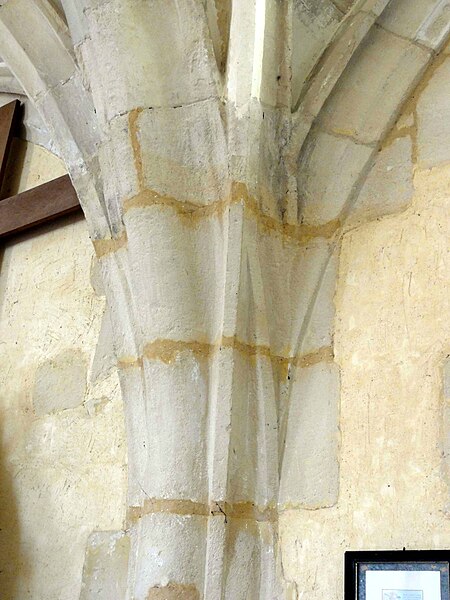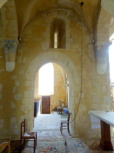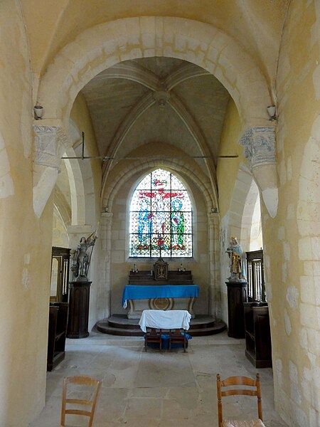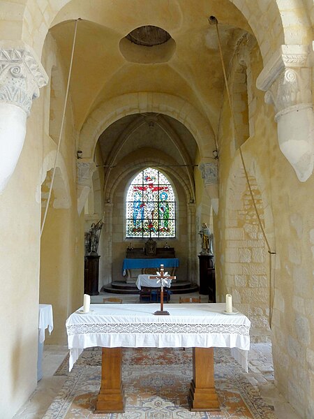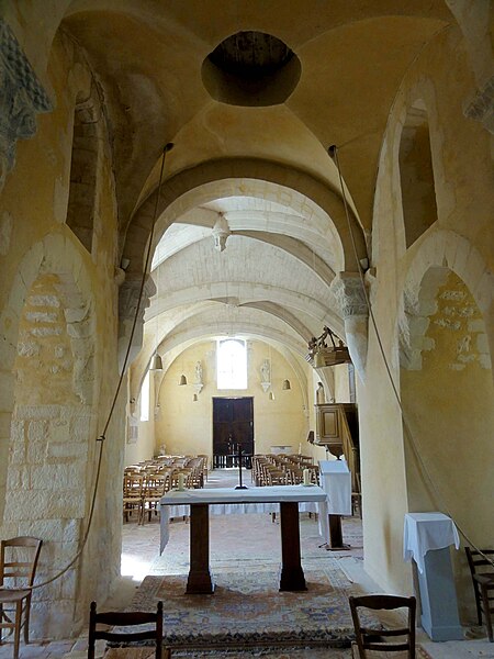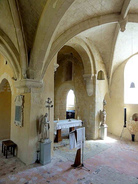 À l'intérieur, outre les vestiges romans visibles dans la nef et la base du clocher, les voûtements et les clés de la Renaissance témoignent des campagnes de la fin du Moyen Âge et de l'époque moderne ; des formerets et chapiteaux romans subsistent dans le chœur, dont certains étaient autrefois masqués sous un enduit et ont été révélés lors des restaurations récentes. La charpente en carène renversée du XVe siècle, prévue pour un lambris jamais posé, illustre un changement de projet au profit du voûtement d'ogives. Les décors des embrasures romanes encore lisibles conservent une polychromie architecturale médiévale à base d'ocre et de motifs cruciformes.