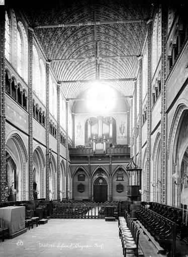 L’orgue construit par Joseph Merklin à la fin du XIXe siècle a été électrifié en 1969 par la maison Danion‑Gonzalez, qui a modifié la composition en ajoutant des mixtures et des mutations; l’instrument comporte une pédale de 30 notes et deux claviers de 56 notes avec jeux de fonds, flûtes et registres de trompette et de voix humaine. L’église Saint‑Aignan dépend de la paroisse Notre‑Dame, Chartres ville, rattachée au doyenné de Chartres; elle est desservie depuis 2008 par la Fraternité sacerdotale Saint‑Pierre et la messe y est célébrée six jours par semaine selon la forme extraordinaire du rite romain.