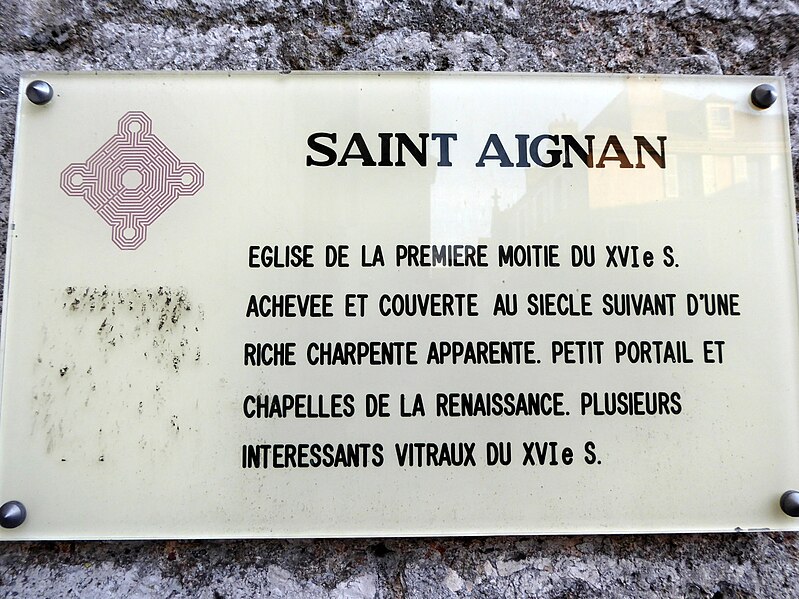L’église Saint-Aignan, située à Chartres, porte le nom d’Aignan d’Orléans et s’appuie sur l’emplacement d’une église pré-romane antérieure. L’édifice actuel remonte au début du XVIe siècle; son portail principal, vestige gothique, date du XIVe siècle et la crypte est datée de la fin du XVe siècle. La tradition fait de l’église le lieu d’inhumation du saint et rappelle qu’elle fut la paroisse des comtes de Blois et de Chartres. Implantée entre l’ancien château des comtes et le rempart reconstruit au IXe siècle, elle a subi des incendies aux XIIe siècle et en 1262 avant d’être reconstruite puis transformée. La terrasse sud recouvre l’ancien cimetière et le chevet s’étend sur le haut du rempart devenu inutile. L’édifice est classé au titre des monuments historiques depuis 1840.