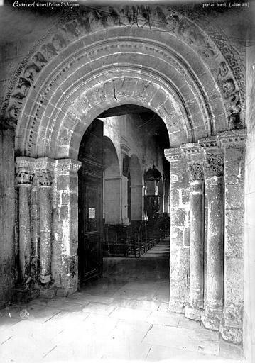 L'église Saint-Aignan, parfois orthographiée Saint-Agnan, est située à Cosne-Cours-sur-Loire et classée au titre des monuments historiques en 1862. L'édifice est orienté à l'est. Édifiée sur l'emplacement d'un oratoire du VIe siècle dédié à saint Front, l'église fut élevée par les bénédictins sous l'impulsion d'Hugues, abbé de Cluny, et achevée au début du XIIe siècle. De cette époque subsistent le portail roman, l'abside, le chevet et des éléments de murs, le portail étant protégé par le clocher-porche. La décoration romane, qui symbolise la lutte du Bien contre le Mal, présente notamment, dans la partie supérieure du porche, le Christ dans une auréole ovoïde, bénissant et tenant le Livre de la Sagesse. Incendies et effondrements détruisirent partiellement l'édifice, et les parties sinistrées furent reconstruites au XVIIIe siècle. Le clocher s'écroula le 3 mars 1738 à 4 h 30, provoquant la ruine d'une grande partie de l'église; un rapport d'expertise évoque comme cause probable un affaissement du terrain lié à des conditions climatiques défavorables. La reconstruction, engagée en 1745 avec le concours des habitants, a repris les travées de la nef en arcatures plein cintre et surmonté chaque pilier d'un pilastre plat mouluré supportant une corniche marquant la naissance de fausses voûtes en berceau réalisées en enduit sur lattis. Les collatéraux, couverts originellement de demi-berceaux, sont aujourd'hui coiffés de plafonds horizontaux en lames de châtaignier. La sobriété de cette reconstruction du XVIIIe siècle s'accorde avec les parties romanes conservées. À l'origine, dans la seconde moitié du XIe siècle, l'église adoptait un plan basilical avec une grande nef, deux collatéraux, un chœur, une abside centrale entourée d'absides latérales, un clocher implanté entre le chœur et la nef et le portail principal à l'ouest. Seule l'abside était voûtée; le reste de l'édifice recevait directement la charpente, généralement apparente. Parmi les vestiges antérieurs à l'écroulement, on relève les trois absides voûtées en cul-de-four et le mur-pignon ouest avec son portail roman. Dans le collatéral sud, des voûtements partiels en croisées d'ogives, raccordés à des colonnes engagées à bases romanes, et une voûte d'arête très détériorée subsistent, cette dernière surmontant une petite baie romane inscrite dans le pignon ouest. On signale aussi un bas-relief de la Nativité daté du XVIe siècle, un pilier en plan de croix, une travée à arc brisé et, à l'extérieur, des contreforts romans adossés au pignon et au mur du collatéral nord. Le clocher-porche, reconstruit au XVIIIe siècle sur les vestiges d'une tour du XVe siècle, présente des baies hautes en plein cintre et une porte en arc brisé sobre qui s'harmonisent avec le portail roman; une porte donnant accès à l'ancienne tour, dont le tympan demeure énigmatique, a été récemment redécouverte. Le plafond du porche est un platelage jointif dont le bois serait issu, selon la tradition, de la déchirure d'un bateau de Loire. L'église possède deux cloches accordées en do et fa; la plus grosse, pesant 1 215 kg et nommée Henriette-Mélanie, a été bénie le 30 juillet 1878 par Mgr Gronier, évêque de Nevers. Le maître-autel en pierre de taille, inauguré en octobre 1858 et orné de l'Agneau pascal entouré des symboles des quatre évangélistes, coexiste avec des vitraux modernes installés après la Seconde Guerre mondiale représentant le Christ, saint Agnan, saint Front, la Vierge Marie et saint Hubert. À la suite de la réfection de la toiture, l'intérieur a été refait et les murs colorés à l'ocre lui ont rendu une lumineuse sobriété d'origine. Les grilles extérieures du porche, posées récemment, ont été conçues pour s'intégrer discrètement à l'architecture.