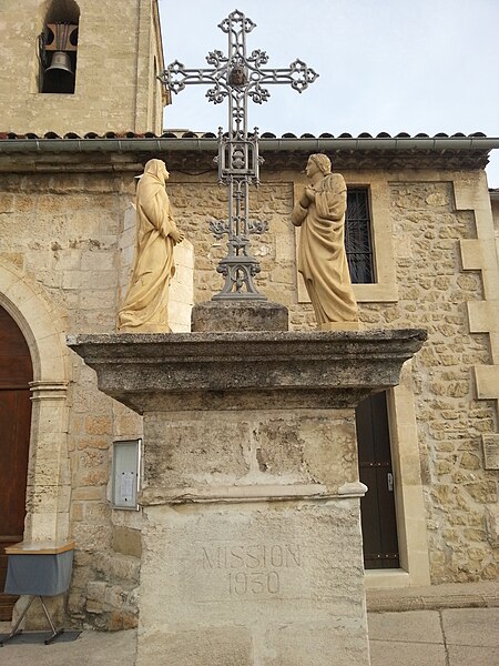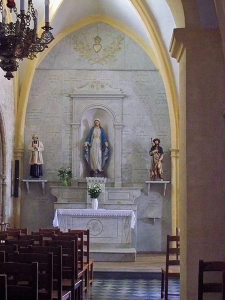 À droite de l'entrée se dresse un calvaire figurant Marie à gauche et saint Jean à droite autour d'une croix ; la statue de saint Jean, dérobée en 1999, a été recréée à partir de photos d'archives et réinstallée en 2005. Parmi les éléments visibles se trouvent l'entrée et le narthex, le chœur, la sacristie, l'arc de décharge d'une travée, la chapelle des confessions et la façade du presbytère démoli en 2021.