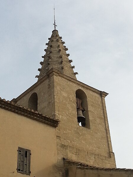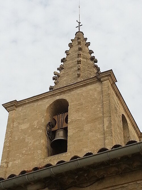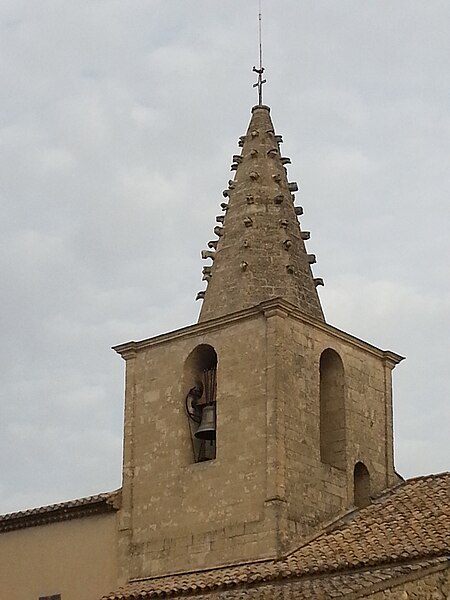 Le clocher, construit avant le XIVe siècle, est remarquable par sa flèche octogonale massive et la décoration de rostres de pierre : au total 56 rostres répartis en sept sur chacune des huit arêtes, dont la longueur décroît vers le sommet, produisant un effet d'alignement. Les rostres représentent plusieurs figures — têtes, phallus, becs et griffes — et la flèche est sommée d'une croix et d'un coq.
