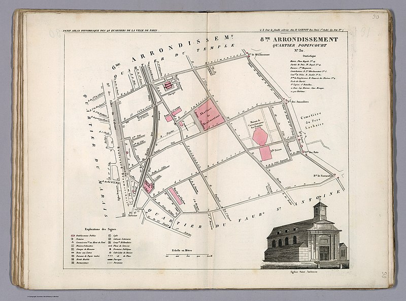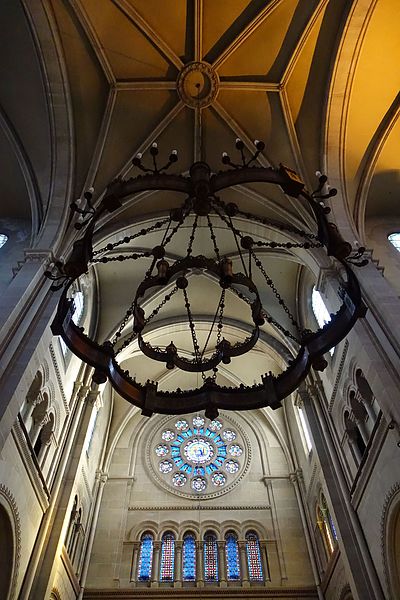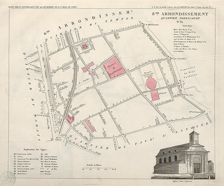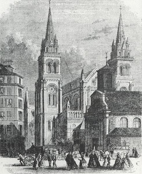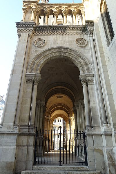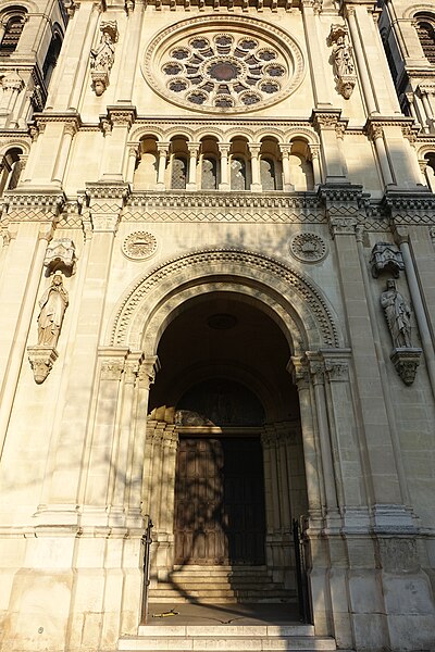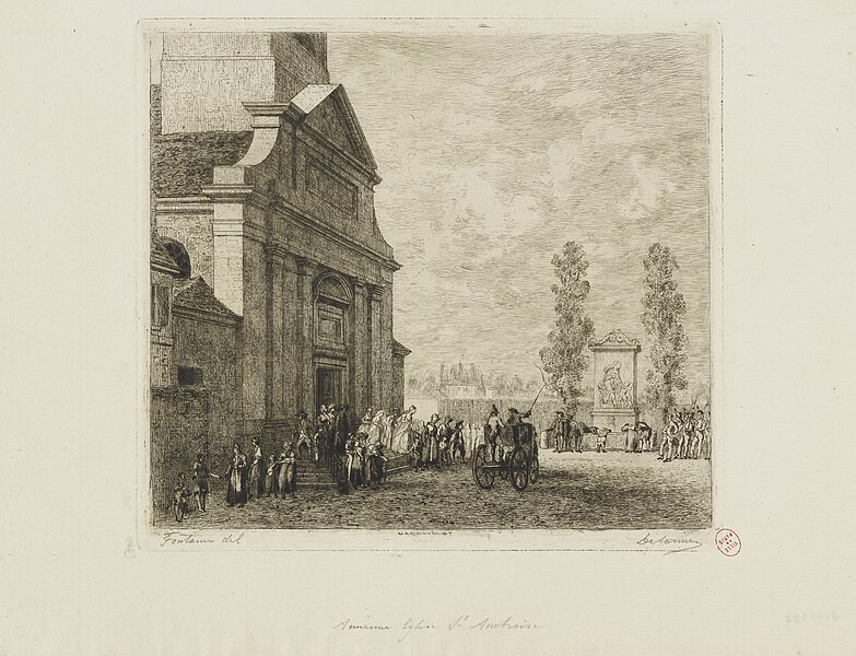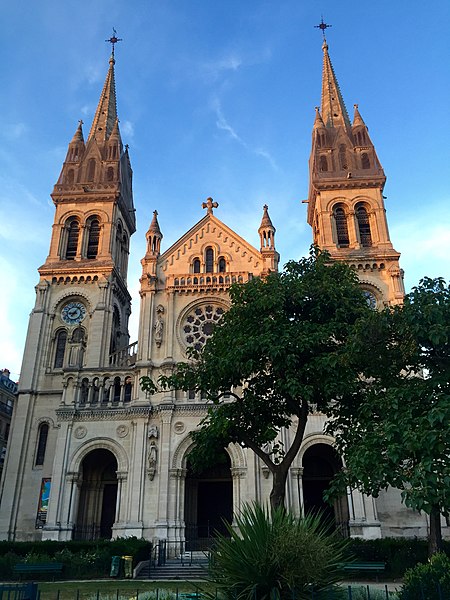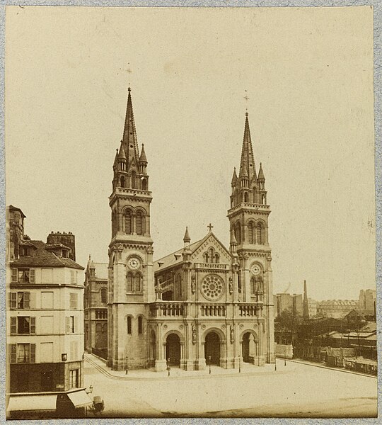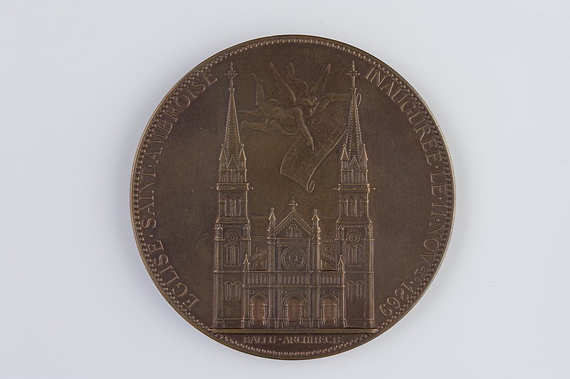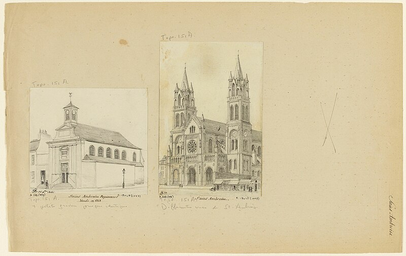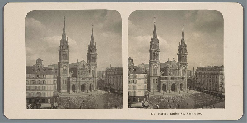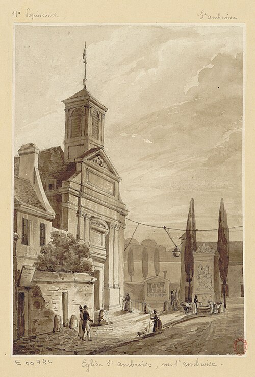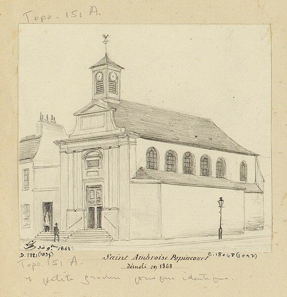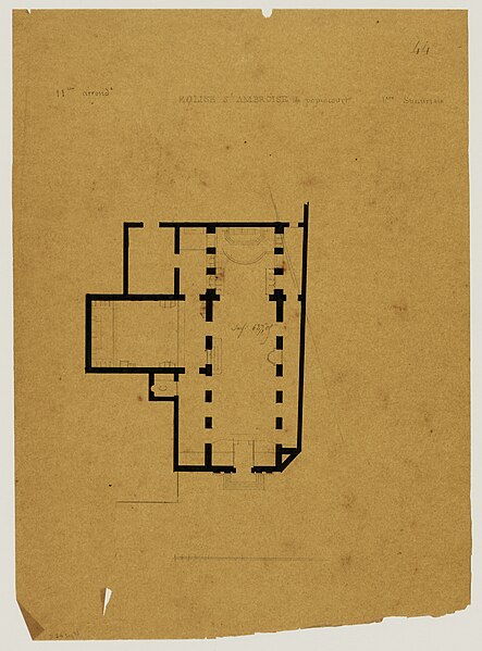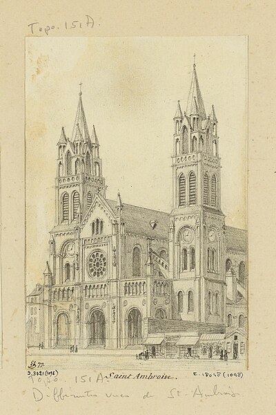 L'église Saint‑Ambroise, située dans le 11e arrondissement de Paris et dédiée à saint Ambroise, a donné son nom au quartier et est desservie par la station de métro Saint‑Ambroise. Une première chapelle fut édifiée en 1659 par les religieuses du couvent des Annonciades de Popincourt, installées rue Popincourt depuis 1636. Les religieuses quittèrent le couvent en 1782 et la chapelle, devenue bien national, fut vendue le 21 mai 1797. Elle devint succursale de la paroisse Sainte‑Marguerite en 1802, puis fut rachetée par la Ville de Paris le 31 août 1811 et restaurée et agrandie par Étienne‑Hippolyte Godde; elle fut bénite le 15 novembre 1818. Cette première église, appelée Notre‑Dame de la Procession, était globalement orientée nord‑sud dans l'axe de la rue Popincourt et entourée de bâtiments à l'ouest et au sud. Elle fut détruite lors du percement du boulevard du Prince‑Eugène (devenu boulevard Voltaire) et son emplacement a été transformé en square Saint‑Ambroise. La reconstruction de l'église fut déclarée d'utilité publique le 24 janvier 1863 et l'édifice actuel, situé vers le 71 boulevard Voltaire, fut construit de 1863 à 1868 d'après les plans de l'architecte Théodore Ballu. Le premier office y eut lieu le 21 mars 1869 et la bénédiction des cloches se déroula le 29 avril en présence de l'impératrice Eugénie, marraine de l'une d'elles. Le style de l'édifice mêle néoroman, néogothique et néobyzantin, courant alors à Paris, et ses deux flèches élancées évoquent celles de certaines cathédrales. Mgr d'Hulst a été vicaire de la paroisse. Pendant la Commune de 1871, sans interrompre le culte, l'église a hébergé le Club Ambroise, dit Club des prolétaires, qui publiait le journal Le Prolétaire et accueillait des oratrices féministes; à partir du 23 mai 1871 elle servit aussi de poudrerie. L'église Saint‑Ambroise a été consacrée par le cardinal Léon Adolphe Amette le 7 décembre 1910. Le 14 février 1907, environ cinquante mille personnes se massèrent dans et autour de l'église pour les obsèques de la fillette Marthe Erbelding, victime d'un meurtre et dont le corps fut découvert dans une malle déposée à la gare de l'Est. Son assassin, Albert Soleilland, voisin des parents, fut condamné à mort le 24 juillet par les Assises de la Seine, puis gracié et envoyé au bagne de Guyane où il mourut de tuberculose en mai 1920; cette affaire, très médiatisée, retarda le débat sur l'abolition de la peine de mort qui, devant la Chambre des députés, se solda le 8 décembre 1908 par le maintien de la peine capitale par 330 voix contre 201. Le 18 mars 1996 l'église fut occupée par environ trois cents personnes originaires d'Afrique et en situation irrégulière réclamant leur régularisation; en raison de risques sanitaires le curé demanda l'évacuation et les forces de l'ordre intervinrent le 22 mars au petit matin. La médiatisation de cette occupation et de son expulsion est à l'origine du mouvement des sans‑papiers, dont certains occupèrent ensuite l'église Saint‑Bernard. L'église Saint‑Ambroise est inscrite au titre des monuments historiques depuis le 2 juin 1978. Construite dans un style éclectique parfois qualifié de « Second Empire », l'église marie des éléments néoromans et néogothiques, rappelant certaines églises romanes renforcées de flèches gothiques. Elle est bâtie en pierre dure de l'Yonne et de la Meuse pour les fondations, les tours et les piliers, le remplissage étant réalisé en moellons venus des carrières de Saint‑Maximin. L'édifice mesure 87 mètres de long et 37 mètres de large au transept et possède deux clochers identiques de 68 mètres de hauteur, aux flèches octogonales cantonnées de quatre pinacles et coiffées d'une croix en fer surmontée d'une girouette en forme de coq. Le porche, saillant, ouvre sur trois portes dont les tympans portent des peintures en lave émaillée de style néobyzantin réalisées par Giuseppe Devers (1823‑1882), représentant notamment des allégories et saint Ambroise. La nef, haute de vingt mètres, comporte un triforium ouvert par des triplets de baies à arcades en plein cintre; les voûtes reposent sur des croisées d'ogives en plein cintre, caractéristiques de l'art roman normand. Le mobilier et les œuvres sont de facture modeste; on y a toutefois signalé des sculptures de Louis‑Denis Caillouette, dont L'Espérance et La Foi (1829) aujourd'hui disparues, et L'Immaculée Conception, présentée au Salon de 1824. La cuve baptismale en marbre blanc, soutenue par huit colonnettes en marbre rouge, était autrefois surmontée d'un couvercle couronné d'une croix et de l'Agneau mystique qui ont disparu; on trouve également un autel à baldaquin, des lustres, une statue de saint Jean‑Baptiste et un bénitier. Dans le transept gauche la chapelle de saint Augustin reçoit deux peintures murales de Jules Lenepveu illustrant des épisodes du concile de Carthage et la fin d'un usage guerrier barbare, tandis que la chapelle de saint Ambroise, dans le transept droit, présente deux toiles de Lenepveu montrant saint Ambroise face à l'empereur Théodose et rachetant des prisonniers avec les vases sacrés de son église. Les vitraux datent de 1868 et sont l'œuvre du maître‑verrier Charles‑Raphaël Maréchal de Metz, parmi lesquels figurent des scènes comme Joseph charpentier et la Fuite en Égypte. Le grand orgue de tribune, construit par Merklin‑Schütze en 1869, compte 32 jeux, trois claviers et un pédalier; il a été restauré et complété par Gutschenritter au XXe siècle puis par Bernard Dargassies au XXIe siècle, et Georges Mac‑Master en a été organiste et maître de chapelle. Un orgue de chœur, également de Merklin et placé derrière l'autel, comprend 13 jeux répartis sur deux claviers manuels et un pédalier. Trois cloches sont installées dans la tour de droite sous une charpente en bois; e