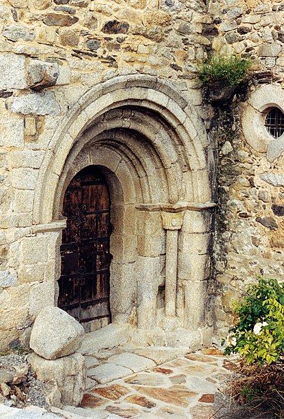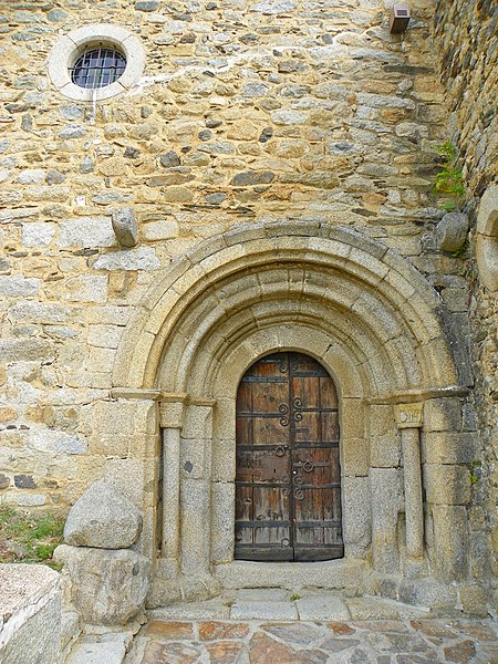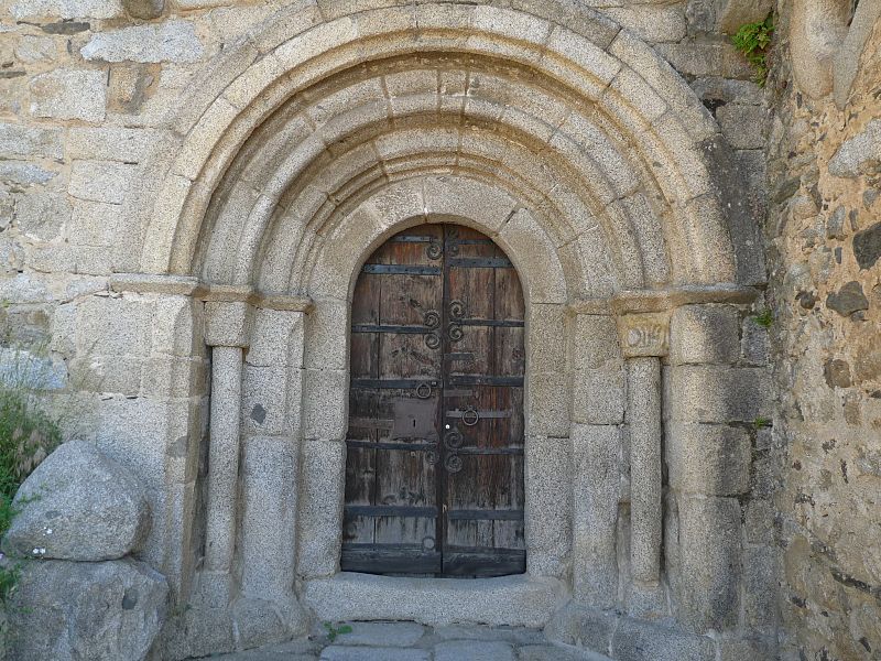 La façade sud s'ouvre sur un portail en granit du XIIe siècle, encadré de colonnes à chapiteaux et couronné d'une archivolte moulurée à quatre voussures ; la seconde voussure porte un boudin tandis que la première et la troisième présentent des claveaux biseautés. La porte a conservé quelques-unes de ses ferrures.