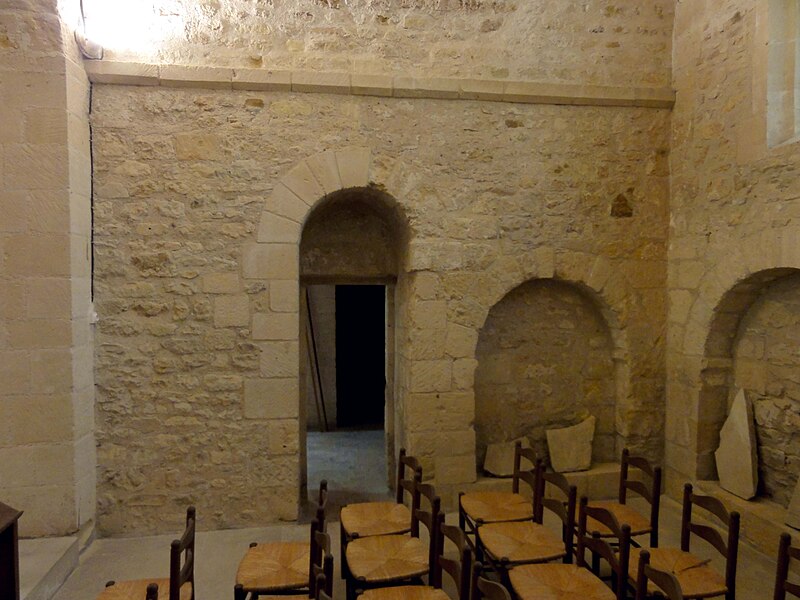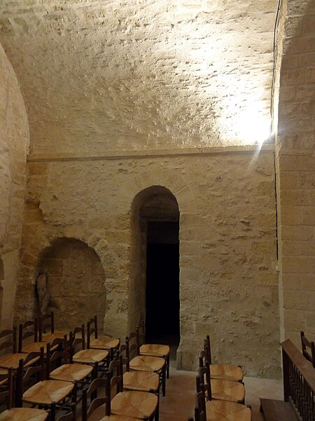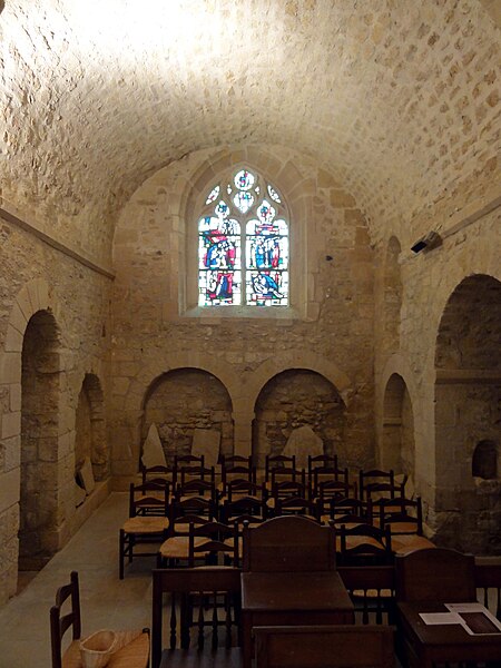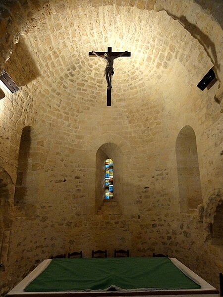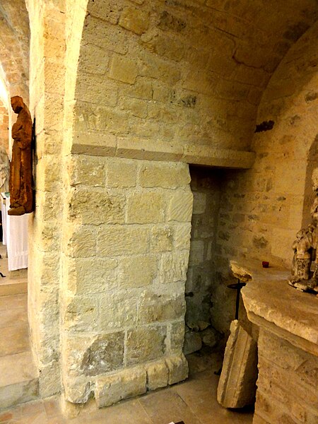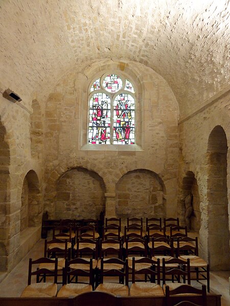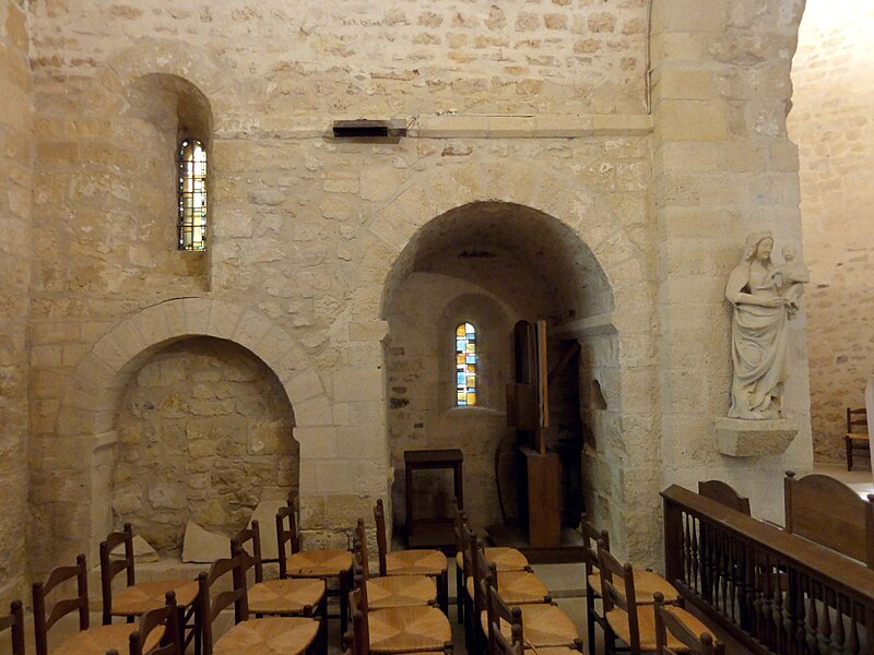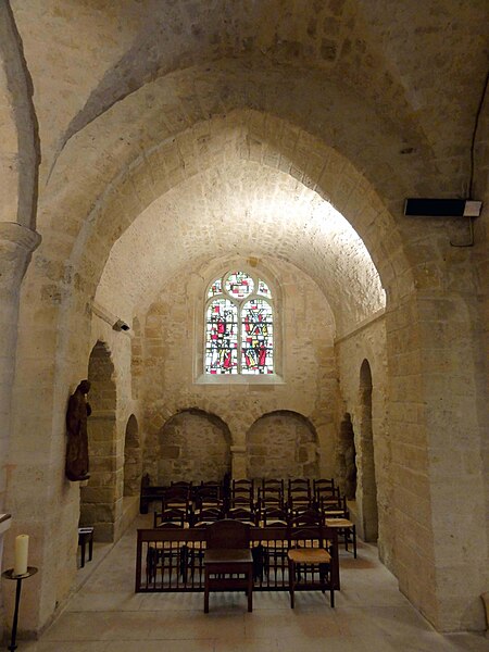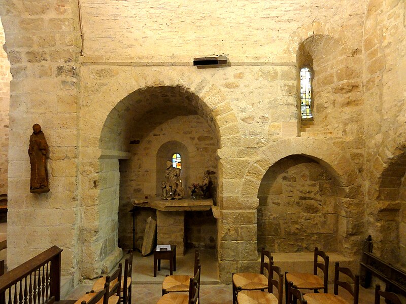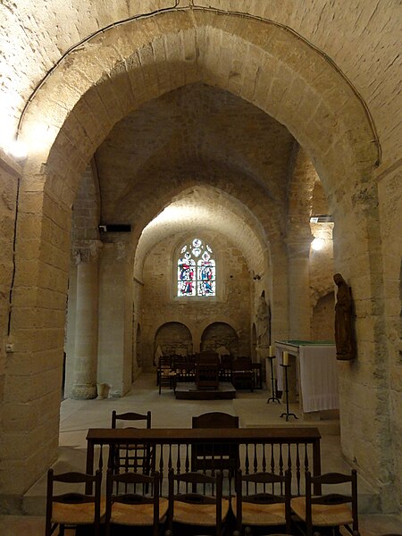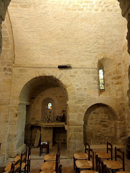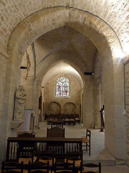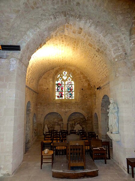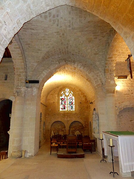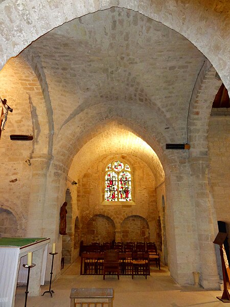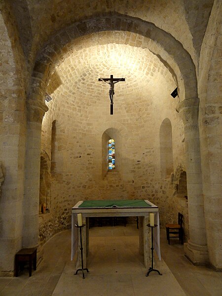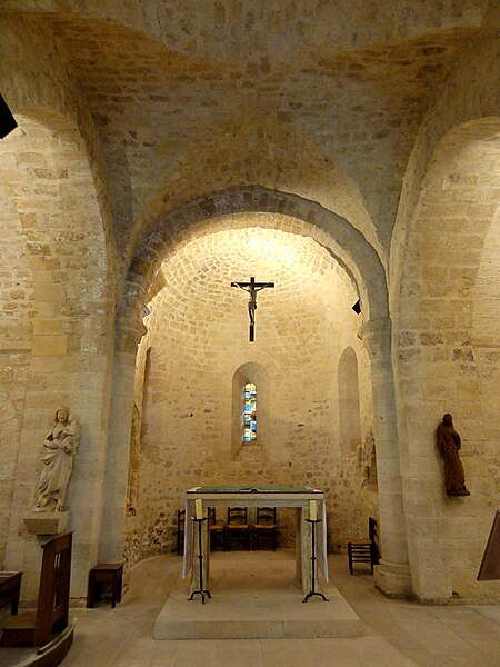 La croisée du transept s'ouvre par un arc triomphal à deux rangs de claveaux et retombe sur des tailloirs et chapiteaux dont la sculpture, comparée à celle d'autres églises régionales, rattache l'ouvrage à la production normande de la seconde moitié du XIe siècle ; les chapiteaux montrent des corbeilles décorées de crossettes, de volutes et d'étoiles inscrites dans des carrés. La voûte d'arêtes de la croisée repose sur l'arc triomphal, un arc-doubleau et de larges arcades latérales, tandis que l'abside s'ouvre sur trois étroites baies en plein cintre profondes et comporte des piscines liturgiques ménagées entre les colonnes engagées. Les croisillons, de largeur identique mais avec le nord légèrement plus profond, conservent des élévations où se lisent des interventions de la fin du Moyen Âge et de la Renaissance et présentent un rare ensemble de voûtes en berceau plein cintre assorties d'absidioles voûtées de même.