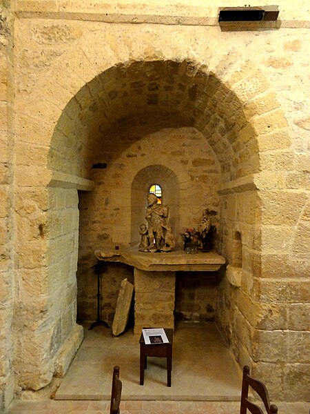Le mobilier comprend plusieurs pièces anciennes et six éléments classés au titre des objets : un retable partiellement conservé, quatre statues et un tableau. On y signale des fonts baptismaux du XVIe siècle, une table d'autel attribuée au XIIe siècle et rétablie lors de la restauration, ainsi que diverses sculptures en pierre et en bois datées du XVIe siècle ou du début du XVIe siècle, dont des statues de sainte Barbe, saint André, saint Pierre, la Vierge à l'Enfant, saint Fiacre et saint Roch, certaines classées aux monuments historiques. Le tableau de la Nativité, huile sur bois datée de la limite XVe/XVIe siècle, fut offert lors de la restauration de 1933, classé en 1944, restauré en 1969 et 2009, et est désormais conservé en mairie. Enfin, la cloche en bronze porte la date 1729 et une longue inscription nominative ; deux autres cloches existaient avant la Révolution.