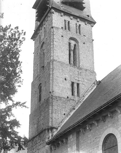 Le clocher de plan carré présente des étages marqués par des retraits dans la maçonnerie et des baies qui s'élargissent vers le sommet. Le beffroi en charpente, couvert d'ardoise, est percé d'abat-sons sur chaque face et surmonté d'une flèche octogonale en charpente.