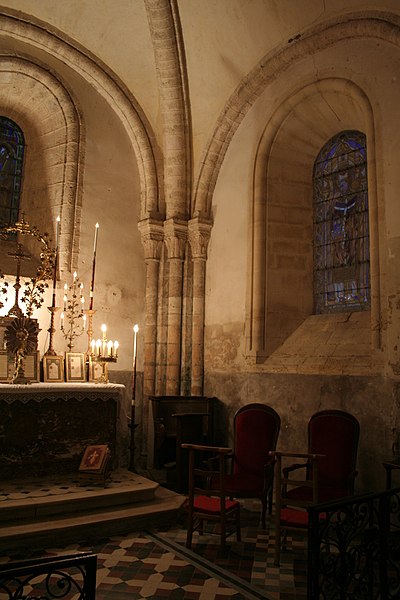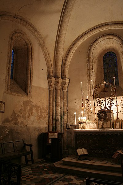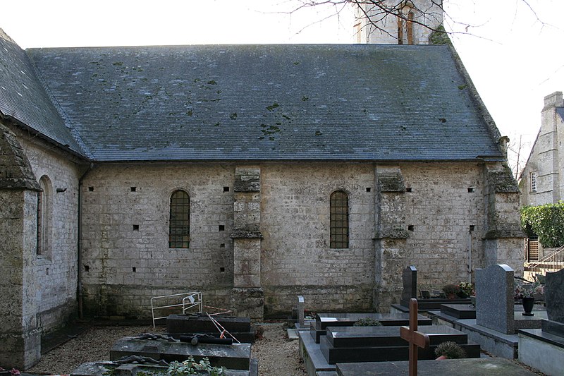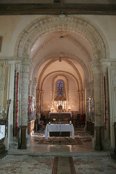 Le chœur, légèrement désaxé par rapport à la nef, est voûté d'ogives romanes au profil en boudin et à joints rubanés, caractéristiques de l'architecture normande du XIIe siècle ; fenêtres et voûtes datent de cette période. La clé de l'arc doubleau qui sépare les deux travées porte des armoiries. À l'extérieur, le chevet droit est cantonné de contreforts d'angle et orné d'une corniche à modillons. La charpente du chevet a été refaite aux XVIIIe ou XIXe siècles et repose sur des fermes portant des pannes.