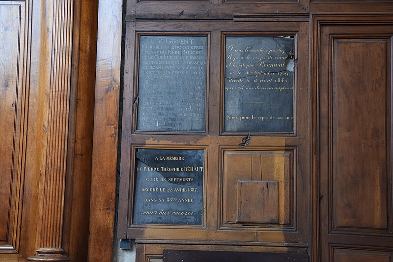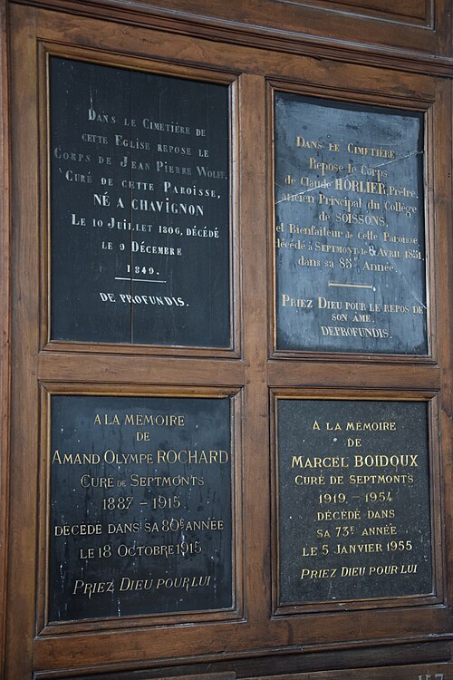 L'église Saint-André de Septmonts (Aisne) est un édifice de style gothique flamboyant à l'architecture relativement simple. Les arêtes du clocher sont ornées de crochets et la flèche de pierre est surmontée d'un quadrilobe, un motif en forme de trèfle à quatre feuilles symbolisant la croix. Un paratonnerre couronne la flèche et une horloge orne la face tournée vers la place de la mairie. L'église possède une poutre de gloire polychrome sculptée de médaillons représentant les douze apôtres. Elle se situe au 10, place de la Mairie, à une dizaine de mètres de la mairie et en vis-à-vis du parc du château de Septmonts. Immédiatement derrière l'édifice se trouve le vieux cimetière du village, accessible depuis l'église par une porte qui n'est ouverte que lors de certains enterrements. L'église a été bâtie à la fin du XVe siècle sous l'épiscopat de Jean Milet, évêque de Soissons ; son architecture sobre, pour une paroisse épiscopale, s'explique sans doute par la période de reconstruction après la guerre de Cent Ans. Le monument a été classé au titre des monuments historiques en 1933.