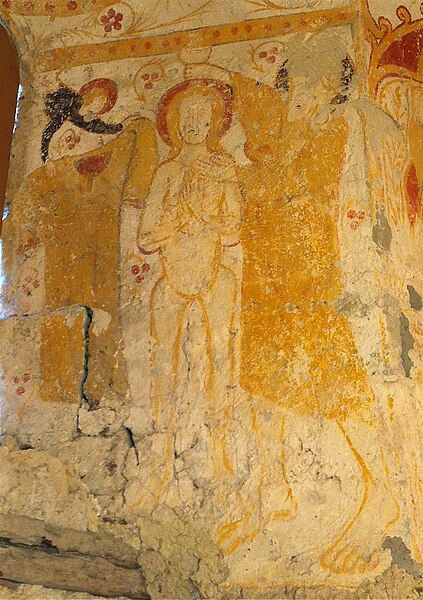 L'édifice roman se compose d'une nef à trois travées flanquée de bas-côtés étroits, d'un transept aux bras saillants et d'une abside en cul-de-four qui était autrefois accompagnée de deux absidioles voûtées, l'absidiole nord ayant disparu. La voûte de la nef a disparu ; un mur diaphragme sépare la nef et les bas-côtés du transept et communique avec lui par trois ouvertures surmontées d'arcs brisés soulignés d'impostes. Ce mur porte un clocher-mur percé de deux arcades et le transept est voûté en berceau. Chaque extrémité des bras du transept est éclairée par une baie à intrados trilobé. Des peintures murales médiévales ornent principalement le chœur et le transept ; datées des années 1300-1330, elles sont partiellement dégradées mais conservent des ocres rouges et jaunes.