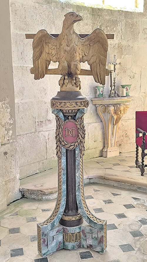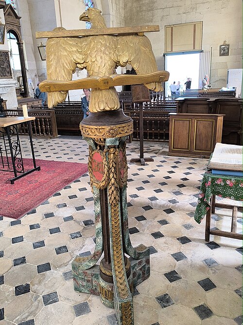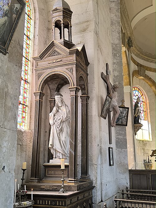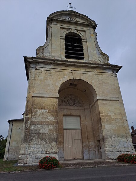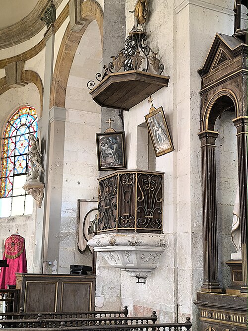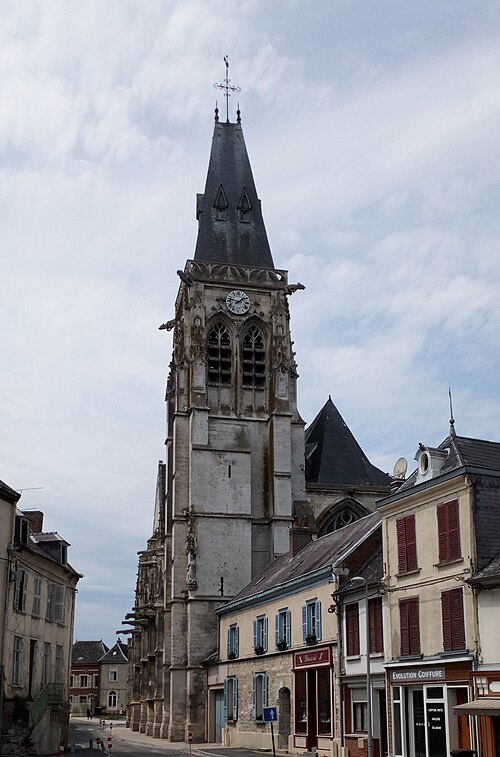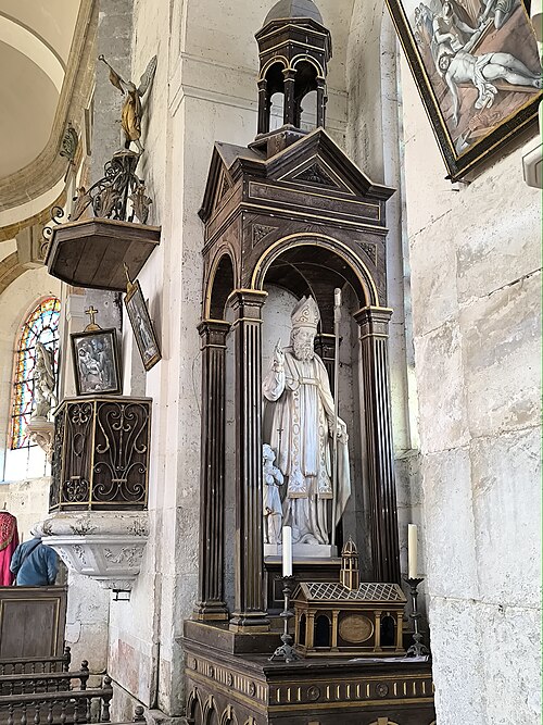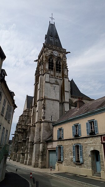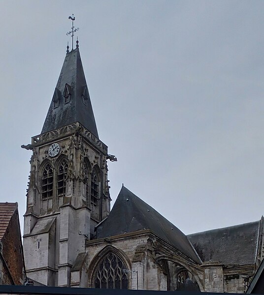 Le clocher, situé sur le côté sud du chœur et daté du XIVe siècle, est une tour carrée de 33 mètres cantonnée de contreforts ; en son sommet, à chaque angle, figurent quatre gargouilles ailées à queue en spirale, la cage d’escalier en saillie se trouve au côté est et la partie supérieure est percée d’ouïes ogivales géminées de style flamboyant. À l’angle sud-est du clocher, une statue de saint Antoine ermite du XIVe siècle le représente lisant et tenant les débris d’un tau, marchant au milieu des flammes et accompagné d’un cochon, image liée à la tradition de la guérison du Mal des ardents. Sur les murs du clocher, côté place, subsistent des empreintes de balles contemporaines du pillage de 1636.