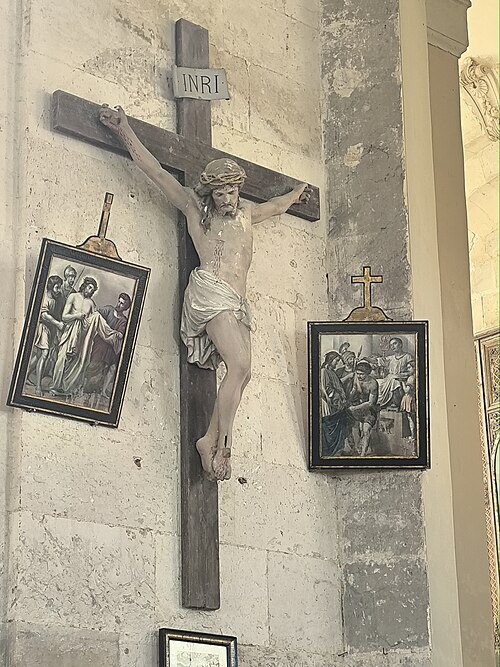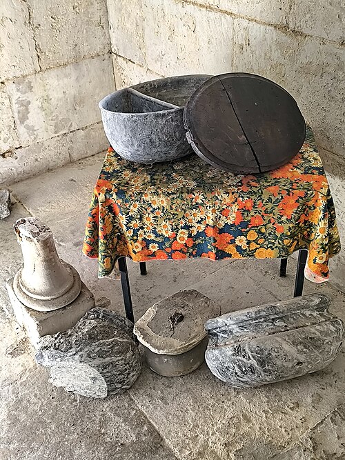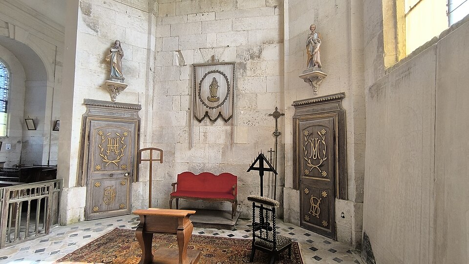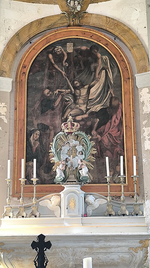 À gauche du portail occidental se trouve la fontaine Saint-Antoine, dont les eaux, selon la tradition, soignaient les animaux malades ; cette source prend naissance sous l’église à proximité de l’autel de Saint-Antoine et est à l’origine de la légende de la truite.