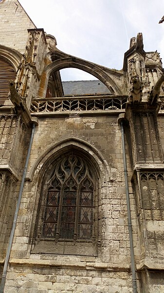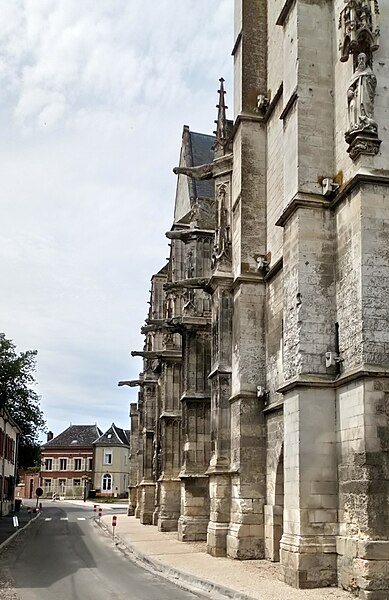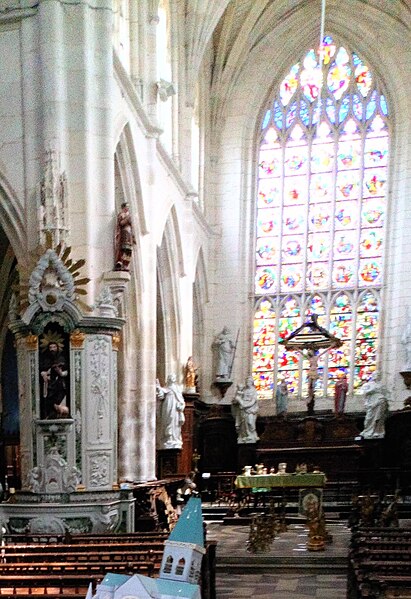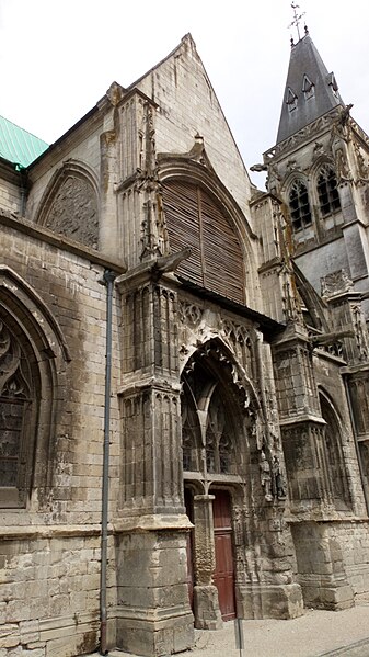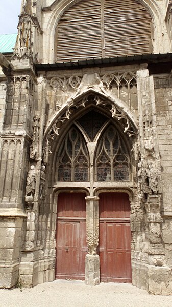 L’entrée du bras sud du transept s’ouvre par une double porte en anse de panier séparée par un trumeau ; le tympan est ajouré avec nervures flamboyantes, le portail est surmonté d’une ogive et d’un fronton en talon renversé, et il est encadré de piliers butants coiffés de pyramides à crochets. L’archivolte richement sculptée et la dentelle de pierre reposent sur des colonnettes qui supportent deux statues de seigneurs tenant des lambels (chartes). À droite du portail se remarque saint Adrien en costume de guerre, accompagné d’un lion et d’une enclume, et à gauche saint Sébastien, tenant un faisceau de trois flèches ; ces figures ont parfois été interprétées comme des chevaliers. Presque tous les contreforts portent des panneaux sculptés, et la balustrade flamboyante des bas-côtés qui longent le chœur est décorée de gargouilles formant un bestiaire de dragons, sphinx, singes, aigles, lévriers, lions et crocodiles, certains figurés avec des caparaçons.