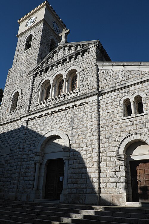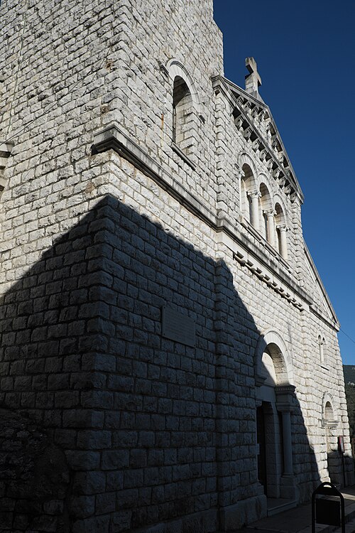 L'église présente un plan basilical composé d'une nef de quatre travées flanquée de deux collatéraux, le chœur et les bas-côtés se terminant par des chevets plats. Les trois nefs sont séparées par deux rangées de quatre piliers en calcaire gris local. Les bases des colonnes comportent diverses têtes de style roman tardif, dont le fameux « sourire de Levens ».
