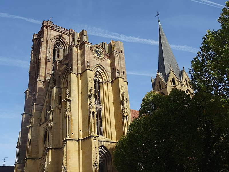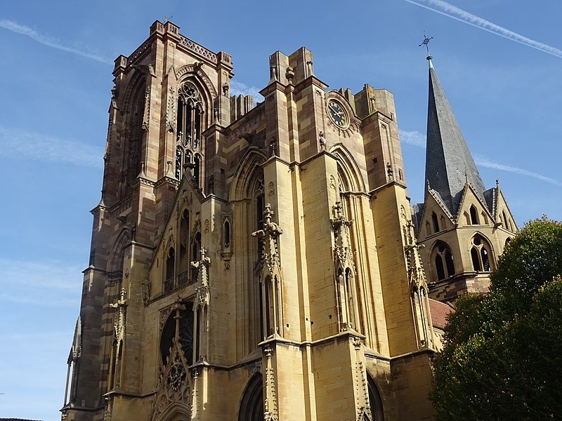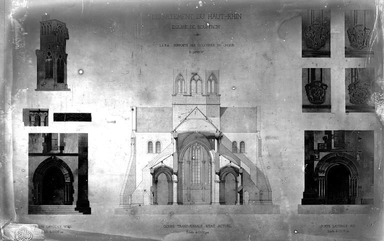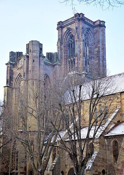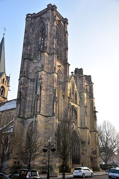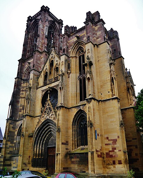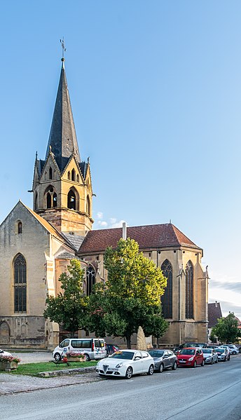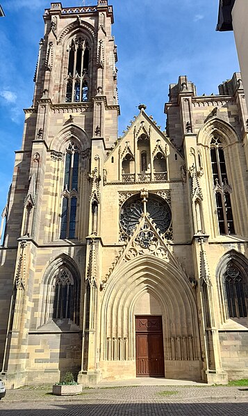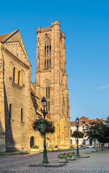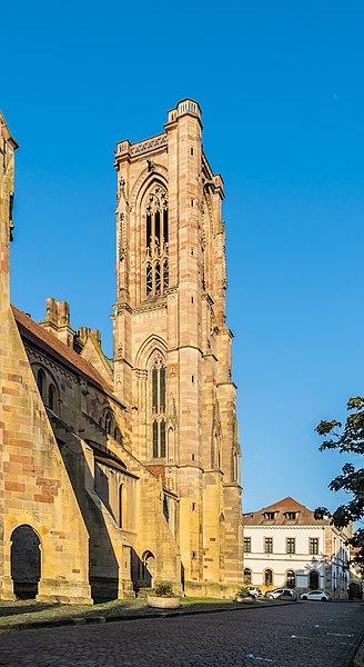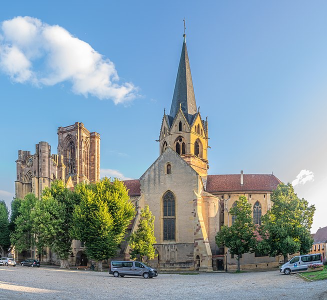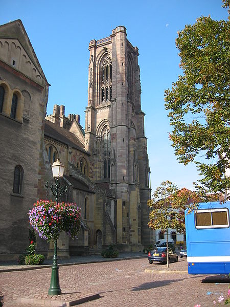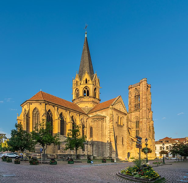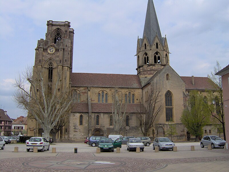L'église Notre-Dame-de-l'Assomption, parfois appelée Saint-Arbogast, est située place de la République à Rouffach (Haut-Rhin) et classée au titre des monuments historiques depuis 1841. Son massif occidental inachevé et la tour octogonale élevée sur la croisée du transept, couronnée par une flèche, lui donnent une silhouette proche de la cathédrale et traduisent la diversité de styles, du roman au néogothique. La partie la plus ancienne se situe dans le transept où deux absidioles ouvrent dans les murs orientaux et peuvent être rattachées à la seconde moitié du XIe siècle. L'appareil rappelle certaines élévations intérieures de Limbourg et, à l'extérieur, les absidioles présentent des arcatures à lésènes voisines de celles du chœur d'Eschau, abbesse dont le patronage est lié à l'église de Rouffach. Le portail de l'entrée sud, son archivolte en plein cintre et les bas-reliefs qui le surmontent font également partie des éléments romans les plus anciens. Les bras du transept, initialement plafonnés, furent voûtés à la fin du XIIe siècle, ce voûtement exigeant l'adjonction de larges contreforts percés de passages en arc brisé. La croisée du transept reçut une coupole sur trompes, portée par des colonnes et close par une voûte à huit branches, semblable à celle de la cathédrale de Bâle, et fut surmontée d'une flèche au cours du XIIIe siècle. Les deux premières travées de la nef proviennent d'une campagne menée au début du siècle et sont séparées des bas-côtés par des arcades en arc brisé avec alternance de piles fortes et faibles. Les chapiteaux sculptés de feuillages, terminés par des crochets, évoquent ceux de Notre-Dame de Paris, tandis que le profil des ogives rapproche l'ouvrage de l'église Saint-Léger de Guebwiller. La dernière travée de la nef, élevée ultérieurement, marque une rupture nette au niveau des moulures des voûtes d'ogives. À la fin du XIIIe siècle, le chœur roman fut remplacé par un sanctuaire très profond, inspiré des chœurs conventuels dominicains et franciscains, fermé par un jubé vers 1300 dont seules subsistent deux tourelles d'escalier latérales après la destruction du reste au XVIIIe siècle. Le massif occidental, commencé vers 1300, associe une composition de portail et de gâble inspirée de la cathédrale de Strasbourg à une rosace rayonnante encadrée dans un carré, d'après des rapprochements avec Notre-Dame de Paris. Les tours nord et sud furent élevées au même niveau puis laissées inachevées : la tour sud fut surélevée jusqu'au niveau du gâble au XVe siècle puis abandonnée à nouveau. Pour le XIVe siècle, des maîtres d'œuvre tels que Johann Behem et Woelflin de Rouffach sont attestés, sans possibilité de leur attribuer des parties précises de la construction ; Woelflin est toutefois probablement l'auteur des statues d'anges de la façade occidentale. La voûte du bras sud du transept fut reconstruite en 1508 et le mur sud refait autour de 1506 par le maître Hans de Saint-Gall, gendre de Lienhart de Haslach. L'édifice conserva jusqu'au XIXe siècle des boutiques intégrées à ses murs inférieurs ; une restauration d'ampleur engagée en 1866, dirigée par l'architecte Maximilien Émile Mimey, comprit la surélévation de la tour nord mais fut interrompue par la guerre de 1870, laissant la tour sud inachevée. Les travaux du XIXe siècle ont laissé des traces visibles dans la teinte des pierres : faute de grès suffisant sur place, du grès venu de Phalsbourg et de Lutzelbourg, plus clair, a été employé pour les ajouts, distinguant les éléments médiévaux des interventions modernes. Pendant la Révolution, l'église fut transformée en temple de la Raison et subit en 1793 une destruction systématique de ses sculptures religieuses ; le grand portail, qui représentait le Jugement dernier, fut mutilé et plusieurs pièces de statuaire rejoignirent des musées comme Unterlinden et Besançon. Restaurations récentes et entretien font l'objet d'un programme pluriannuel engagé en 2018 et conduit en partenariat avec l'État, la Région Grand Est, la Collectivité européenne d'Alsace, la Fondation du patrimoine et le Conseil de fabrique ; la première tranche achevée en 2022 a concerné les élévations extérieures de la nef et la restauration du portail occidental, puis en 2023 le chevet et ses vitraux ont été traités sous la conduite de Richard Duplat, architecte des monuments historiques. Le mobilier intérieur comprend un gisant en haut-relief adossé au mur nord, probablement de Woelflin de Rouffach et endommagé à la Révolution, une Vierge à l'Enfant dorée dans une lanterne de pierre du début du XVIe siècle, une chaire octogonale en grès rose réalisée par les ateliers Klem en 1875, des fonts baptismaux octogonaux sculptés portant les armoiries de l'évêque Guillaume III de Hohnstein et un couvercle en cuivre du XIXe siècle. De modestes vestiges du jubé médiéval subsistent sous la forme de deux tourelles latérales qui, selon un plan du XIXe siècle, contenaient des escaliers en hélice permettant d'accéder à la galerie, et le chœur conserve quatre culots sculptés représentant les Évangélistes, datés de la fin du XIIIe siècle. Les stalles en chêne le long du chœur, dont la datation reste discutée, présentent des miséricordes, et la porte de la sacristie montre des chapiteaux et un tympan sculpté d'un Agneau pascal ainsi que deux têtes en haut-relief appelées « sourire de Rouffach ». L'orgue de tribune encadre la grande rosace à vingt lancettes et les vitraux, réalisés à la fin du XIXe siècle par les ateliers Franz Xaver Zettler de Munich, illustrent dans le chœur les étapes de la vie de la Vierge et remplacent en partie des verrières de la fin du XIIIe siècle dont quelques éléments subsistent, certains fragments ayant été identifiés au château de Kreuzenstein. La façade occidentale, largement 