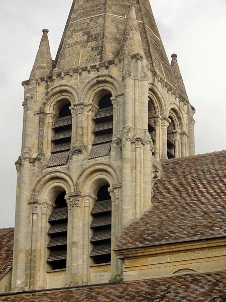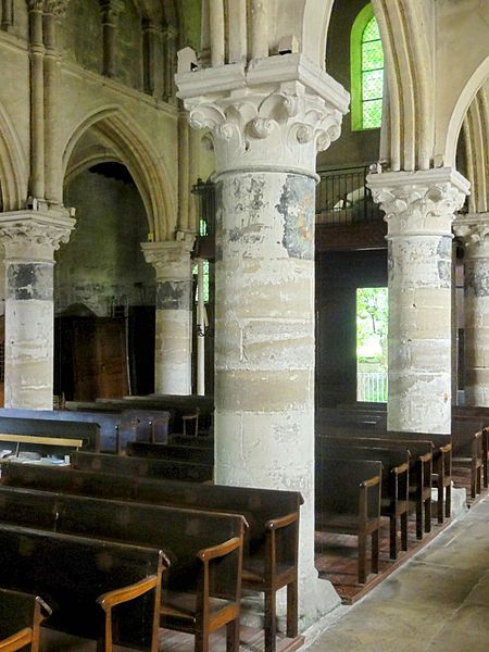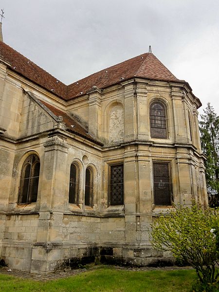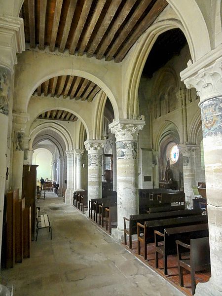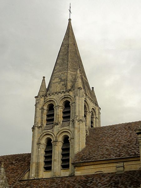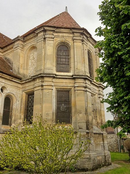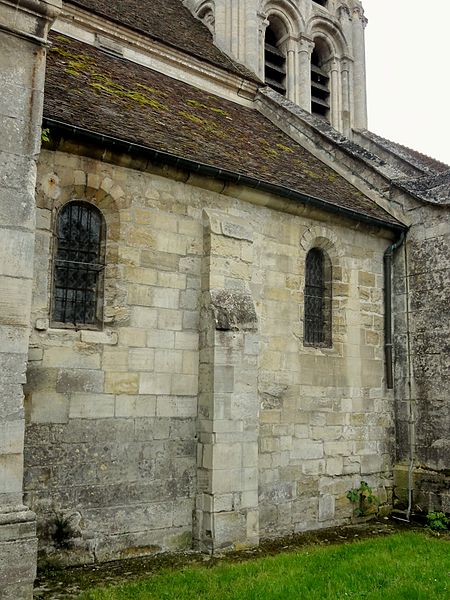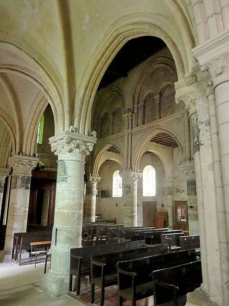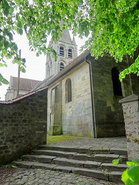 L'église Saint‑Aubin d'Ennery a été édifiée et remaniée entre la fin du XIe siècle et la fin du XVIIIe siècle. La travée sous le clocher est la partie la plus ancienne, datée de la fin du XIe ou du début du XIIe siècle, et le clocher, de deux étages romans coiffés d'une flèche de pierre, appartient au deuxième quart du XIIe siècle. La nef et les bas‑côtés furent construits dans la seconde moitié du XIIe siècle et achevés au XIIIe siècle ; les grandes arcades de la nef constituent un bel exemple du gothique primitif d'Île‑de‑France. La croisée du transept et les piles du clocher conservent des vestiges romans, tandis que des transformations gothiques ont surhaussé et voûté la croisée au XIIe siècle. Au XIIe siècle la nef gothique remplaça l'ancienne travée romane, les bas‑côtés antérieurs furent intégrés et l'élévation fut conçue sans fenêtres hautes ni arcs‑boutants, expliquant l'éclairage réduit de l'intérieur. Vers le milieu du XVIe siècle, une importante reconstruction fut conduite par les maîtres‑maçons Denis et Nicolas Le Mercier : elle porta sur un transept largement saillant, un chœur de deux travées à chevet à pans coupés, une chapelle et une sacristie, ainsi que sur la jonction de ces parties à la base du clocher. Un marché de 1578 atteste leur intervention et la date gravée 1584 sur la frise du chœur permet d'en préciser la chronologie ; l'ensemble Renaissance élevé entre environ 1565 et 1588 se distingue par son homogénéité. La consécration des nouvelles parties eut lieu en 1588, mais faute de moyens la reconstruction totale projetée ne fut pas poursuivie et des éléments anciens furent conservés. Aux XVIIe et XVIIIe siècles la nef se délabra progressivement, la première travée et le bas‑côté nord furent refaits en 1763 dans un style classique et la façade occidentale fut reconstruite au XVIIIe siècle ; des travaux de couverture sont également signalés en 1779. Deux travées de la nef Renaissance furent voûtées et la voûte de la base du clocher restaurée en 1902. L'église réunit donc des éléments romans, du gothique primitif et de la Renaissance, le style flamboyant régional étant peu représenté, et le clocher roman de deux étages est souvent considéré comme un chef‑d'œuvre. Le plan actuel présente une croix de Lorraine avec deux transepts et une nef dont les travées relèvent d'époques différentes, tandis que les bas‑côtés conservent une certaine homogénéité avec une alternance d'oculi et de baies en plein cintre. À l'intérieur, les grandes arcades retombent sur de fortes colonnes aux chapiteaux sculptés, le triforium prend la forme de galeries aveugles et les voûtes subsistantes sont principalement des ogives simples, plusieurs travées restant toutefois plafonnées. Le chœur Renaissance se signale par une frise de quinze bustes en haut‑relief représentant le Christ, les apôtres et les évangélistes Marc et Luc, et par un décor de pilastres et de colonnes superposées enrichi de feuilles d'acanthe. Une chapelle latérale sud conserve des décors polychromes et des fragments de vitraux Renaissance, tandis que d'autres décors ont pu être altérés ou recouverts au fil des restaurations. À l'extérieur, le clocher se distingue par ses deux étages rythmés de colonnettes, archivoltes et modillons, et a inspiré d'autres clochers de la région, alors que la façade occidentale du XVIIIe siècle offre un caractère classique plus sobre. L'église abrite plusieurs éléments de mobilier protégés : l'autel, le retable et le tabernacle, une croix de Passion, des statues de la Vierge et de saint Aubin de différentes époques, ainsi qu'un panneau peint de la Descente de Croix ; elle conserve aussi le cœur d'un grand duc ayant habité à Ennery. L'édifice est classé au titre des monuments historiques depuis 1911.