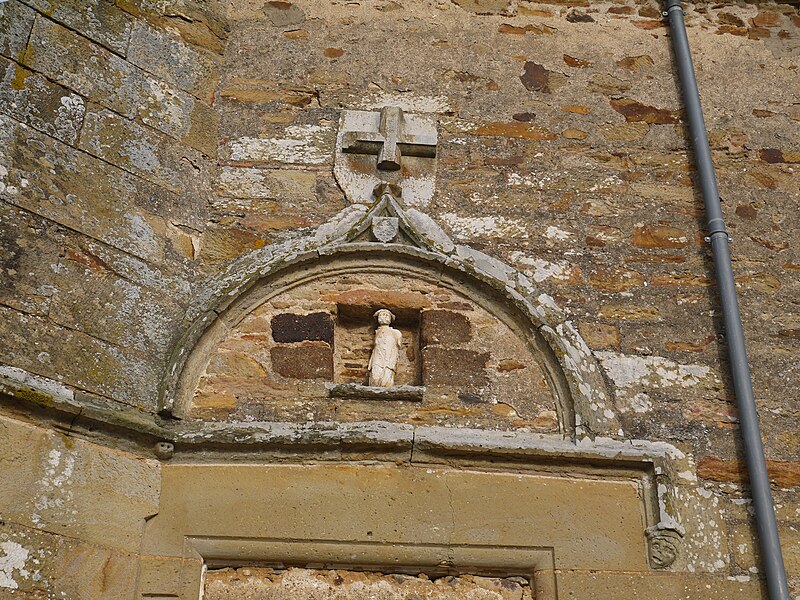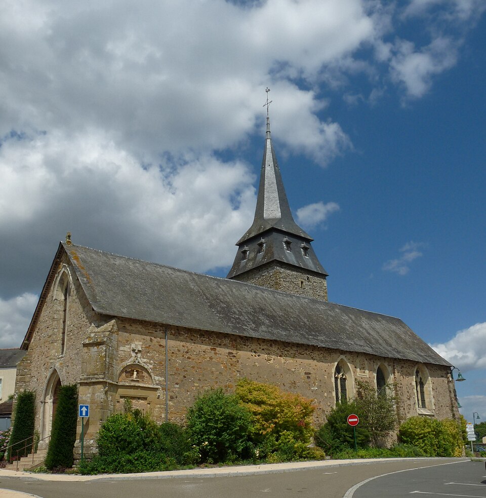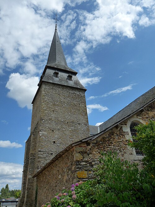 L'église conserve une tour-clocher carrée d'origine romane, contre laquelle fut élevée au XVe siècle une chapelle formant avec la tour un bas-côté de trois travées. Du même siècle datent les fenêtres flamboyantes percées au sud et les contreforts d'angle de la façade. Le pignon occidental présente deux portes ; l'une a été condamnée mais ses contours demeurent visibles ; cette issue était probablement réservée aux femmes, la porte principale étant, probablement, réservée aux hommes.