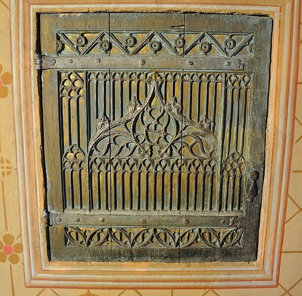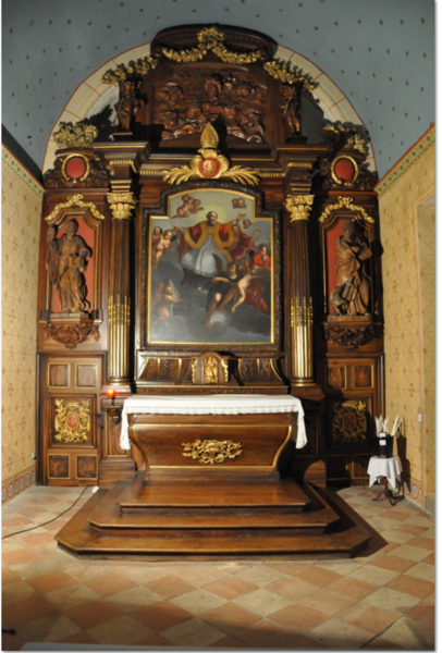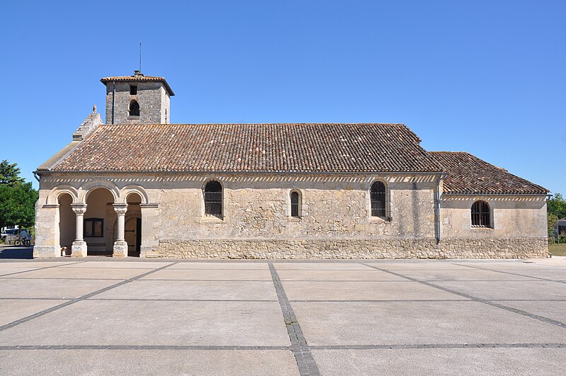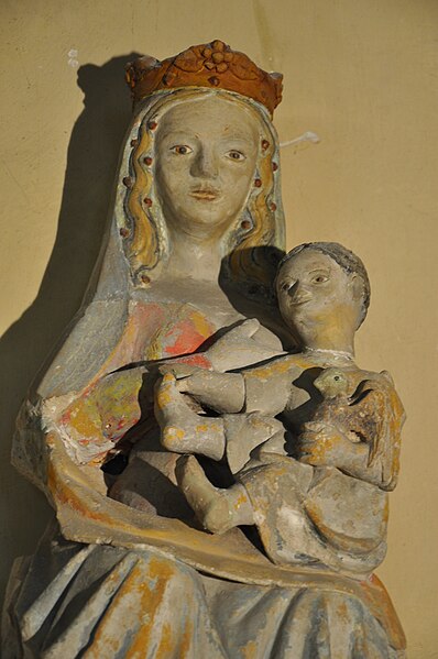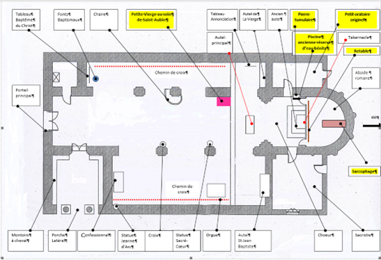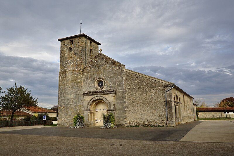 Jusqu'à la Seconde Guerre mondiale, la commune était un lieu de pèlerinage important grâce au sarcophage contenant les restes de saint Aubin, placé derrière le maître-autel. L'édifice date du XIIe siècle mais n'a conservé que l'abside et la base du clocher ; le reste de l'église a été remanié au XIXe siècle, avec des travaux datés de 1867. À l'intérieur, l'installation d'un retable au XVIIIe siècle a divisé le chœur en deux. Le sarcophage, situé à l'arrière, repose sur deux piles dont l'une est enchâssée dans le mur de l'abside. La voûte en berceau de la chapelle latérale porte des peintures du XIVe siècle, réparties en quatre quartiers ; seul le quartier nord-est est identifiable et représente l'Annonciation.