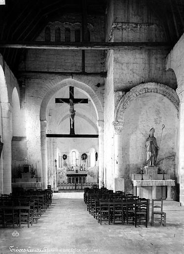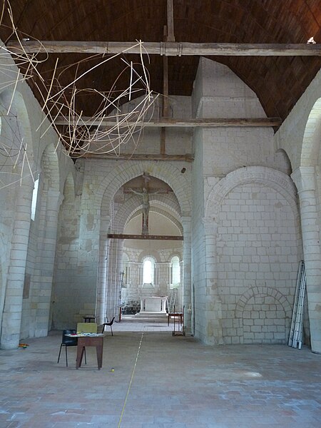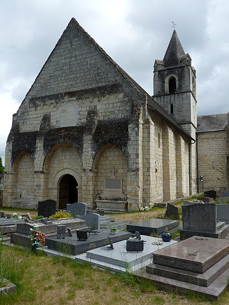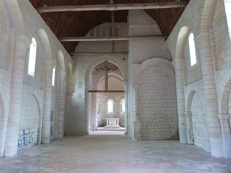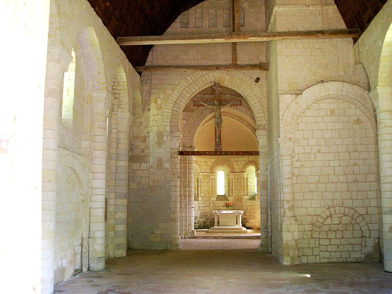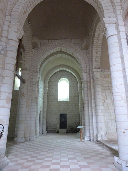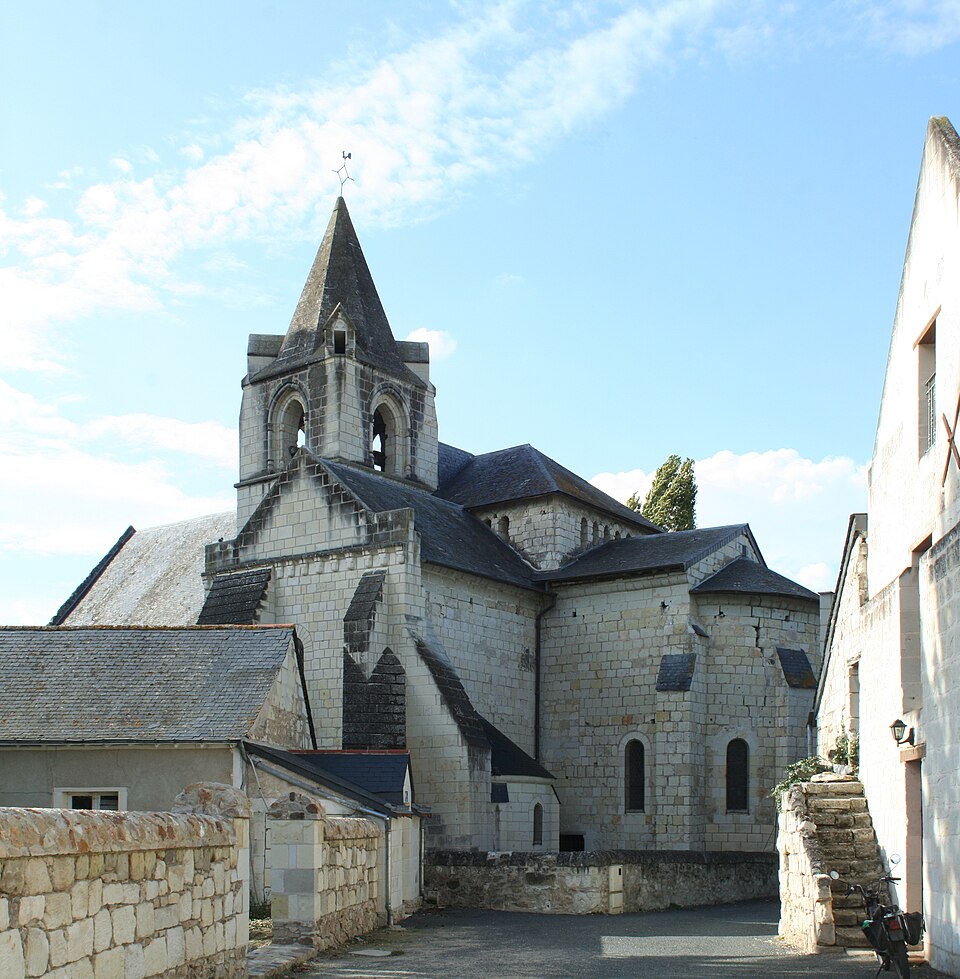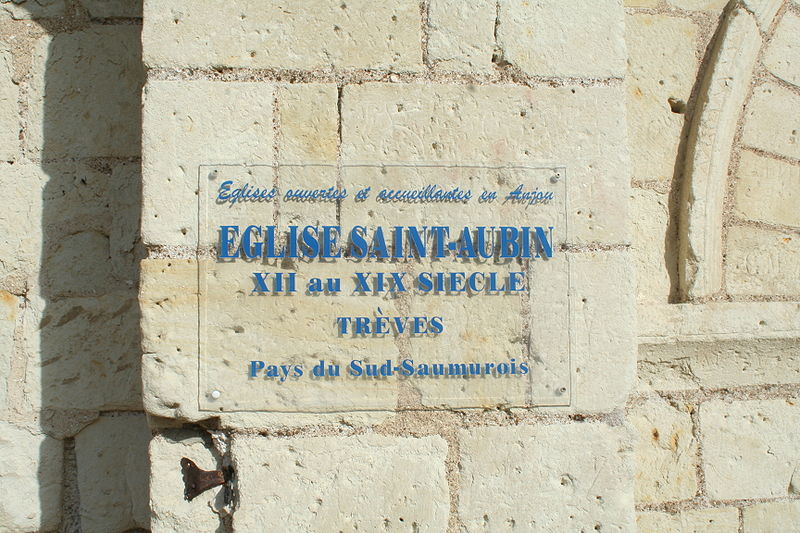 L'église Saint-Aubin de Trèves se trouve sur la commune de Chênehutte-Trèves-Cunault, dans le département de Maine-et-Loire. Le village, d'abord appelé Clementiniacus, appartient dès l'époque carolingienne à l'abbaye Saint-Aubin d'Angers. Les textes indiquent que l'église se situait en 1060 à l'intérieur du château, détruit en 1068 par Foulques le Réchin, qui transfère alors le marché et le port à Cunault et reprend ensuite les lieux en 1091 après avoir reconstruit le château. Avant 1101, le château est inféodé à Geoffroy Foulcrade, qui fait en 1106 un don de terrains à l'abbaye Saint-Aubin pour la construction d'un prieuré : c'est la borne la plus ancienne pour le début des travaux de l'église. Une plaque en ardoise clouée sur le pignon du chœur porte la date 1172, peut-être celle d'achèvement de l'édifice. L'église romane du XIIe siècle se dresse au pied du donjon ; un clocher est ajouté au XIIIe siècle et, au XVe siècle, les murs latéraux sont renforcés tandis que la nef reçoit une voûte en berceau en charpente. La paroisse de Trèves est supprimée en 1809 et rattachée à Cunault ; l'église, alors délaissée, est restaurée entre 1860 et 1865 par Monseigneur Amand-René Maupoint, évêque originaire de Chênehutte. Elle a été endommagée pendant la Seconde Guerre mondiale et a fait l'objet de réparations par la suite. L'édifice abrite le tombeau de Robert Le Maçon, qui avait acquis la baronnie de Trêves en 1416, fut chancelier de France sous Charles VII et protecteur de Jeanne d'Arc ; son épitaphe, gravée dans l'église, rappelle ses titres et porte une inscription mentionnant sa date de trépas. L'église est classée monument historique depuis 1862 ; le tabernacle, surmonté d'une flèche, bénéficie lui aussi d'une protection au titre des monuments historiques. À l'intérieur, l'espace dépouillé a conservé son caractère primitif : la nef unique est rythmée par de grandes arcades en cintre brisé reposant sur des colonnes. À la croisée du transept, une belle voûte sur trompes amorce une tour carrée coiffée d'une toiture en pavillon. La base du clocher, à droite de l'entrée, est percée d'un grand arc en plein cintre selon la manière poitevine qui atténue l'austérité du mur. On note un baptistère en porphyre orné de quatre masques en saillie, dont l'un représente un visage humain à barbe taillée à la romaine, et, près de la croisée, l'ancien tabernacle sous la forme d'une lanterne en pierre blanche de style flamboyant tardif. Au fond du transept droit se trouve le tombeau avec épitaphe et gisant de Robert Le Maçon. L'extérieur présente une façade sobre ornée de trois arcs entre deux contreforts d'angle ; sous l'arcade centrale, la porte en plein cintre est décorée de petites dents de scie. Les murs portent de larges arcades en cintre brisé, ouvertes au XIIIe siècle, qui semblent avoir donné accès à de vastes galeries latérales aujourd'hui détruites, et l'on retrouve les traces de petites fenêtres attribuées au XIe siècle, tandis que les baies visibles datent du XIXe siècle. Le clocher-tour, sobre et massif, est surmonté d'une flèche de tuffeau du XVe siècle cantonnée de quatre lanternons.