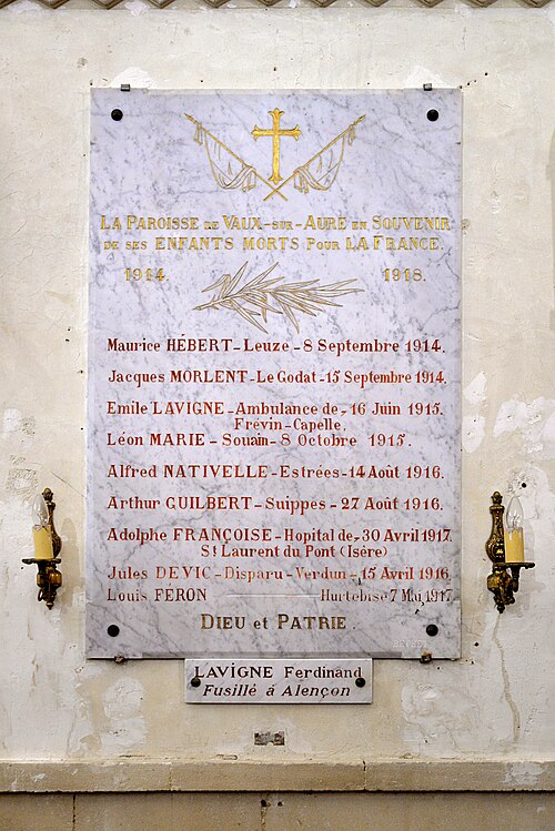 L'église paroissiale Saint-Aubin de Vaux-sur-Aure a été fondée au XIIe siècle. Elle est présentée comme un exemple de reconstruction presque totale dans le style néo-roman réalisée au XIXe siècle. Selon Arcisse de Caumont, une chapelle seigneuriale fut édifiée contre le côté nord du chœur à la fin du XIVe ou au XVe siècle pour la famille Suhard. La tour du clocher, qui porte les armoiries de la famille de Bernières, pourrait dater du XVIe siècle. Les seuls éléments d'époque romane subsistants sont le clocher et le chevet plat du chœur.