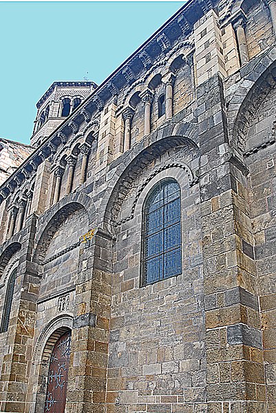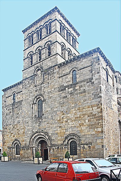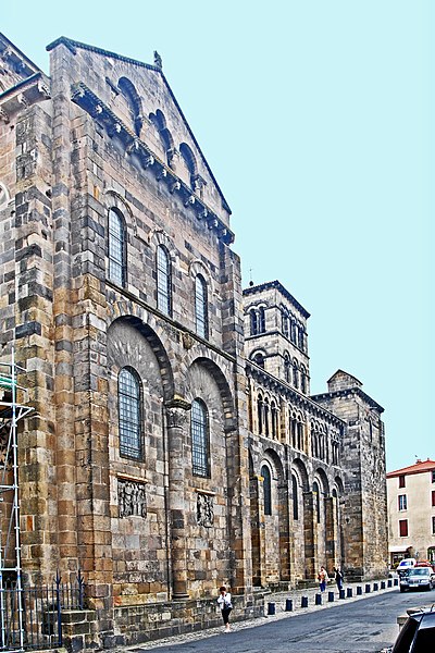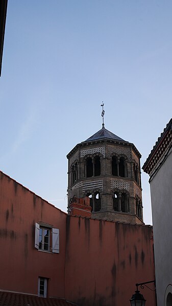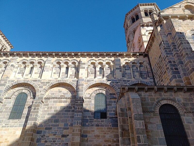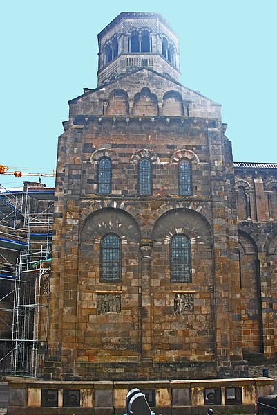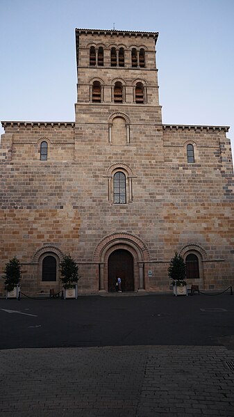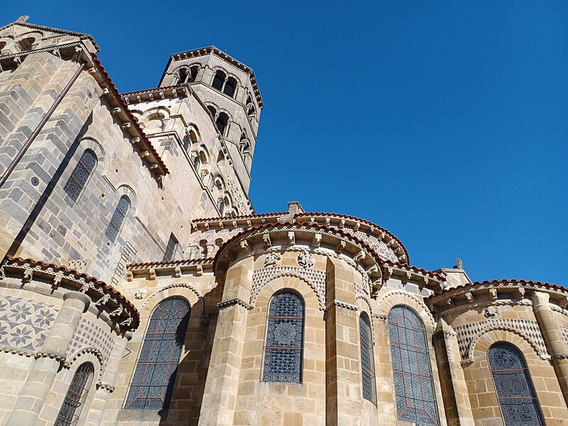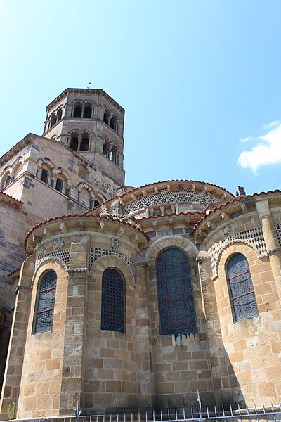 L'abbatiale Saint-Austremoine est un édifice roman auvergnat situé à Issoire, dans le Puy-de-Dôme, en Auvergne-Rhône-Alpes. Elle figure parmi les cinq églises romanes d'Auvergne dites « majeures », aux côtés de la basilique Notre-Dame-du-Port de Clermont-Ferrand, de la basilique Notre-Dame d'Orcival, de l'église de Saint-Nectaire et de l'église Notre-Dame de Saint-Saturnin. Construite au premier tiers du XIIe siècle, vers 1130, elle est une ancienne abbatiale bénédictine dédiée à Austremoine de Clermont, évêque et évangélisateur de l'Auvergne. En 1575, le capitaine Matthieu Merle s'empara d'Issoire ; ayant tenté en vain d'incendier l'abbatiale, il fit écorcher vifs trois religieux. Classée au titre des monuments historiques depuis 1840, elle appartient à la première liste nationale de protection. Les restaurations du XIXe siècle ont restitué sa polychromie intérieure : entre 1857 et 1860 Anatole Dauvergne réalisa ces peintures pour 60 000 francs-or. Un incendie d'origine criminelle s'est déclaré le 3 juillet 2016 ; rapidement maîtrisé, il a causé des dégâts limités à du mobilier et à un tableau. L'édifice, construit en arkose, mesure 69,30 m de longueur extérieure ; la nef intérieure a 16,90 m de largeur, la nef centrale 18,80 m de hauteur et le dôme traversant atteint 23,30 m. Le chevet se distingue par un étagement de volumes croissants comprenant absidioles adossées aux bras du transept, chapelles rayonnantes, chapelle axiale rectangulaire, déambulatoire, chœur, bras du transept, massif barlong et clocher octogonal. Parmi les cinq églises majeures d'Auvergne, Saint-Austremoine possède le chevet le plus imposant du fait de la présence unique d'une chapelle axiale rectangulaire en plus des chapelles rayonnantes. La silhouette verticale tient au massif barlong, parallélépipède allongé qui surmonte la croisée du transept et porte le clocher ; deux toits en appentis renforcent cette élévation. Le chevet est richement décoré et polychrome, notamment par l'emploi de basalte : corniche débordante ornée d'une frise en damier et soutenue par des modillons à copeaux, mosaïques en opus sectile de triangles et de rosaces, et claveaux polychromes. Sous la corniche, les fenêtres du chœur alternent avec des loges rectangulaires abritant trois colonnettes chacune, et les arcs des fenêtres du déambulatoire et des chapelles sont bordés d'un cordon de billettes. Les chapelles rayonnantes et la chapelle axiale présentent des mosaïques géométriques en basalte et des signes du zodiaque ; chaque chapelle est adossée à un pignon surmonté d'un fronton triangulaire et d'une croix de pierre. Les mêmes ornements — claveaux polychromes, cordons de billettes, frises en damier et décor de baguettes — se retrouvent sur le massif barlong, les bras du transept, le clocher et les façades de la nef. Les façades latérales de la nef, comparables à celles de Notre-Dame-du-Port et de Saint-Nectaire, montrent des fenêtres bordées de billettes logées sous de grands arcs de raidissement et surmontées de triplets de baies aveugles. L'intérieur surprend par une polychromie attribuée au XIIIe siècle, restituée au XIXe siècle par Anatole Dauvergne ; ces peintures vives, dominées par un rouge-brun, ont été exécutées à fresque, une technique rare en France et qui a été interprétée comme suggérant des origines méridionales ou italiennes des artisans ; parmi les scènes peintes figure Ève fuyant le jardin d'Éden. Le chœur est entouré de huit colonnes aux chapiteaux historiés qui portent des arcs surhaussés et une seconde rangée de baies. Quatre de ces chapiteaux offrent des scènes narratives consacrées au temps pascal, du Jeudi saint à la Résurrection, tandis que les quatre autres sont sculptés de feuillages. Le chapiteau le plus célèbre représente la Dernière Cène, reconnaissable à la nappe qui enveloppe la corbeille, et se distingue par sa composition et sa qualité artistique. Le cycle iconographique inclut la Flagellation, le Portement de la Croix, la visite des Saintes femmes au tombeau et l'apparition du Christ ressuscité, un programme cohérent autour de l'autel. Les sculptures ne sont pas intactes et ont reçu une peinture vive ; l'historien Swiechowski les attribue à un atelier provençal itinérant. Les vitraux illustrent la vie de sainte Anne, de saint Joseph et de saint Austremoine.