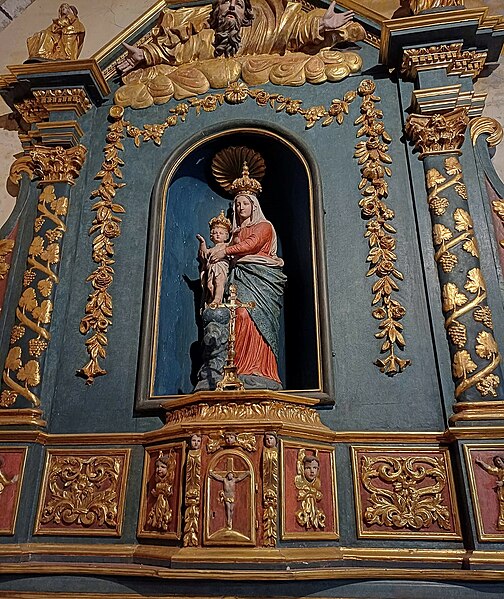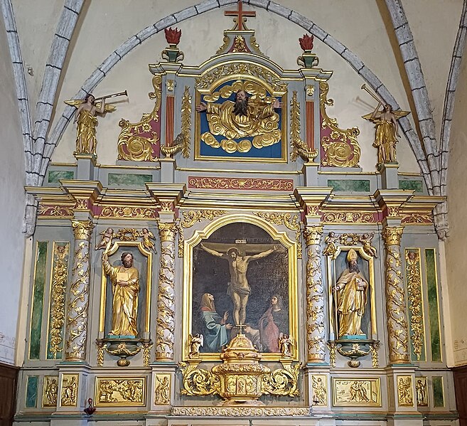 L'intérieur conserve un mobilier remarquable, notamment trois retables baroques en bois polychrome et doré réalisés par l'atelier de Jean Tournié (1647-1721) : le retable du maître-autel, dédié à Dieu le Père, présente une Crucifixion peinte au centre et les statues de saint Barthélemy et de saint Martin de Tours ; le retable de la chapelle Saint‑Jacques (sud) représente saint Jacques pèlerin au centre, encadré par saint Jean à gauche et saint Jude à droite ; le retable de la chapelle de la Vierge (nord) associe une statue de la Vierge à l'Enfant sous la représentation de Dieu le Père, flanquée des statuettes de sainte Anne et de saint Joachim. Un tableau intitulé Les Saintes Femmes, réalisé en 1863 par Armand Félix Marie Jobbé‑Duval, a été déposé dans le chœur.