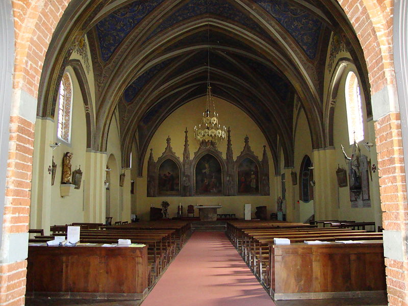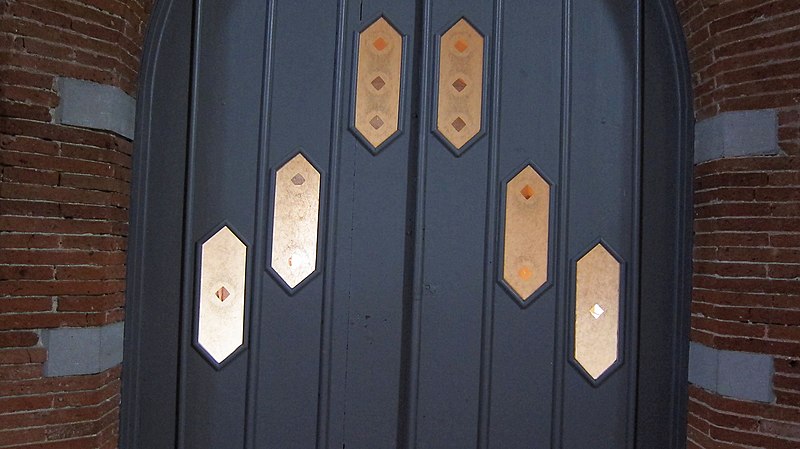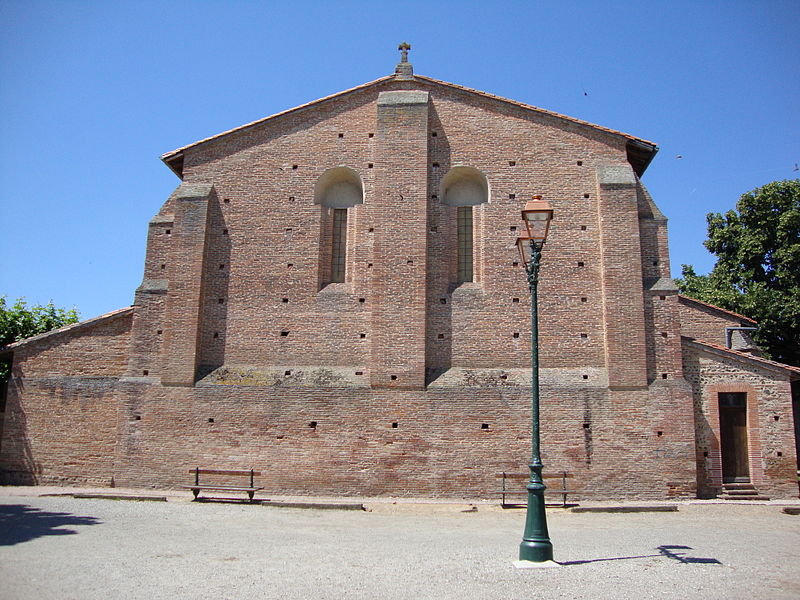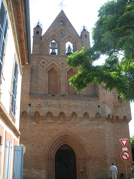 La façade occidentale s'ouvre par un portail en tiers-point dont l'archivolte est formée de cinq voussures toriques en briques moulurées reposant sur des culots en pierre. Au-dessus, des arcatures en briques, portées par des consoles, soutiennent deux constructions élevées de défense qui se rattachent au centre au clocher pignon, lui-même prolongement du mur de façade. Le clocher se compose de deux étages : le premier offre deux baies jumelles à arc central, bordées à la naissance des arcs d'un oculus en losange; au-dessus, un cordon en briques imite les bandes en dents d'engrenage des clochers toulousains. Le deuxième étage comporte une fenêtre toulousaine et le clocher est flanqué de deux tourelles carrées.
