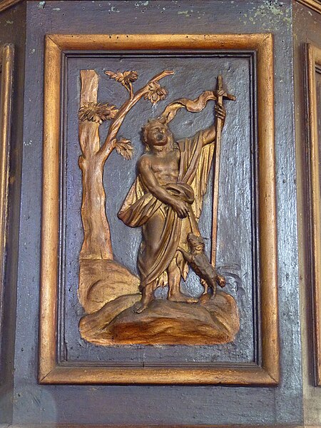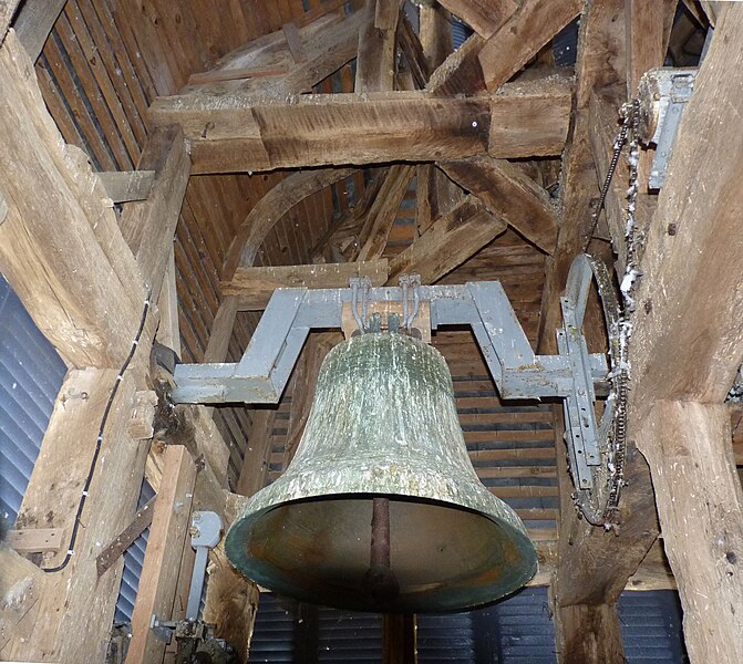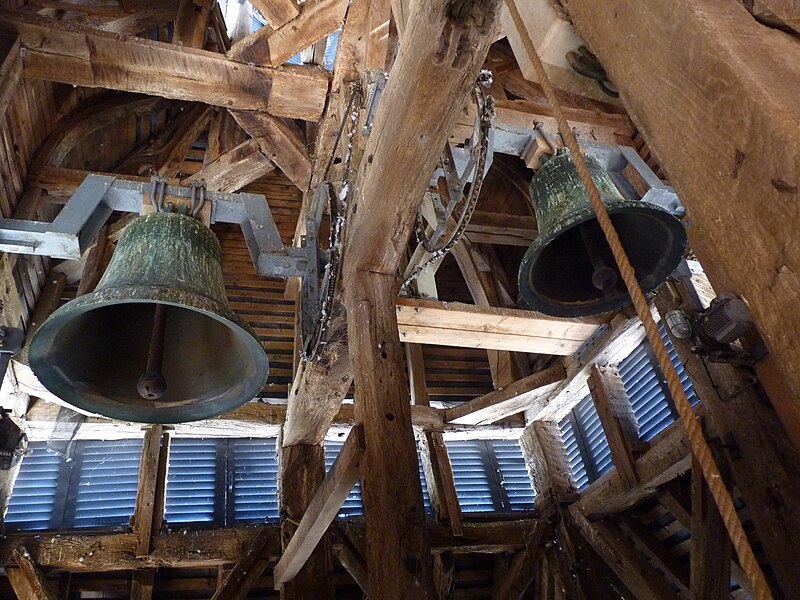 La documentation photographique présente les façades nord et sud, la bretèche de la tour, la nef, le maître-autel et ses détails, la peinture murale de Duvigneau, les vitraux signés G.P. Dragrant, la sculpture de saint Roch, les cloches et la charpente du bulbe, l'orgue Debierre et la clef de voûte portant l'inscription ancienne.