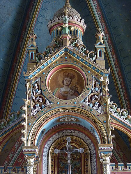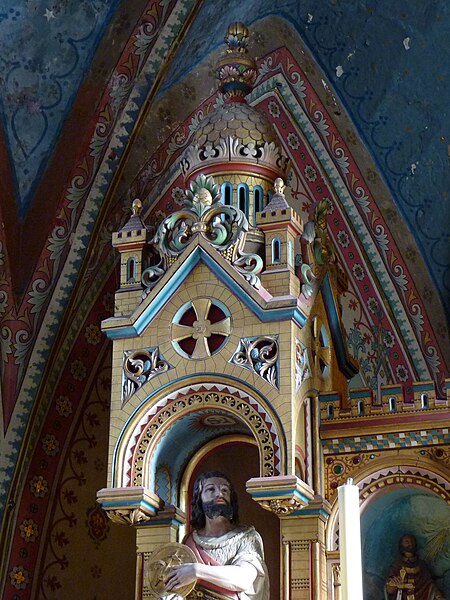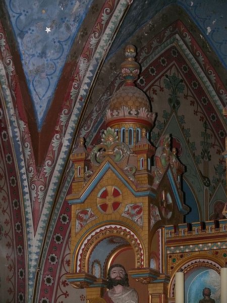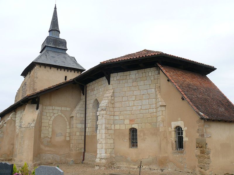 La tour-clocher, coiffée d'un bulbe de style oriental, est recouverte d'ardoises et de zinc ; ses murs sont renforcés par de puissants contreforts et ponctués d'une bretèche. Au rez-de-chaussée de la tour, un escalier en bois mène à la charpente du bulbe où sont installées deux cloches. La nef est charpentée et le chevet est à pans.