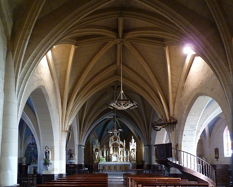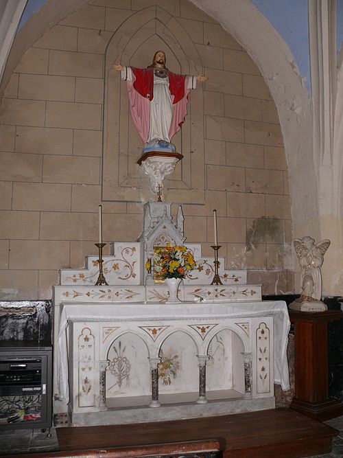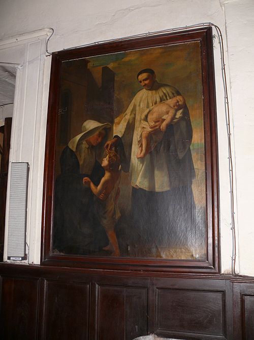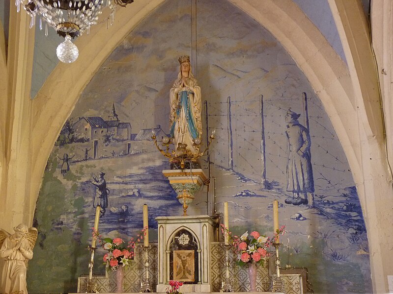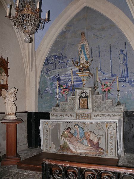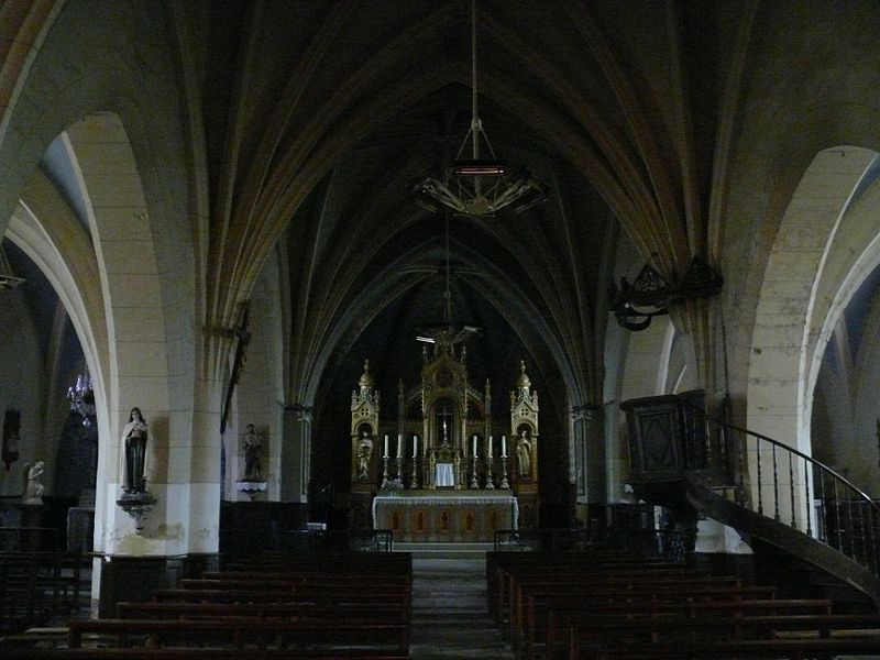 L'intérieur conserve plusieurs œuvres et mobilier remarquables. Un tableau du XIXe siècle représente saint Vincent de Paul apportant des enfants à une sœur de la Charité ; cette toile est protégée au titre des objets depuis le 19 mai 1983. La chaire porte une sculpture datée de 1828 représentant saint Roch avec un chien. Derrière l'autel de la Vierge figure une peinture murale de Duvigneau, décorateur diplômé de l'École de Peinture de Bruxelles, représentant des prisonniers revenant de leur captivité ; cette œuvre, qui retrace un épisode local concernant quarante-deux prisonniers de guerre, a été inaugurée le 8 mai 1946. L'église possède des vitraux réalisés en 1907 et signés G.P. Dragrant, maître-verrier dont certaines réalisations ont aussi été protégées par les Monuments historiques.