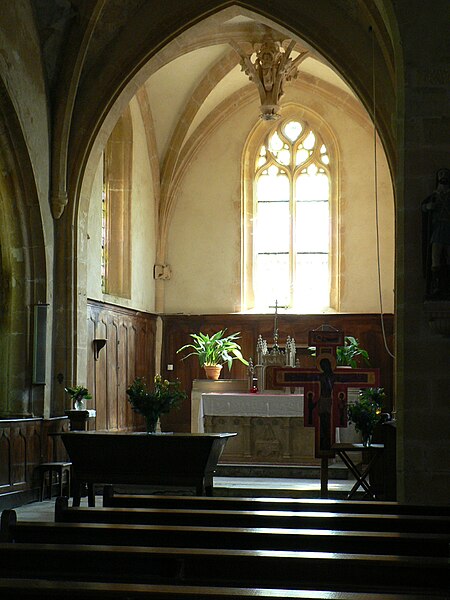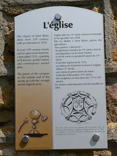 L'église Saint-Blaise-Saint-Roch, située à Bagnols dans le département du Rhône, est placée sous le patronage principal de saint Blaise, avec saint Roch comme patron secondaire. Elle a été édifiée à la fin de la guerre de Cent Ans, entre 1453 et 1473, et l'édifice visible aujourd'hui résulte principalement de campagnes de travaux menées aux XVe et XVIe siècles. Le clocher a été remonté en 1735. Une reconstruction partielle en 1840 et un agrandissement en 1850, qui comprirent l'ajout d'une partie de la nef et d'une sacristie, ont modifié l'orientation de l'église. Le chœur, daté du XVIe siècle, conserve plusieurs éléments de cette époque, notamment une clé pendante et un bénitier daté de 1535. Des peintures murales tard médiévales, dont une Transfiguration sur le mont Thabor, ornent les voûtes et les tympans de la croisée du transept ; ces décors ont été mis au jour par Jean-Gabriel Mortamet lors des restaurations de 1978. Le chœur a été inscrit au titre des monuments historiques en 1978 et la protection a été étendue à l'ensemble de l'église par un arrêté de janvier 2021. Des vitraux contemporains ont été installés en 2001. L'intérieur abrite un important ensemble d'objets protégés : parmi eux, le bénitier, le maître-autel accompagné de son antependium, la croix d'autel, des chandeliers et des anges céroféraires. On compte également un retable et un tabernacle dans le bas-côté méridional, ainsi que du matériel liturgique comprenant un ostensoir, un tabernacle et un reliquaire. Un groupe sculpté du XVe siècle représente sainte Catherine d'Alexandrie et une dizaine d'autres statues, pour la plupart en bois polychrome du XVIIe siècle, figurent saint Blaise, saint Laurent, la Vierge de l'Annonciation, la Vierge à l'Enfant, saint Jean-Baptiste, saint Julien et le Christ en croix. Un tableau représentant saint Jérôme écrivant la Vulgate complète cet inventaire mobilier.