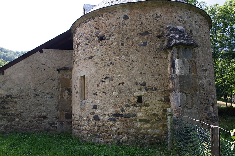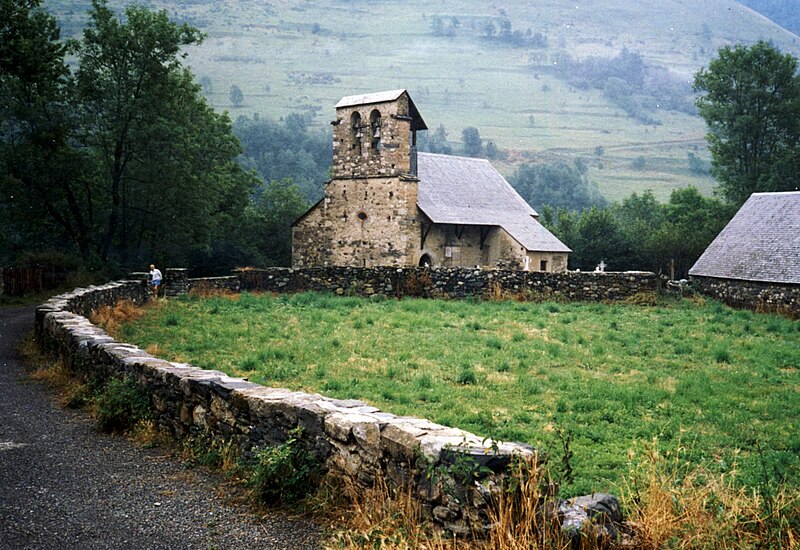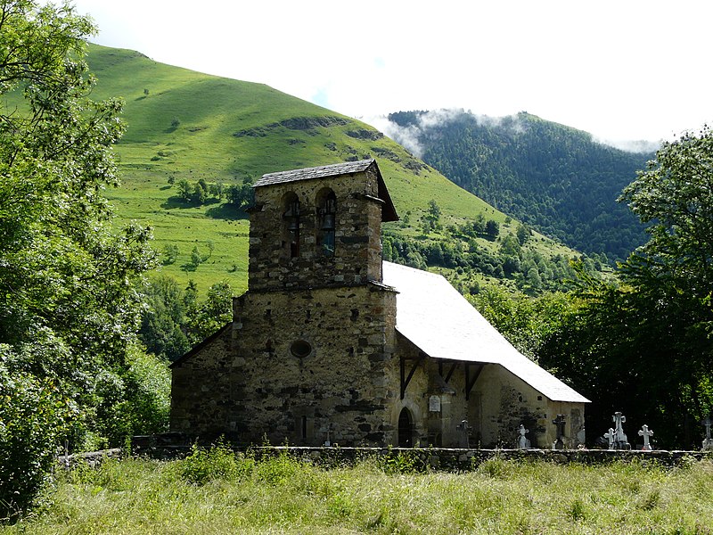L'église conserve le plan et le volume extérieur caractéristiques des édifices pyrénéens : un rectangle orienté est-sud-est / ouest-nord-ouest, prolongé au chevet par une abside semi-circulaire et bordé à l'ouest par un clocher-mur à deux arcades. La nef unique est voûtée en berceau brisé et le chevet est couvert en cul-de-four; deux annexes de plan presque carré se greffent au corps principal, la chapelle au nord et la sacristie au sud. L'ensemble est entouré d'un petit cimetière.