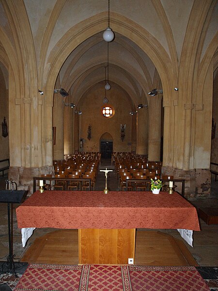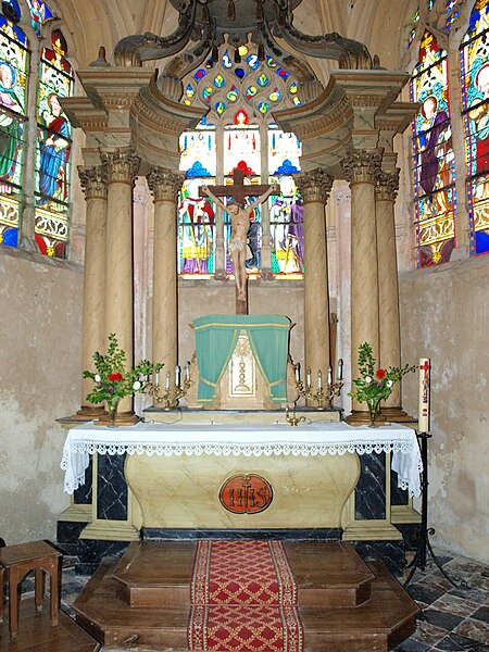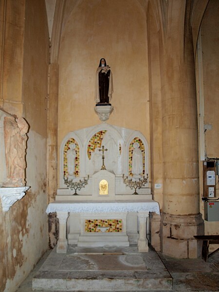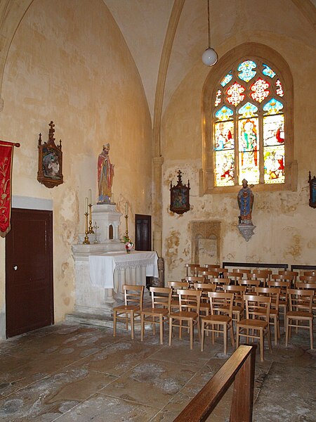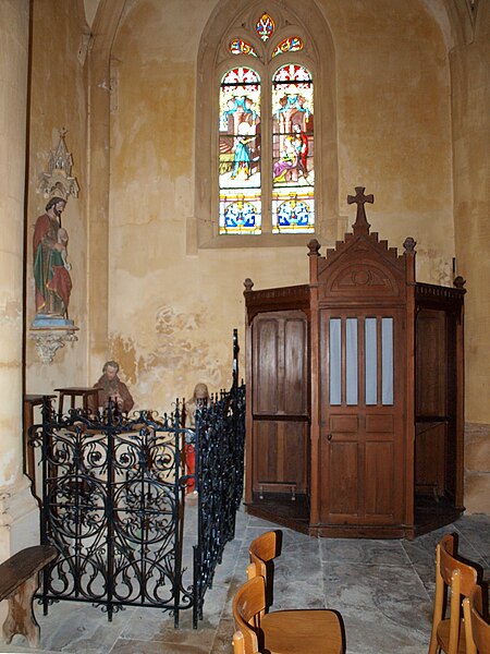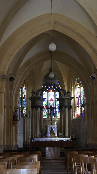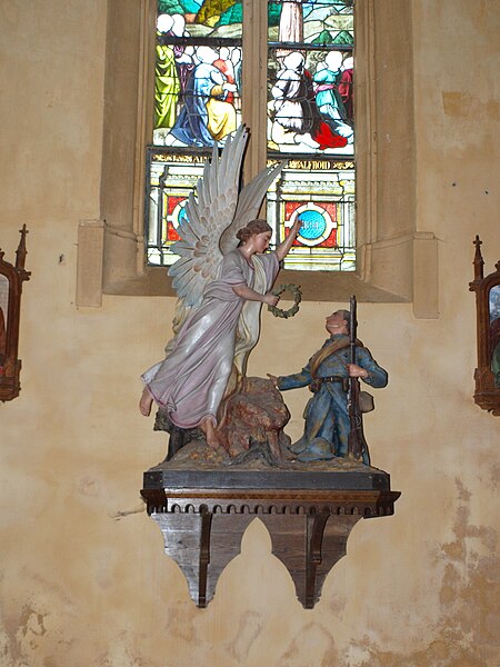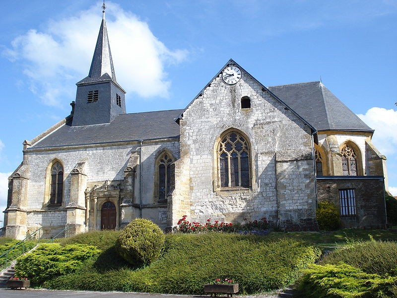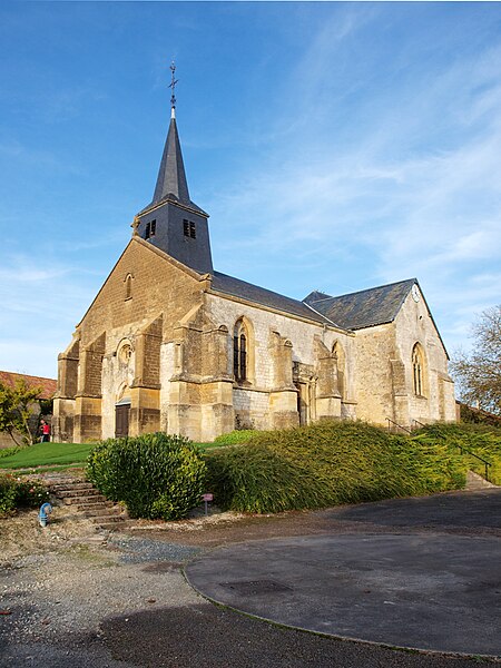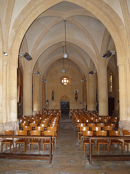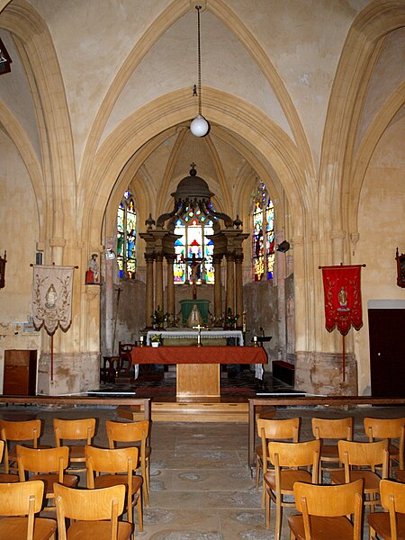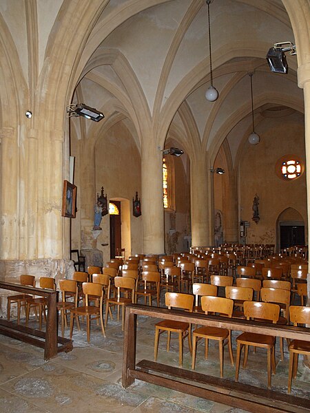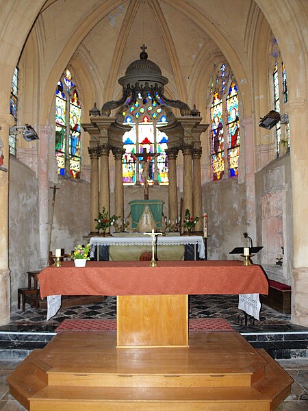 À l'intérieur, on note une piscine du XVe siècle ornée de fleurons et de têtes sculptées ainsi qu'une seconde piscine à droite du maître-autel ; des fenêtres plus simples éclairent chaque extrémité du croisillon. Le mobilier comprend notamment une statue en bois du Christ aux liens du XVIe siècle, une statue en pierre de saint Nicaise, évêque céphalophore, un maître-autel en bois du XVIIIe siècle à six colonnes corinthiennes et un lavabo de style flamboyant placé dans le chœur. On relève enfin, parmi les éléments remarquables, le portail occidental, le portail sud, un vitrail nord daté de 1898 et le monument aux morts.
