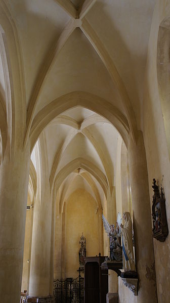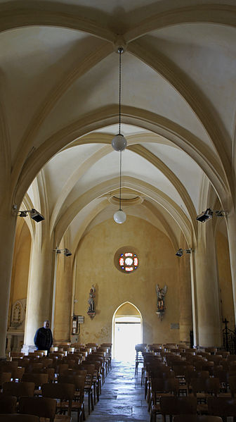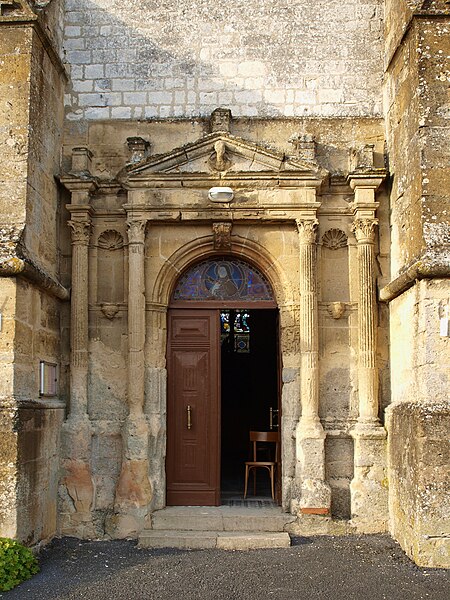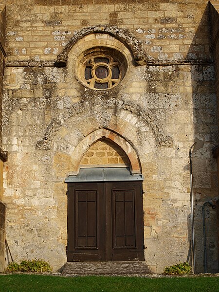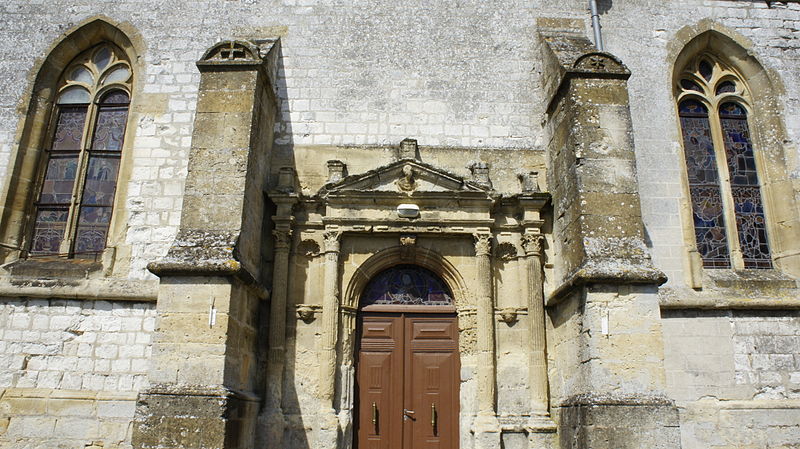 Le plan est en croix latine et le clocher s'élève au-dessus de la première travée de la nef. Le portail occidental, de style roman, s'ouvre dans un large pignon soutenu par quatre contreforts et est surmonté d'une rosace ; il paraît être un vestige d'une église antérieure, peut-être antérieur au XIIe siècle, et présente un arc brisé en double rouleau avec une archivolte à billettes. La nef comporte trois travées flanquées de bas-côtés dont les fenêtres datent de la fin du XVIe siècle ; le plafond est voûté en croisées d'ogives. Les arcs des voûtes et les doubleaux retombent en pénétration sur des piles cylindriques, conférant une belle unité à l'ensemble. Le chœur, à cinq pans, est orné de chapiteaux sculptés de ronces et de rinceaux. Le portail sud, de style Renaissance, s'organise autour de quatre colonnes corinthiennes élancées qui soutiennent une corniche et un fronton triangulaire. L'abside, également à cinq pans, est percée de grandes fenêtres ogivales de style flamboyant à double meneau.